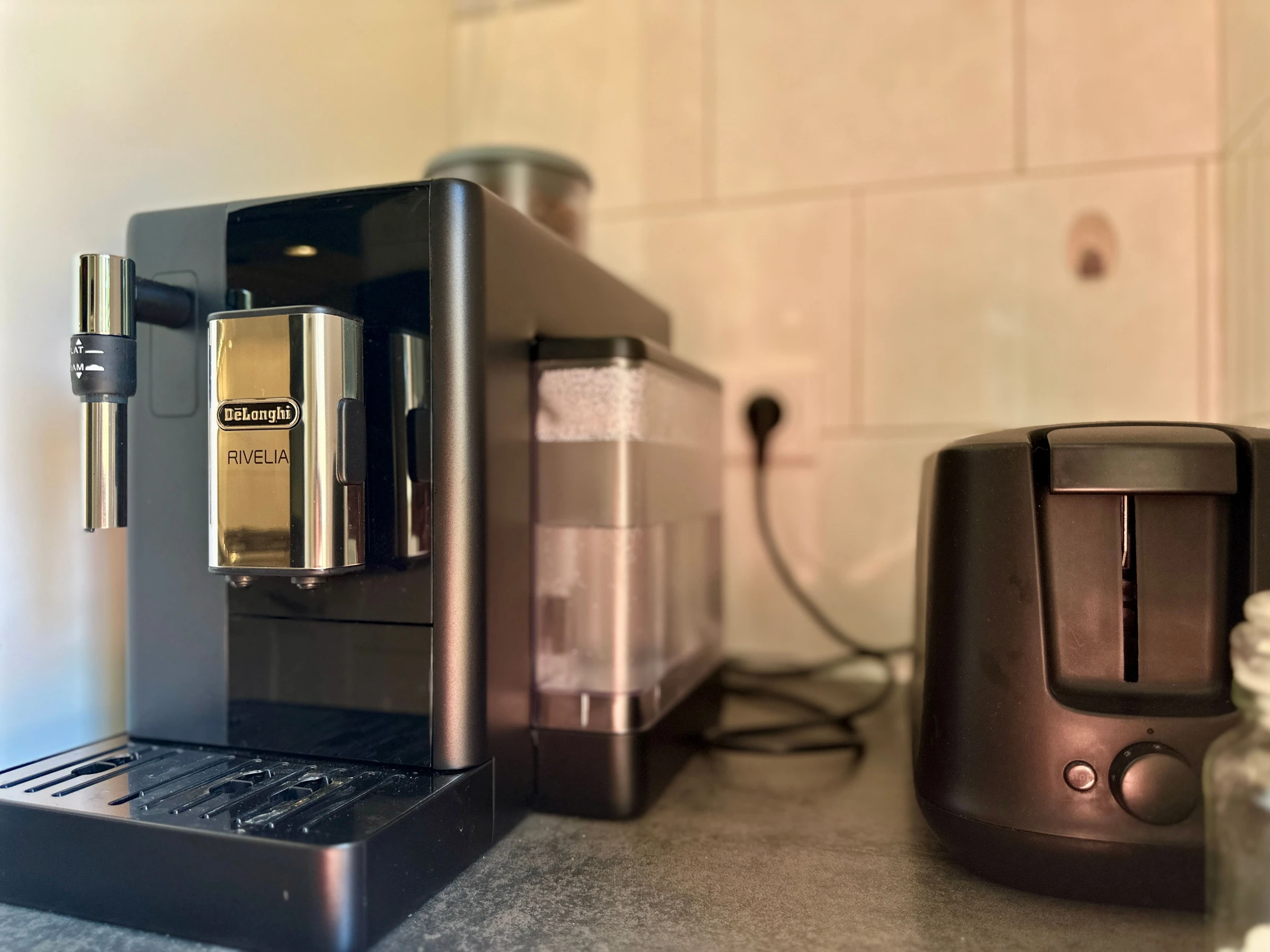 The kitchen is separate and fully equipped (fridge-freezer, oven, microwave, stovetop, small appliances). There is a coffee bean machine. Adjoining the kitchen is a laundry area with a washing machine and dishwasher.