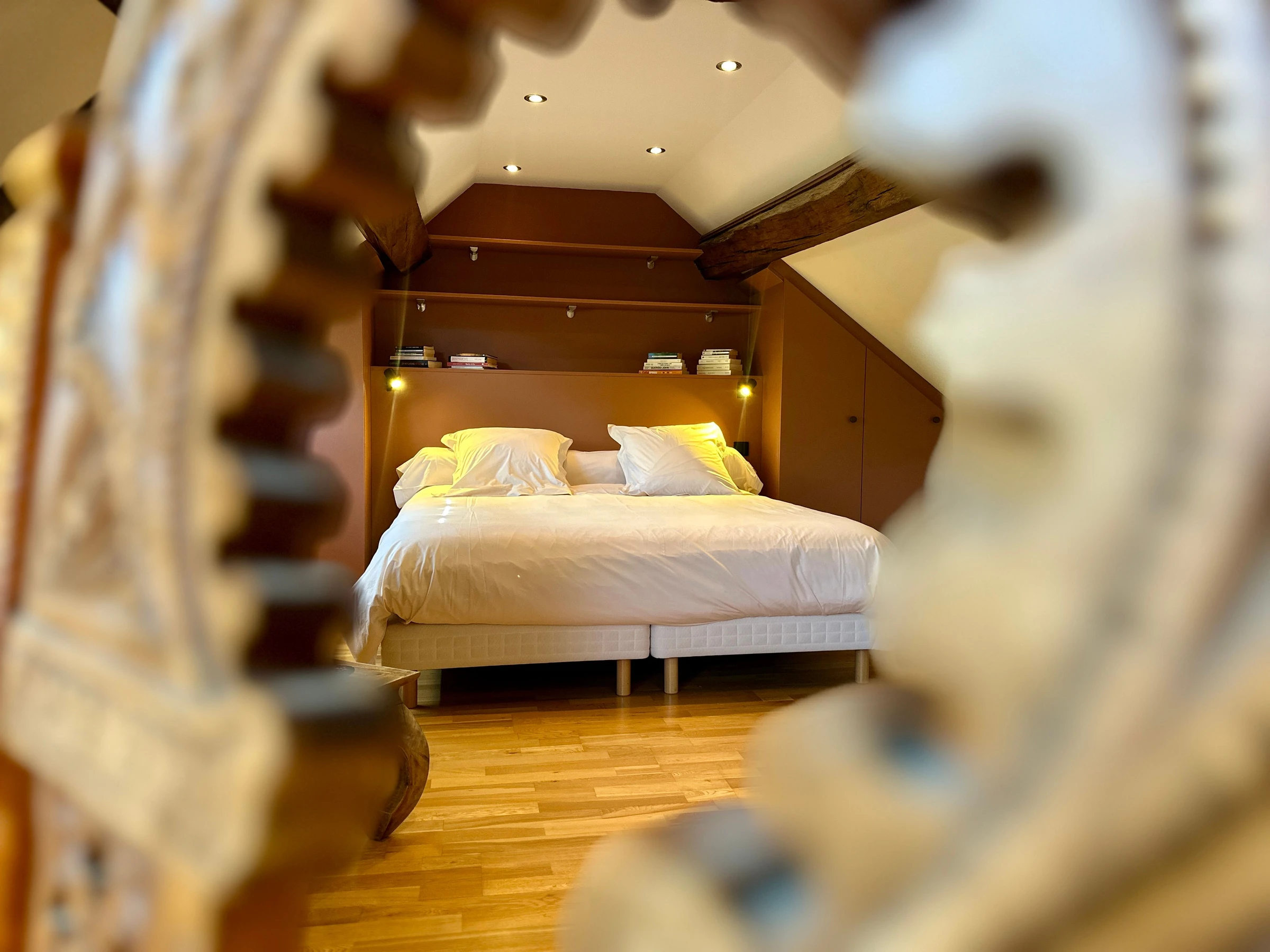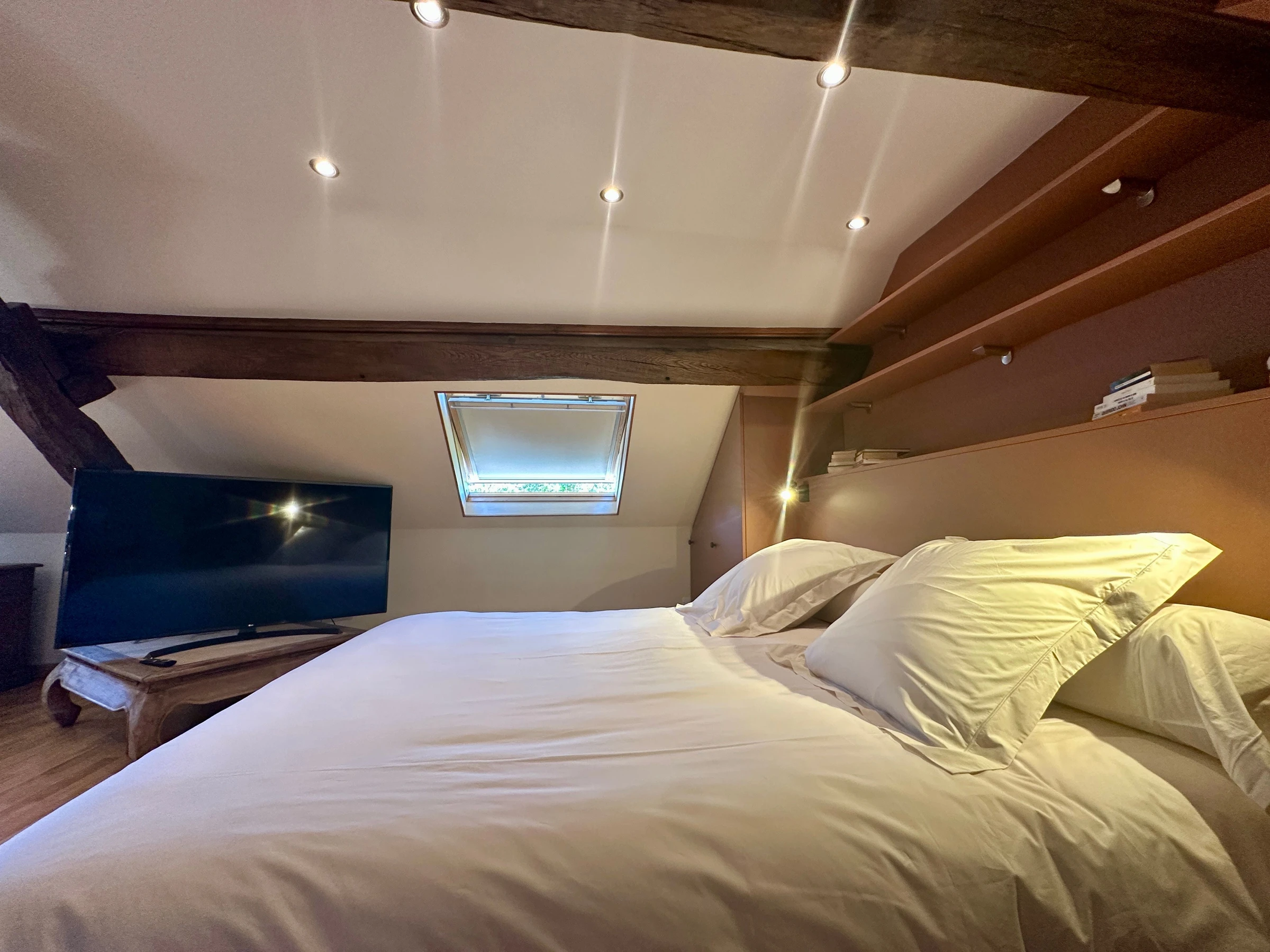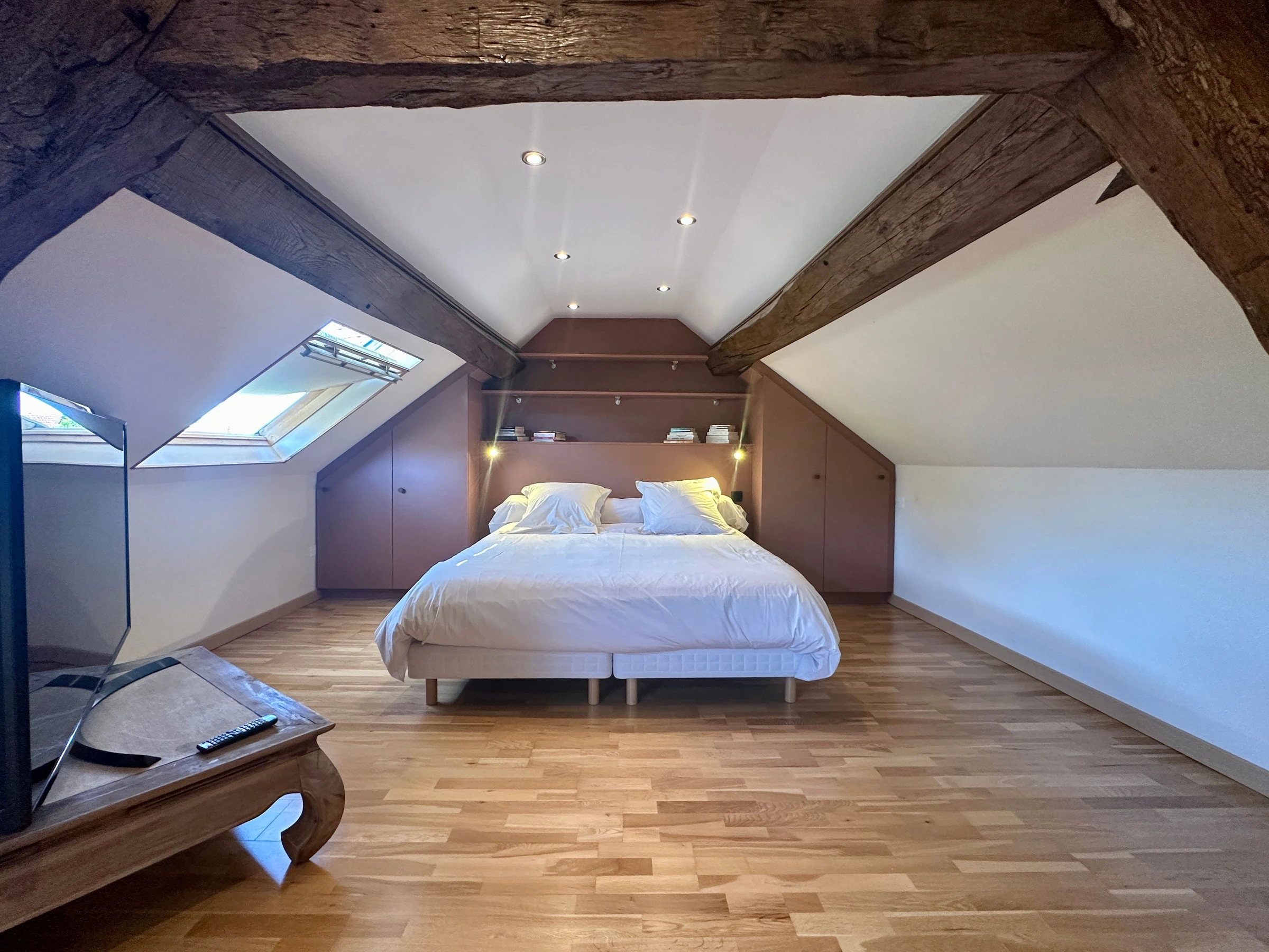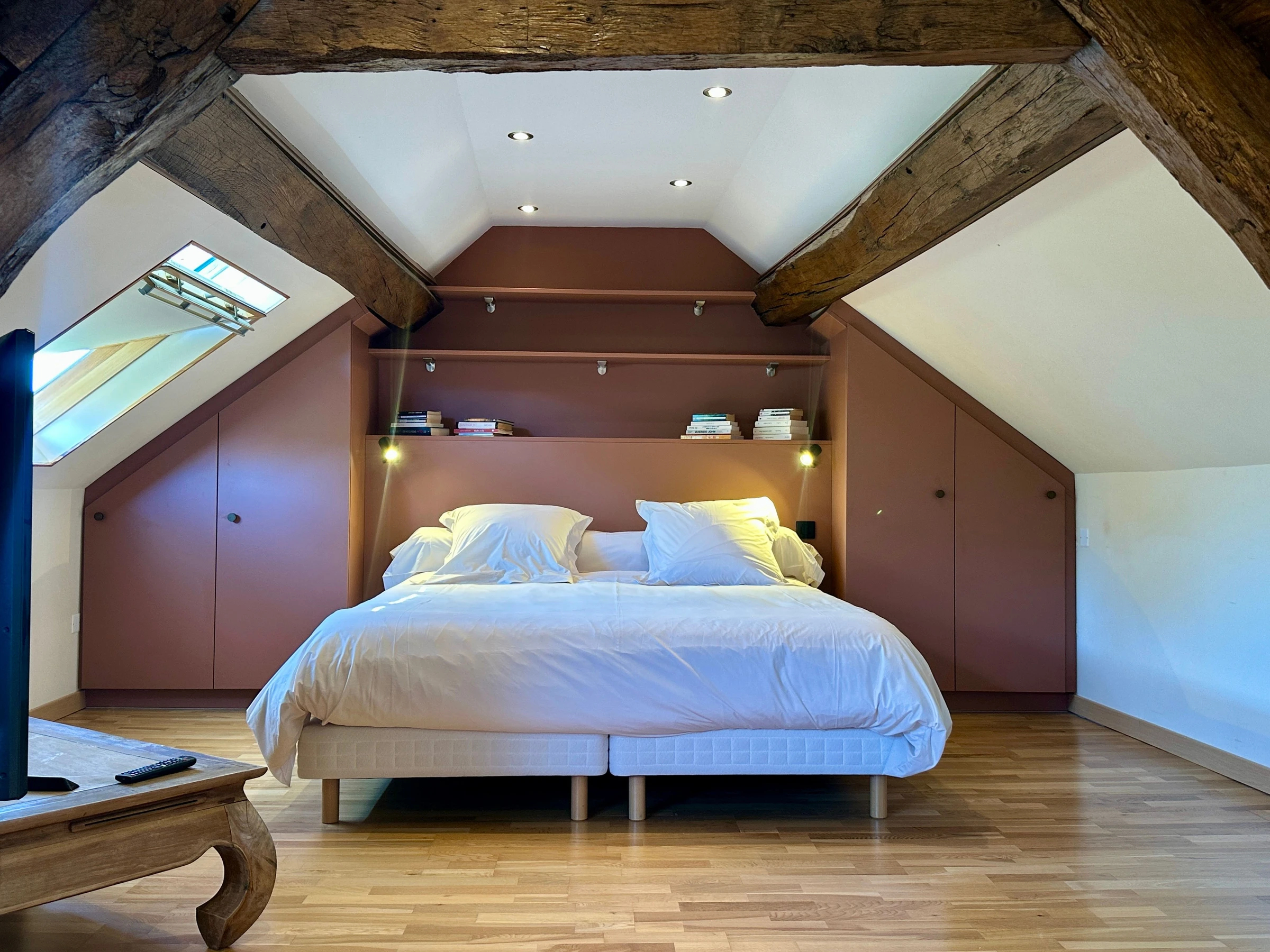 Upstairs, two bedrooms are available, one with a 140x200cm bed, the other with two 90x200cm mattresses forming a king-size bed. They feature a flat-screen TV (NETFLIX subscription), a minibar, a courtesy tray, and a walk-in closet. There is a shower room with a toilet.