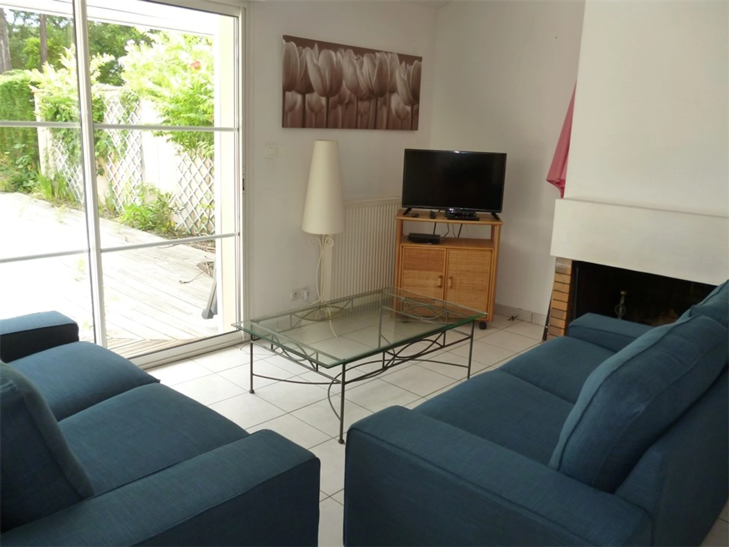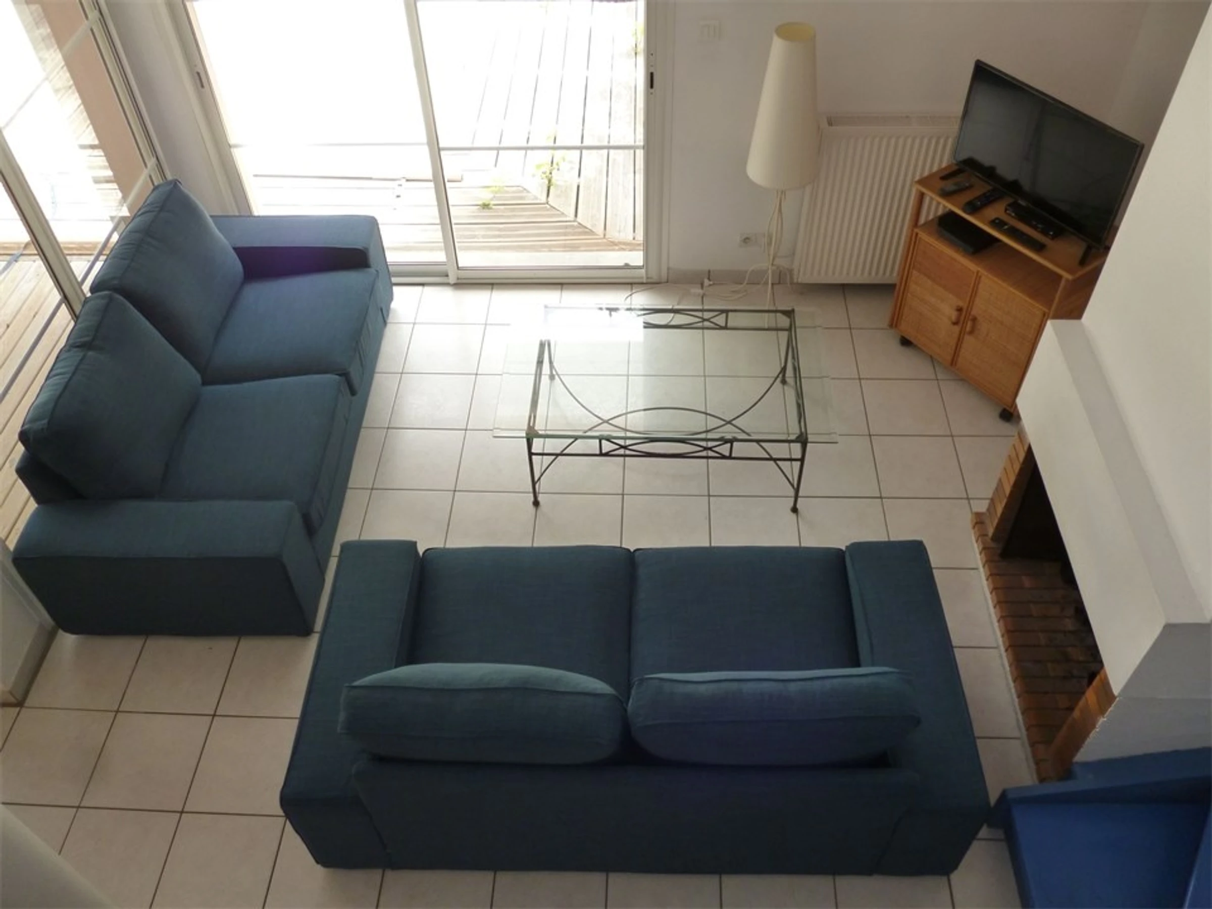 -Living room with sofa, coffee table, dresser, glass doors leading to wooden terrace