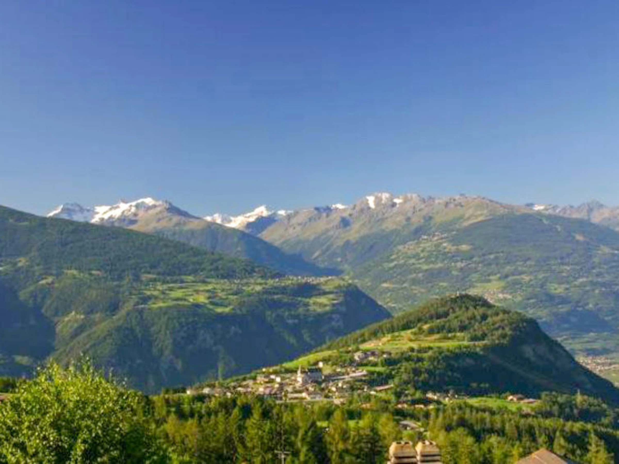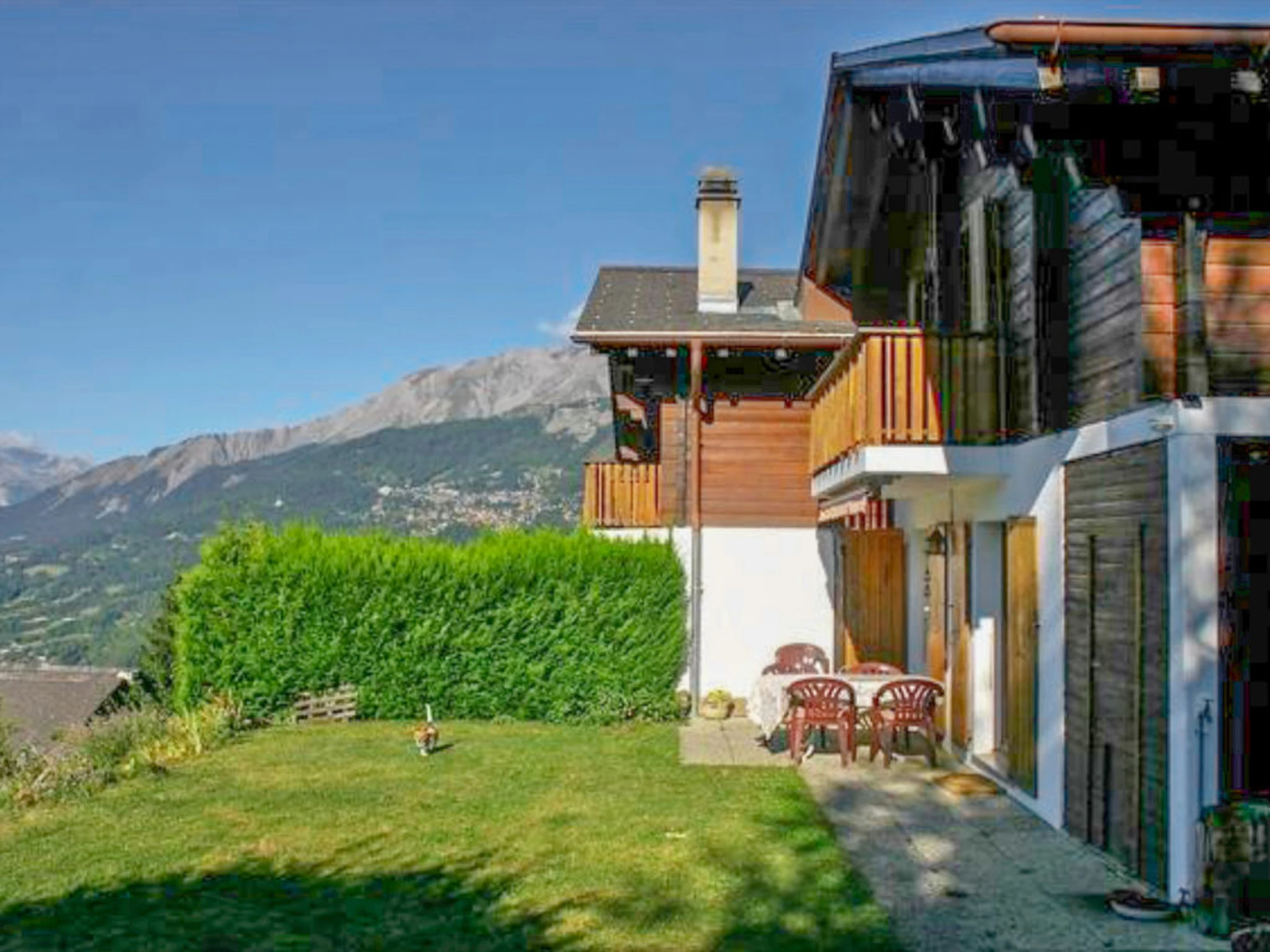 "Praline", 4-room chalet 100 m2 on 2 levels. Simple furnishings: living/dining room with open-hearth fireplace, cable TV, flat screen, video and DVD. Exit to the terrace, south facing position. Small kitchen (4 hot plates, oven, dishwasher, microwave, electric coffee machine, fondue Set (cheese)). Sep. WC. Electric heating. Upper floor: 1 room with sloping ceilings with 1 french bed (160 cm, length 200 cm). Exit to the balcony, south facing position. 1 children's room with sloping ceilings with 1 x 2 bunk beds (90 cm, length 200 cm). Exit to the balcony, south facing position. 1 room with sloping ceilings with 1 bed (90 cm, length 200 cm). Bath/bidet/WC. Parquet floors. Large terrace, south facing position, lawn 130 m2. Terrace furniture, barbecue, box-room. Marvellous panoramic view of the mountains and the valley. Facilities: washing machine, baby cot for up to 3 year olds, hair dryer. Internet (Dial up/ISDN, free). Garage space n 7 at 100 m, height 200 cm. Please note: non-smokers only. 1 pet/ dog allowed. Folding baby bed without sheets and blankets. Included: Pet, ERV assurance annulation gratuite Available on site with supplement: Highchair 4.39EUR per day, Cot (up to 2 years) 4.39EUR per day, Baby Buggy 4.39EUR per day Mandatory extra services on site: Local tax 3.0EUR per person/day, Local tax children (6-16) 1.5EUR per person/day, Final cleaning 38.0EUR per person, Local tax babies (0-2) (per person/day), Local tax children (6-16) 1.25EUR per person/day, Local tax 2.5EUR per person/day, Local tax children (3-5) (per person/day), Laundry (initial supply of bed linen and towels) 30.0EUR per person