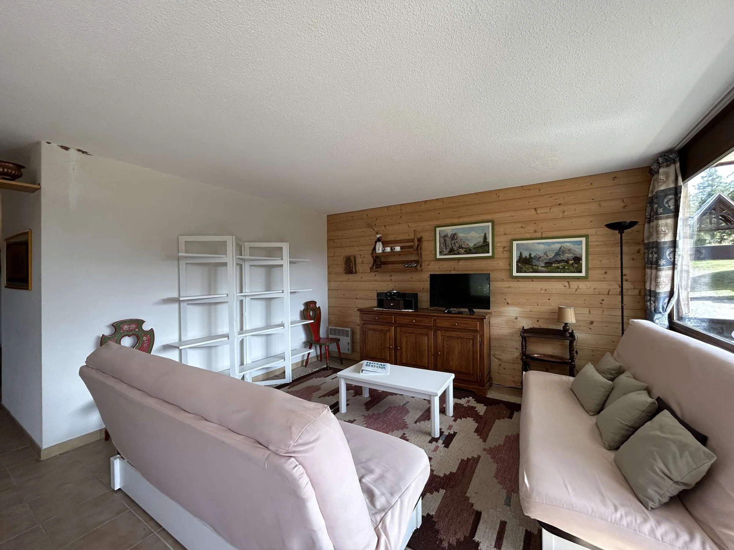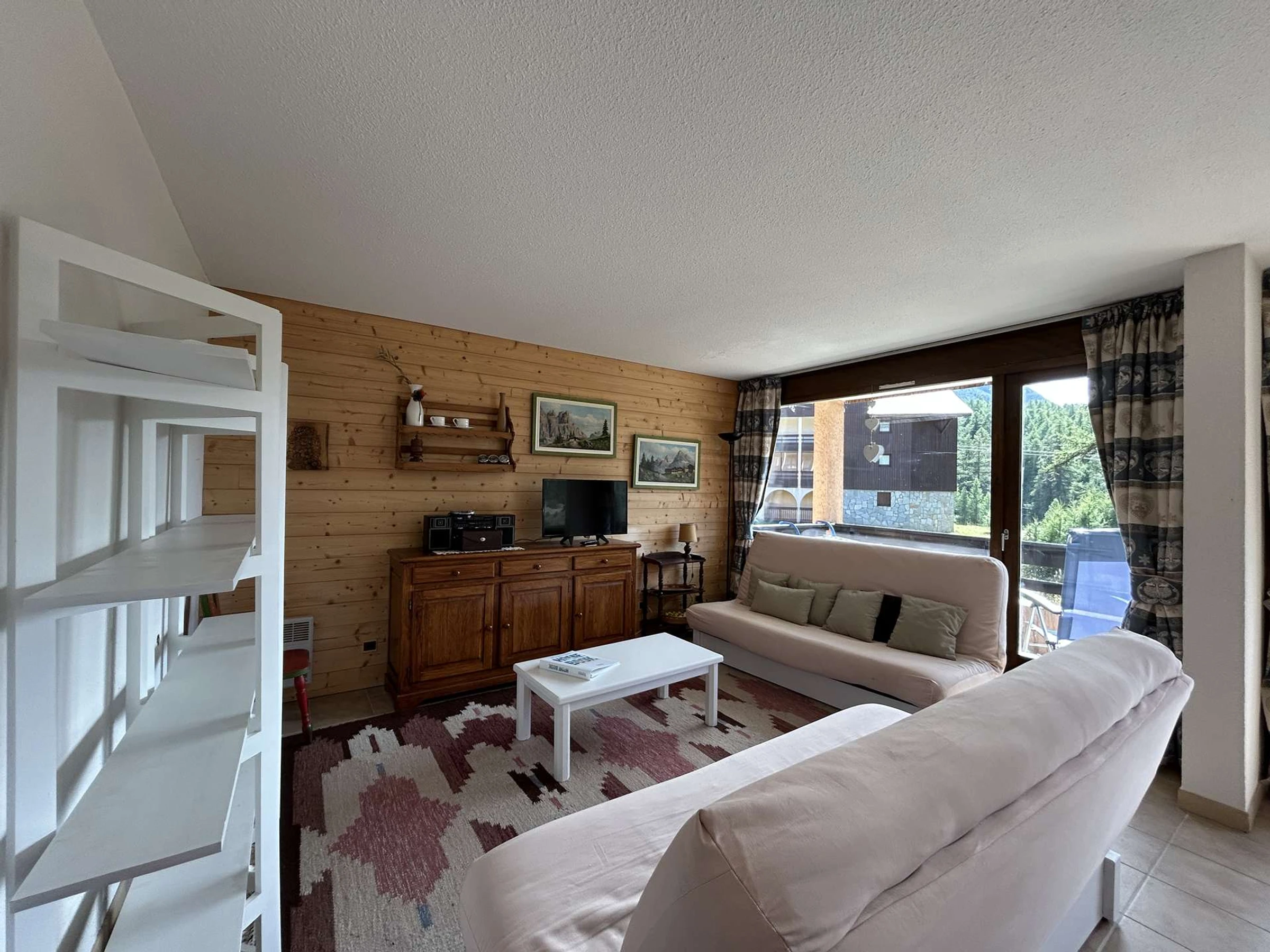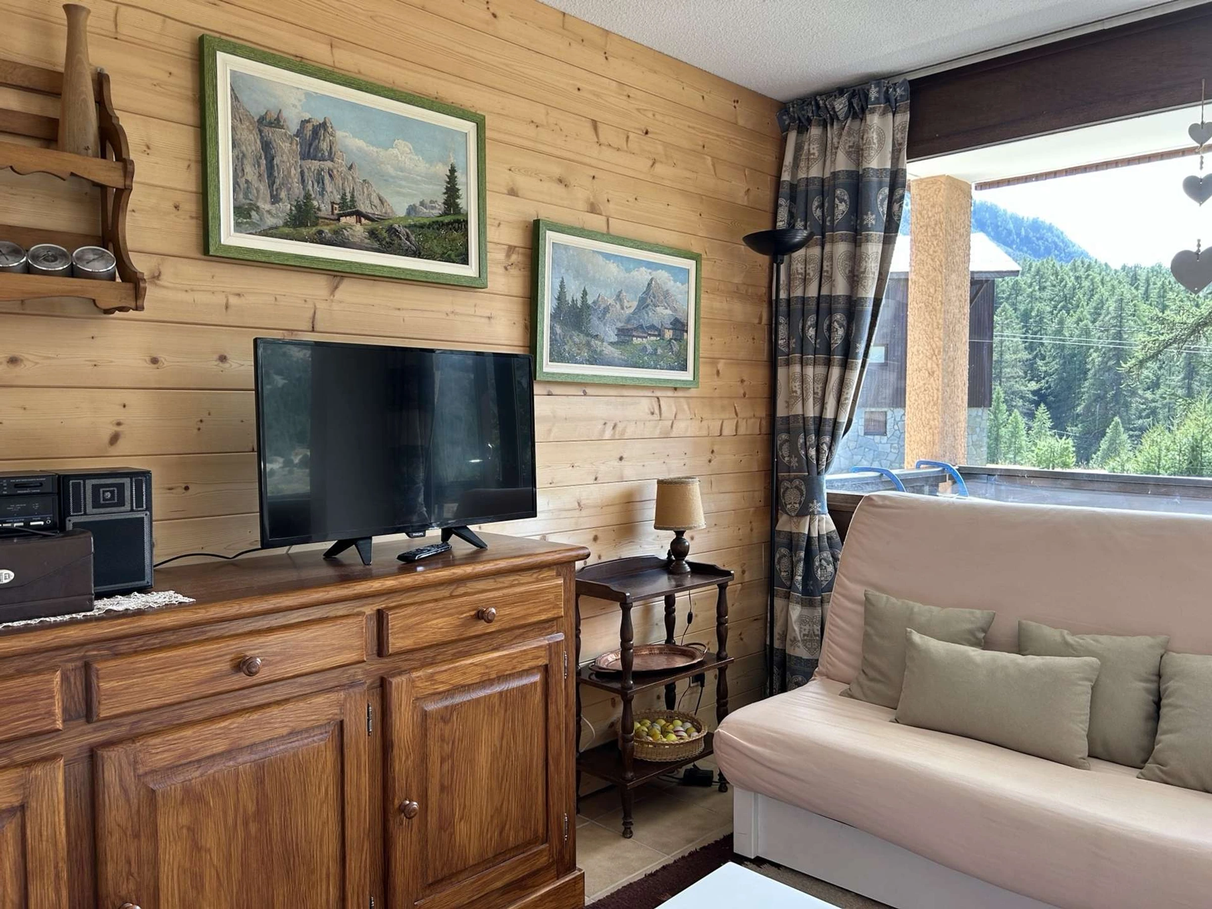 - a living room with a 120cm sofa bed and a television, opening onto the west-facing balcony.