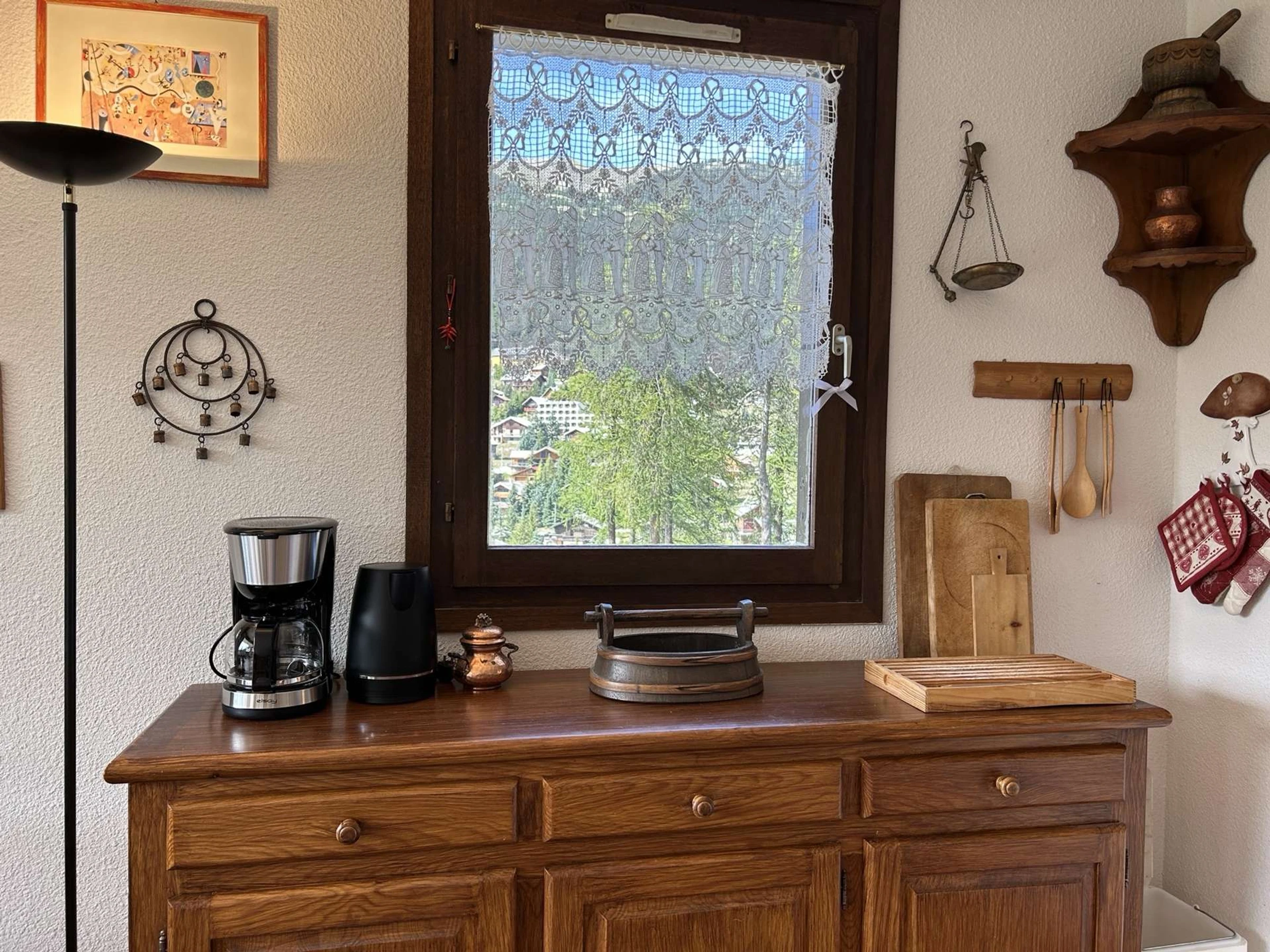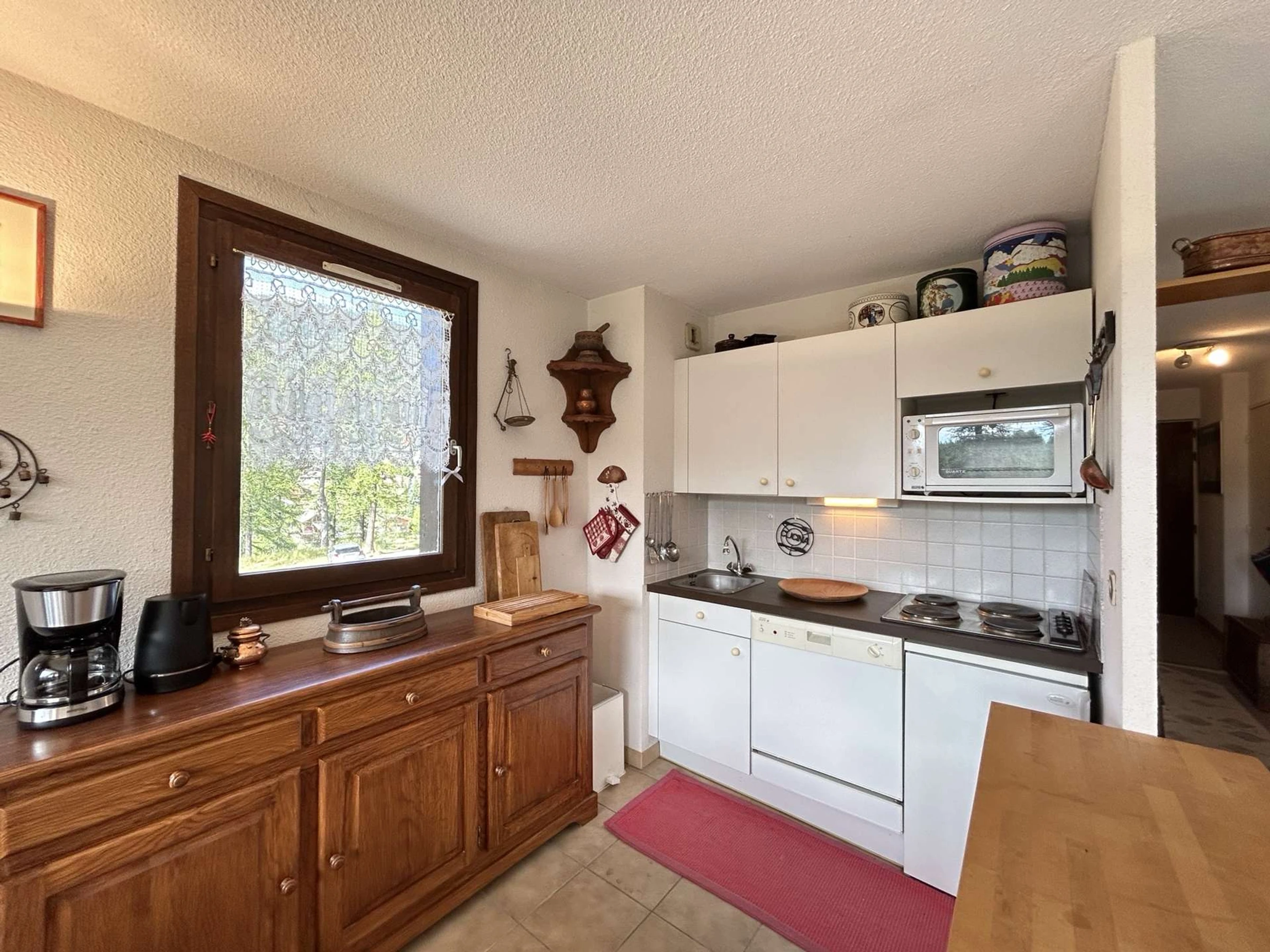 - a well-equipped kitchen area with a dishwasher, table-top fridge with small freezer, mini-oven, kettle, toaster, and filter coffee maker.
