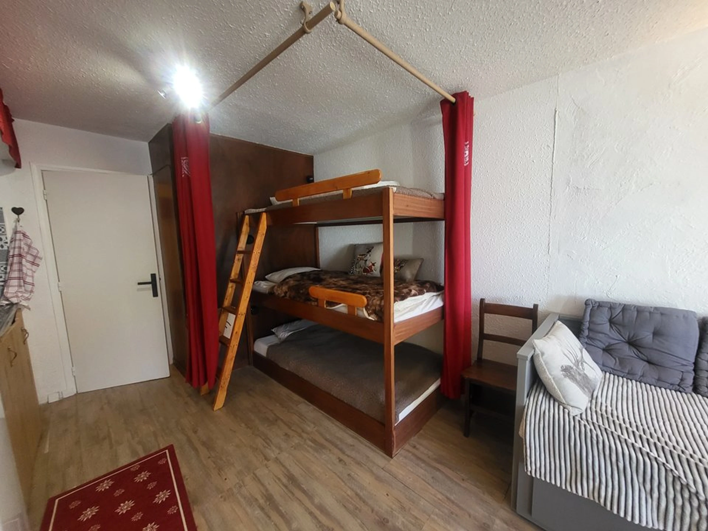 - a sleeping alcove opposite the kitchen with bunk beds separated from the living area by a curtain,