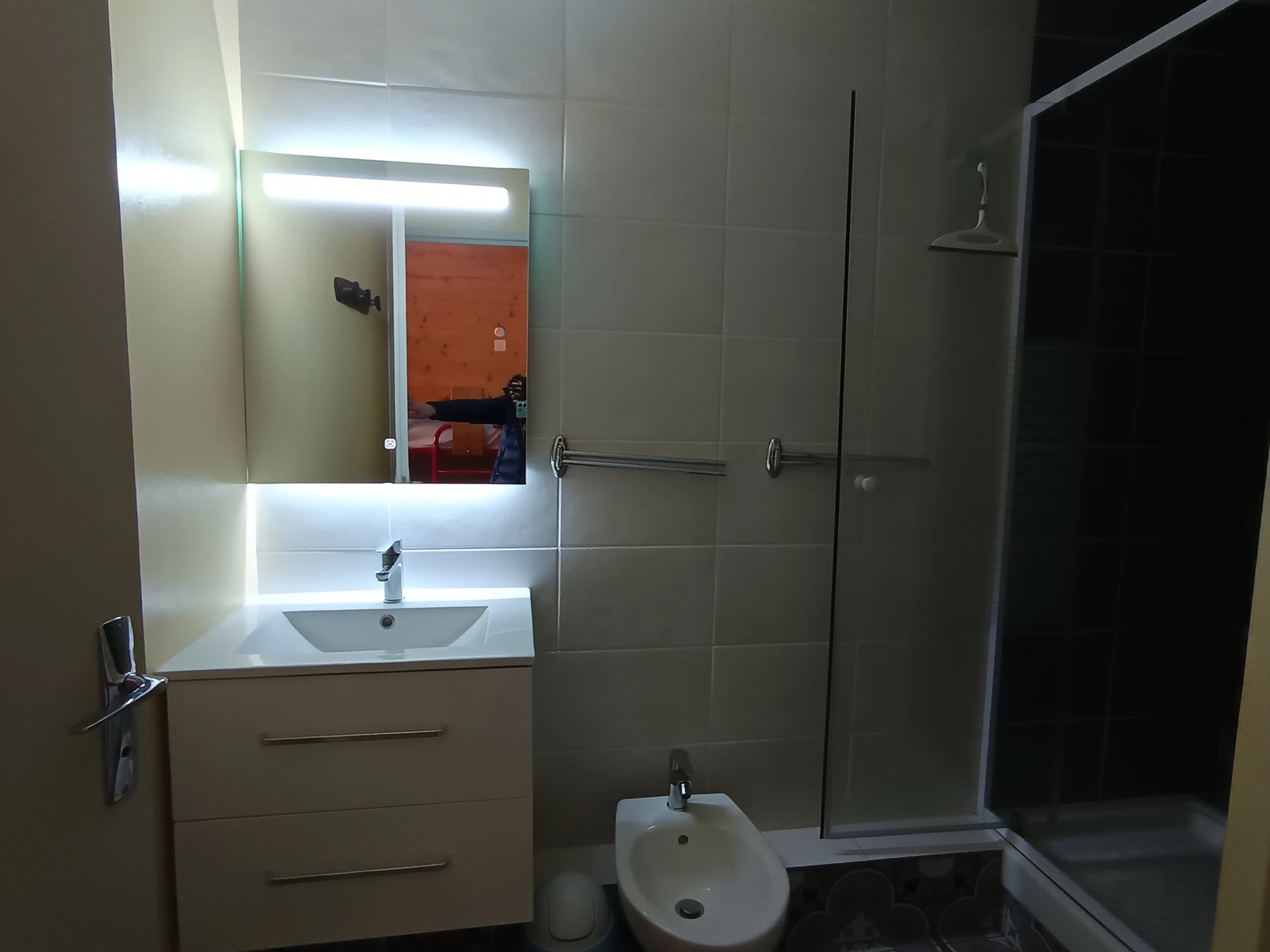 Bathroom: Shower cabin with shower screen, vanity unit, mirror, storage cupboard, wall mounted electric towel dryer, (bathroom completely renovated in April 2020)
