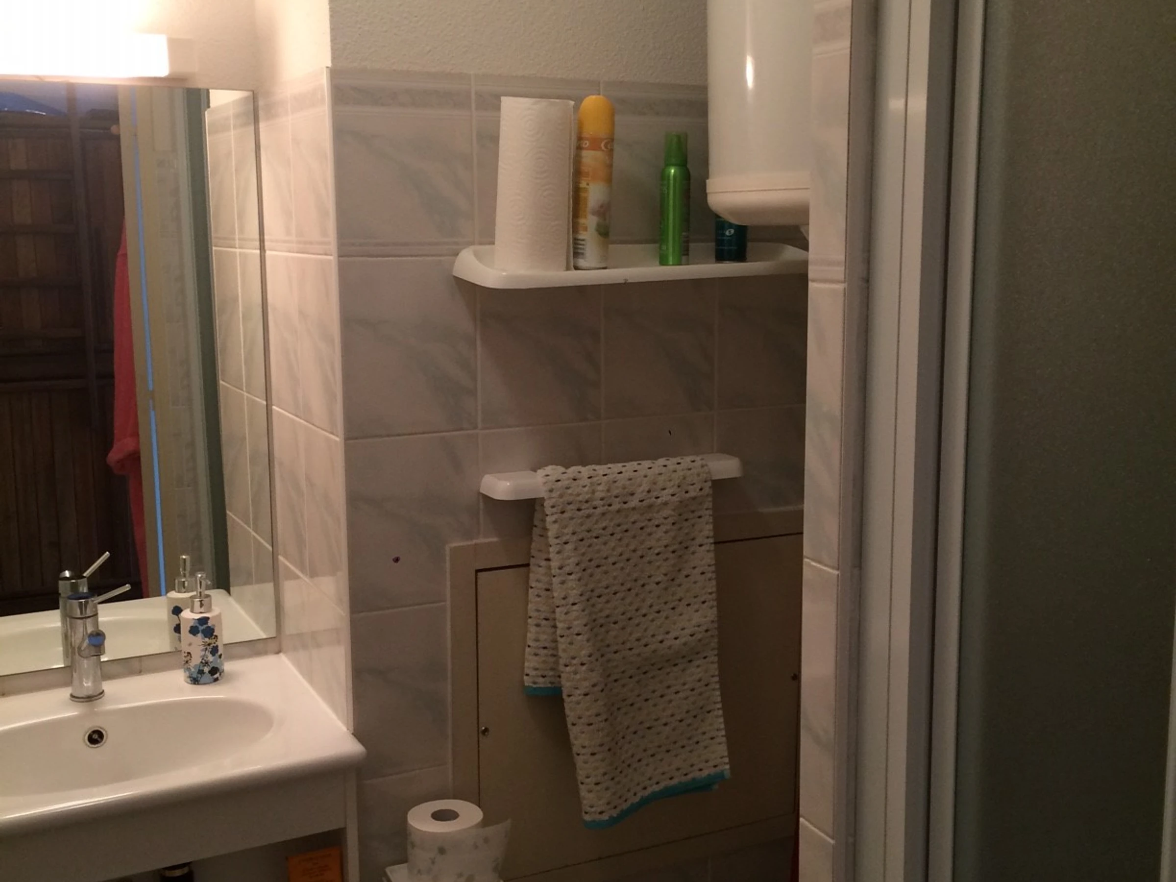 Shower room: Shower, toilet, bidet, washbasin, storage, wall-mounted towel rail.