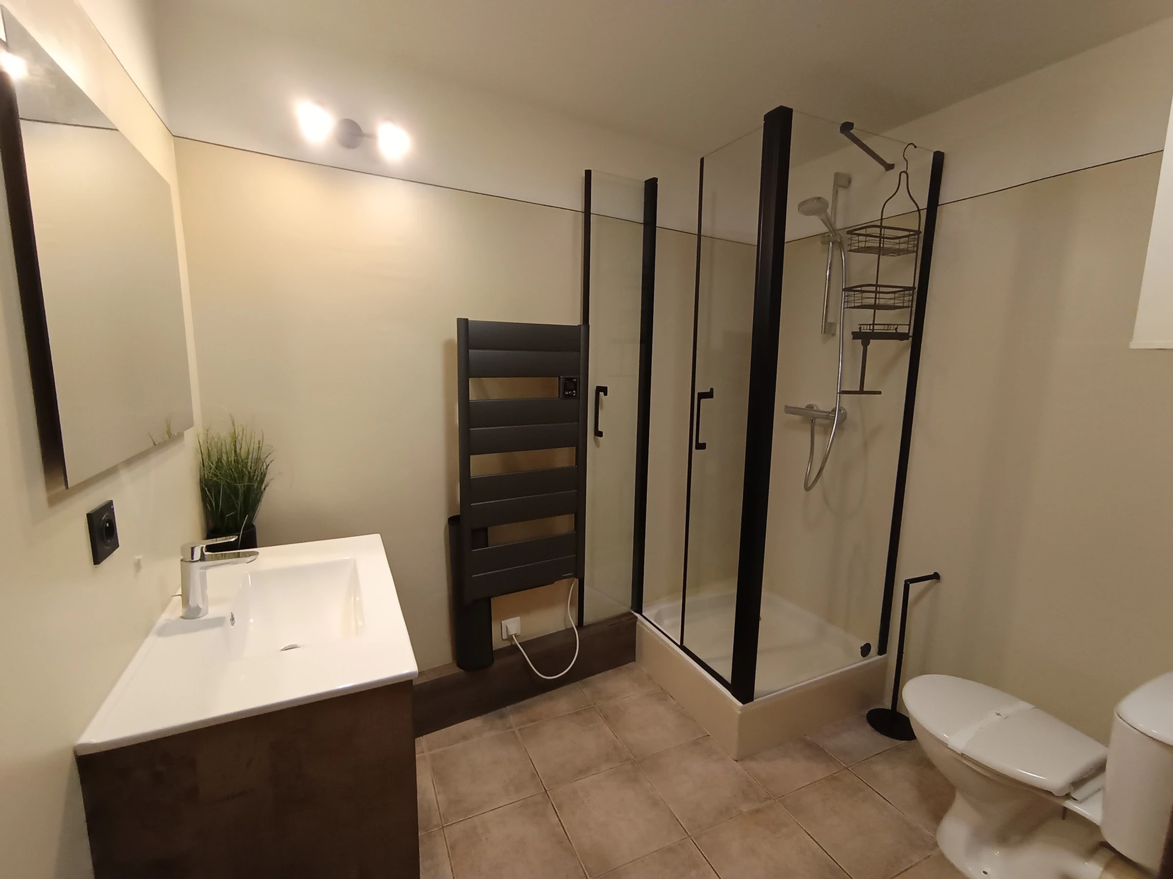 Shower room: Large shower cubicle with shower screen, vanity unit with washbasin, large mirror, wall-mounted electric towel dryer, w, shelves, clothes hooks.