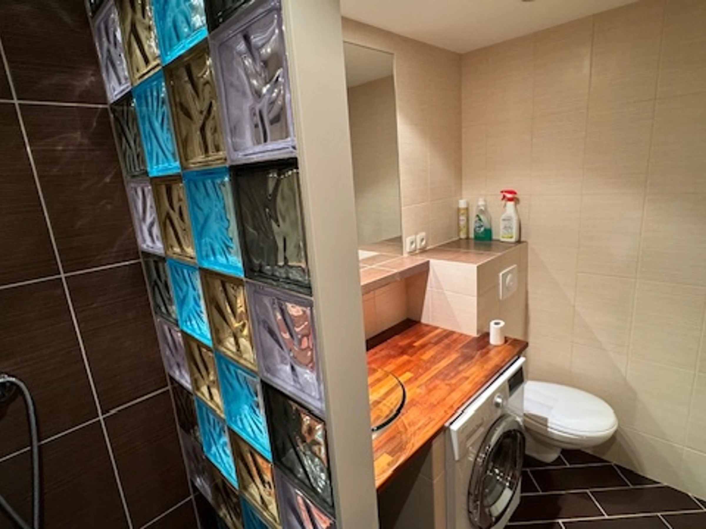 Bathroom: Large shower, vanity unit with sink, washing machine, wc, large mirror.