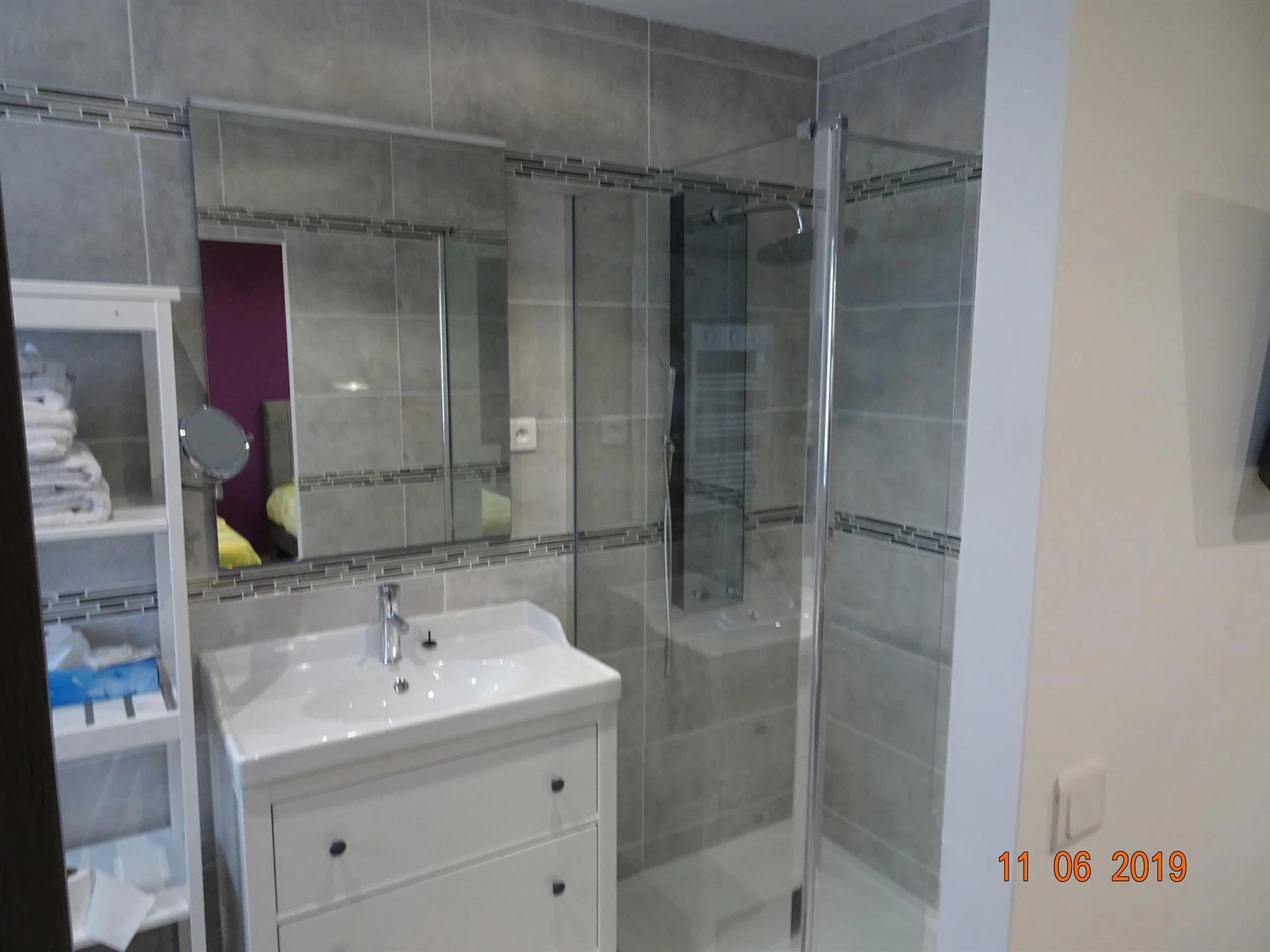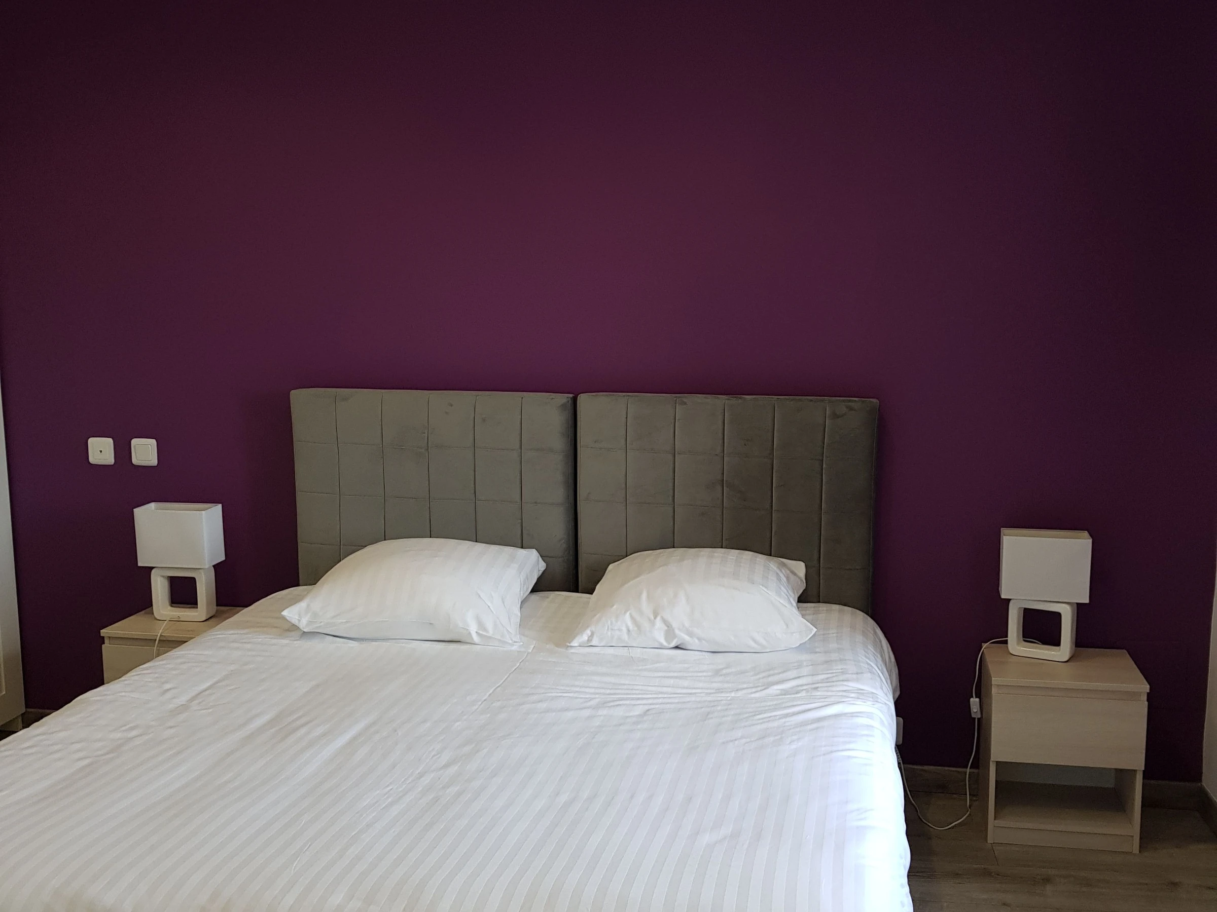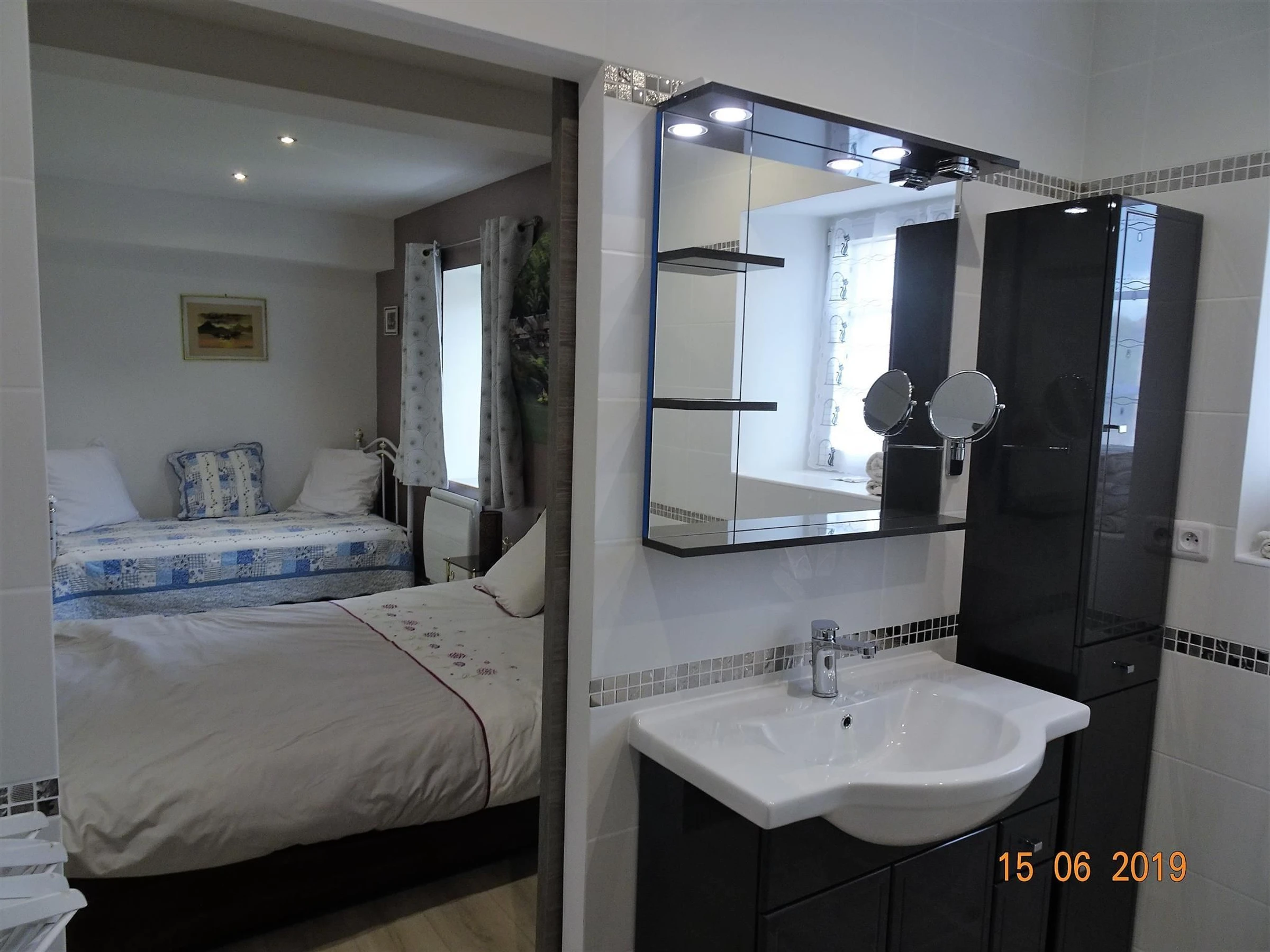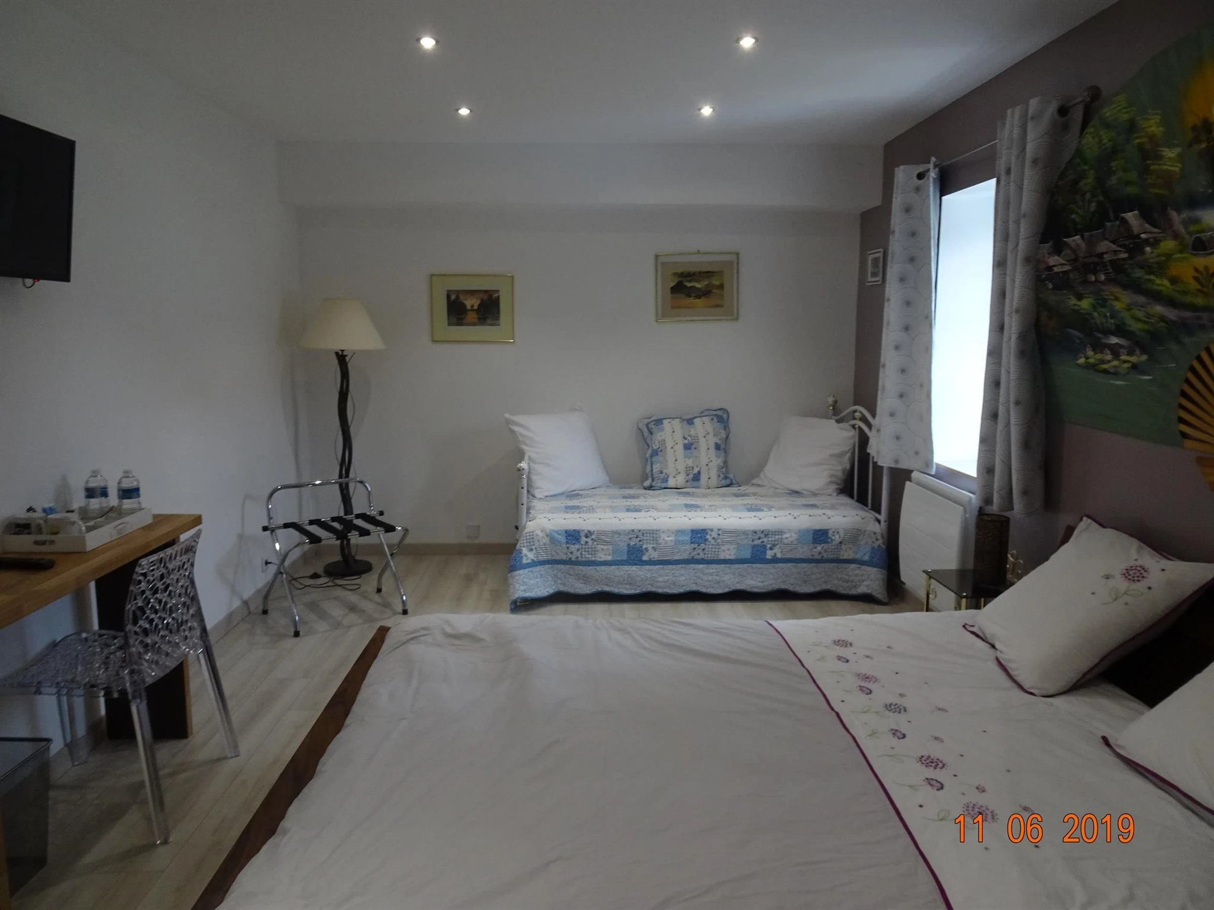 One queen-size bed and one 90 x 190 cm bed with a private bathroom. Walk-in shower and toilet.