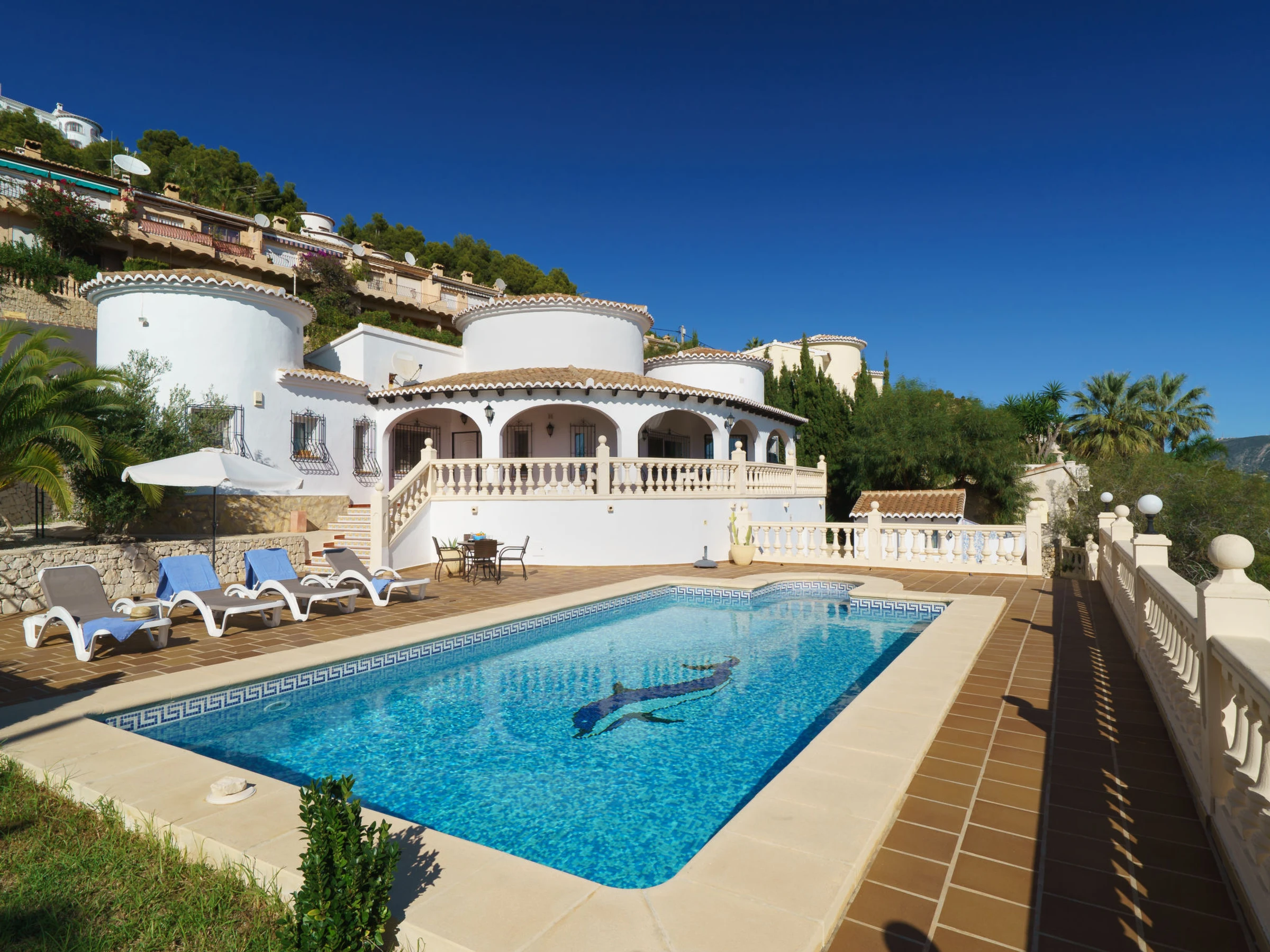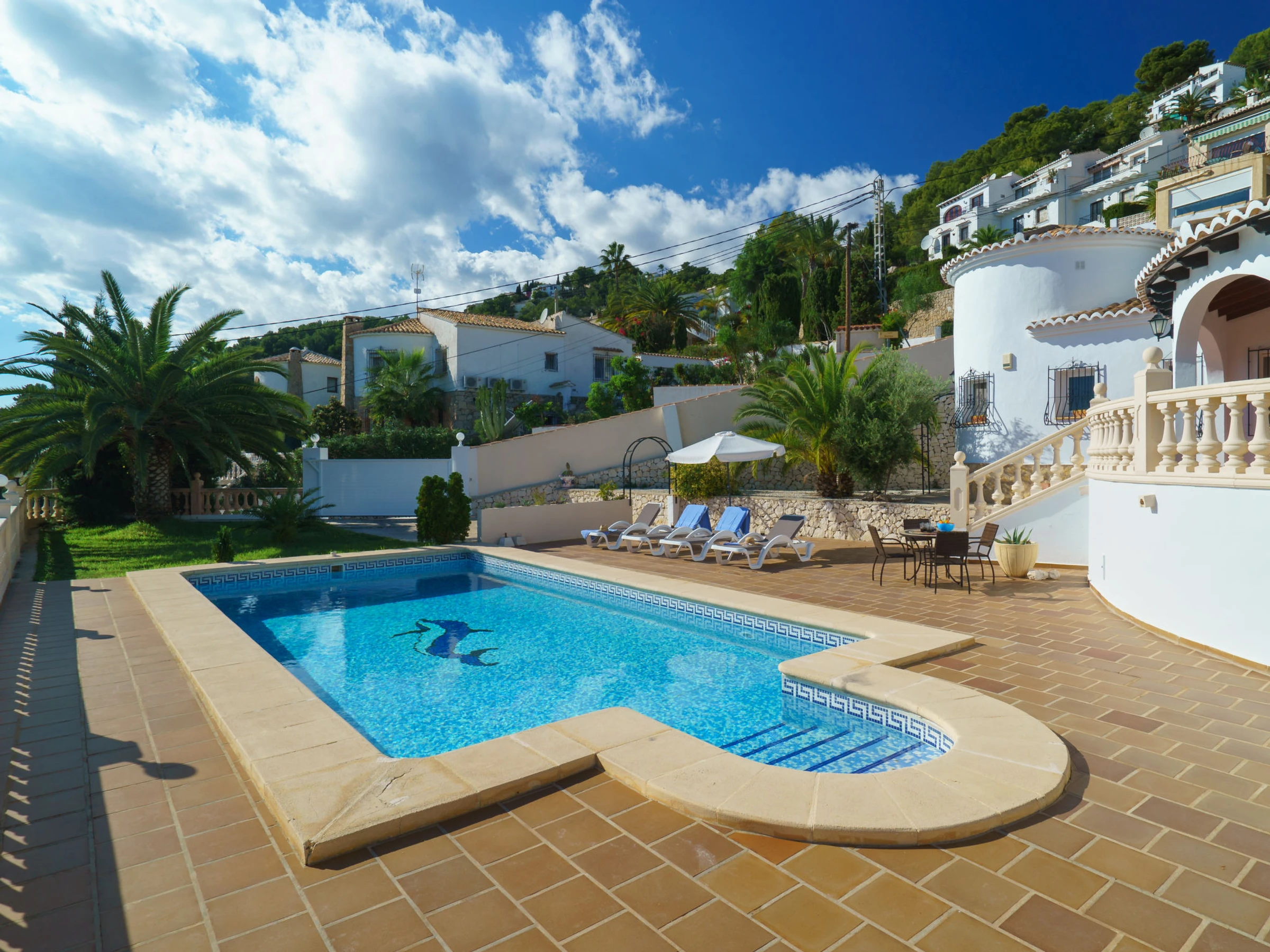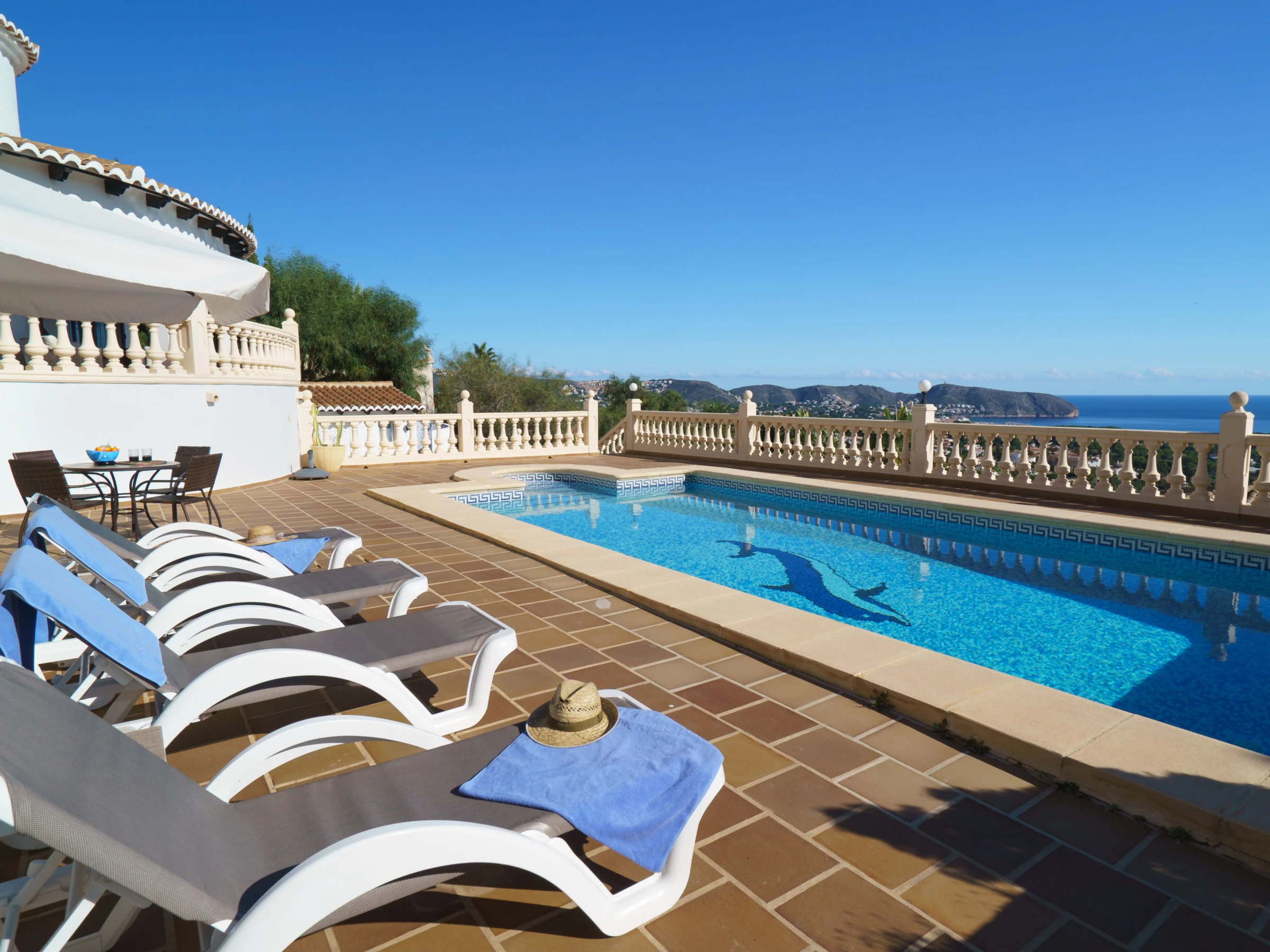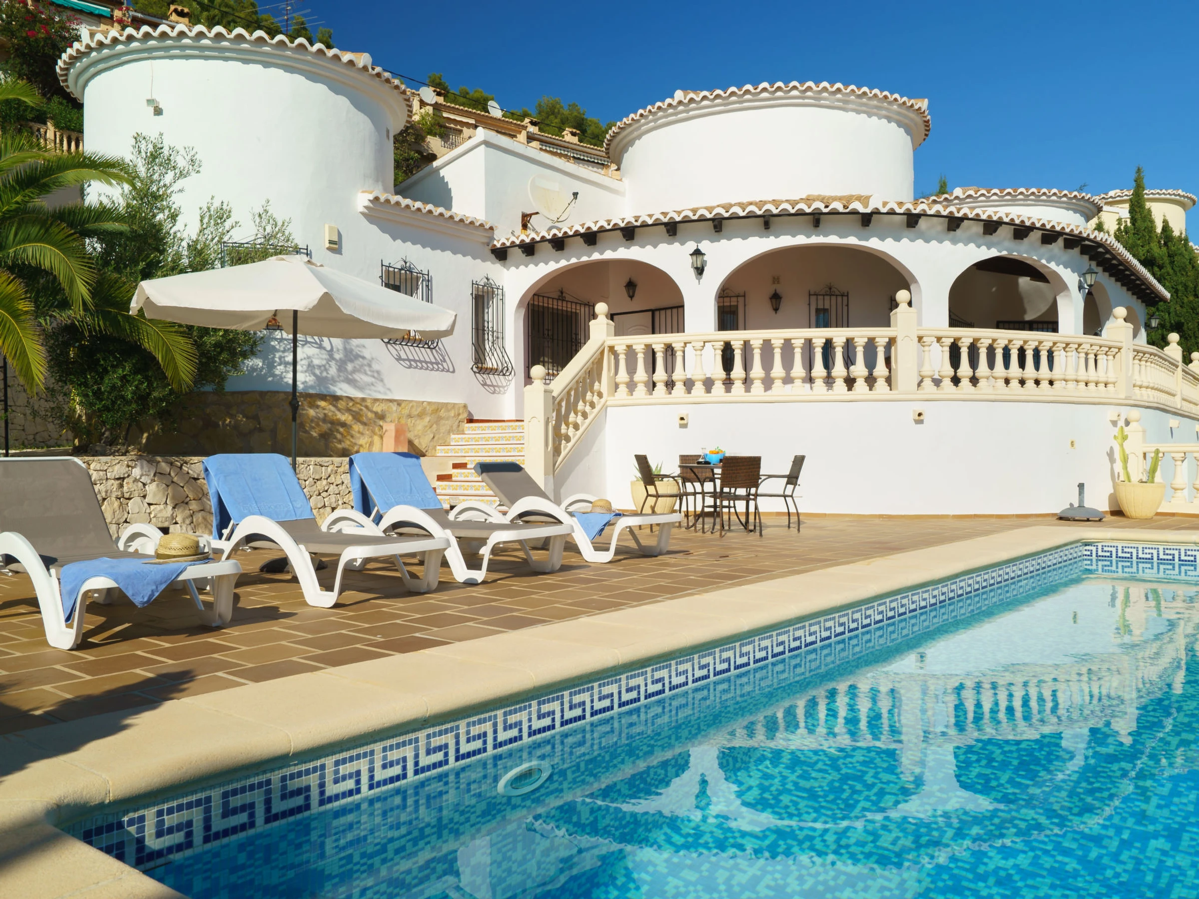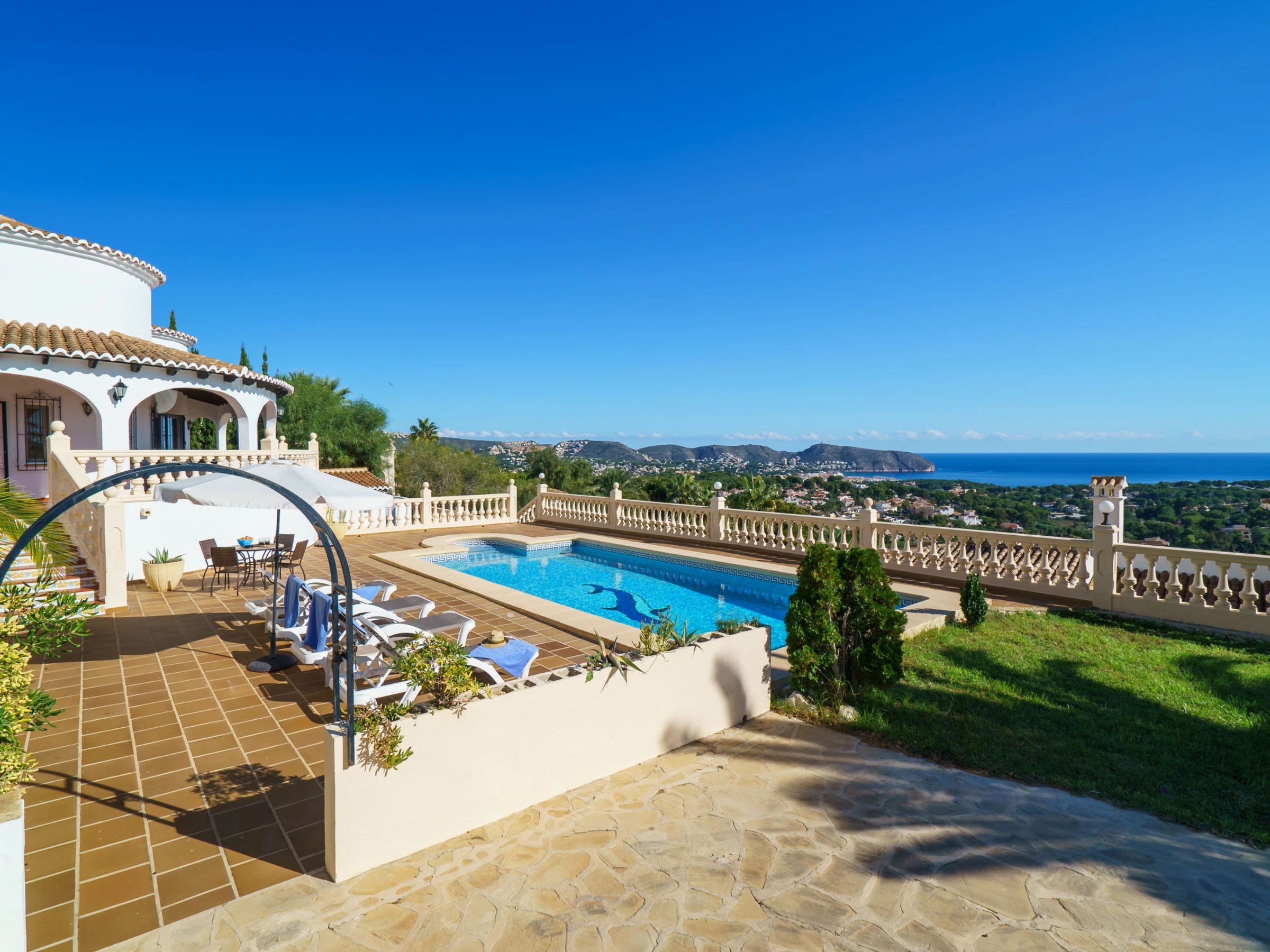 Very beautiful villa "Iris". 3.5 km from the centre of Moraira, in a quiet, sunny, elevated position, 3.1 km from the sea, 4 km from the beach, located by a road. Private: property (fenced), swimming pool angular (5 x 10 m, seasonal availability: [hidden] and [hidden] with internal staircase. Shower/WC in the pool area, garden furniture, barbecue. In the house: WiFi, air conditioning, washing machine, tumble dryer. Parking (for 2 cars). Shop 3.3 km, grocery 2.6 km, supermarket 2.6 km, shopping centre 3.3 km. Golf course (9 hole) 2 km. Please note: car recommended. Suitable for families. Groups of teenagers on request only.