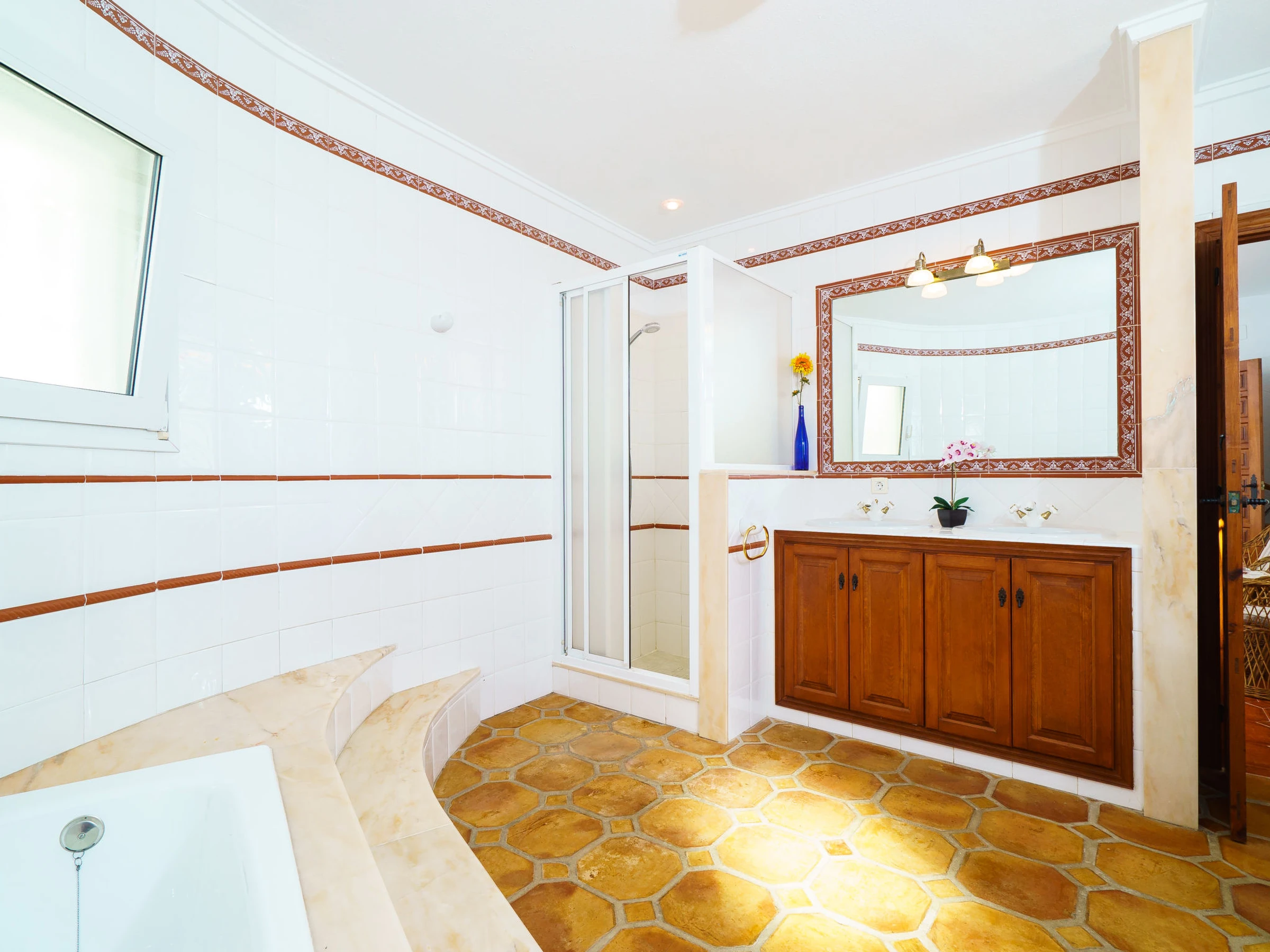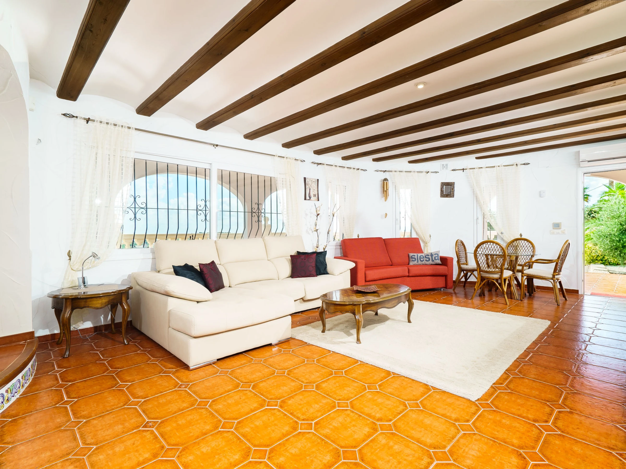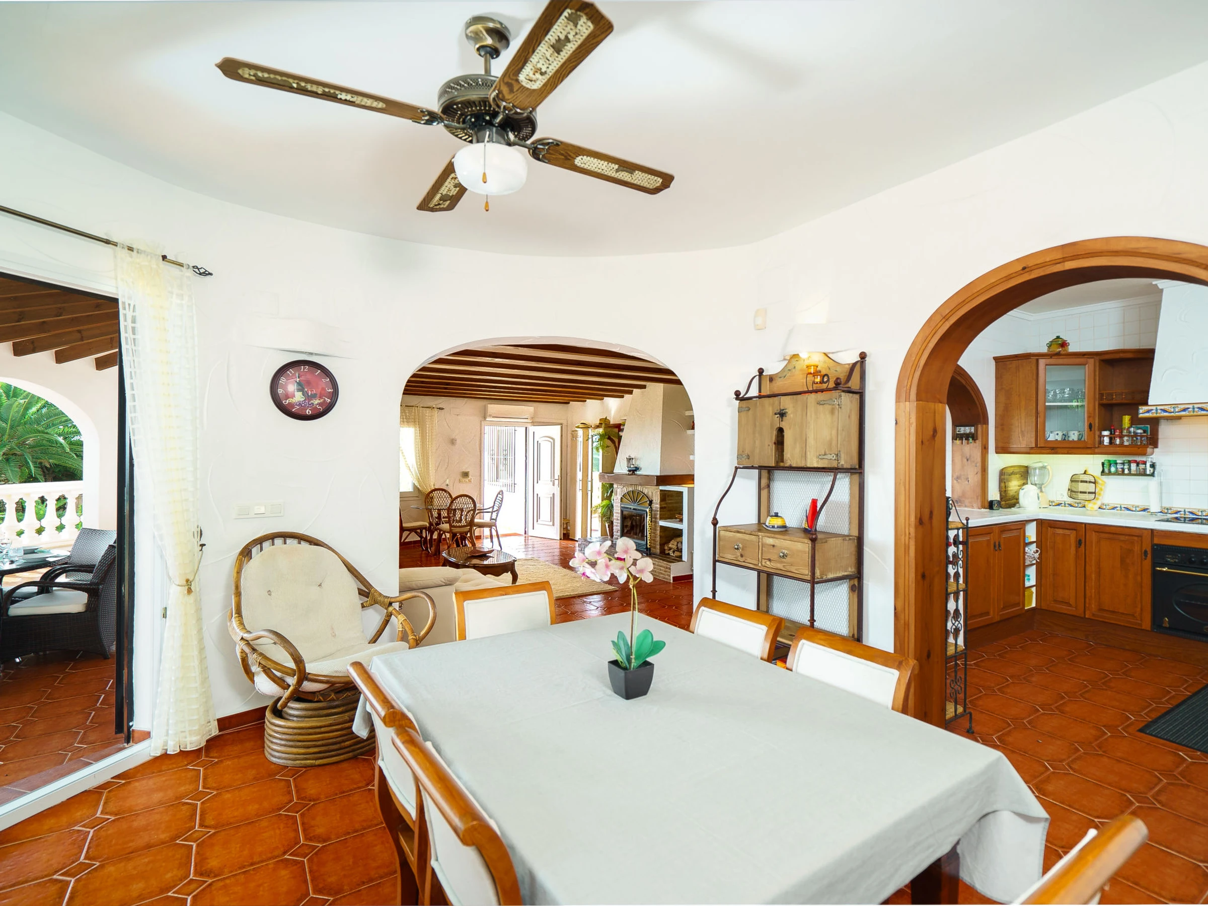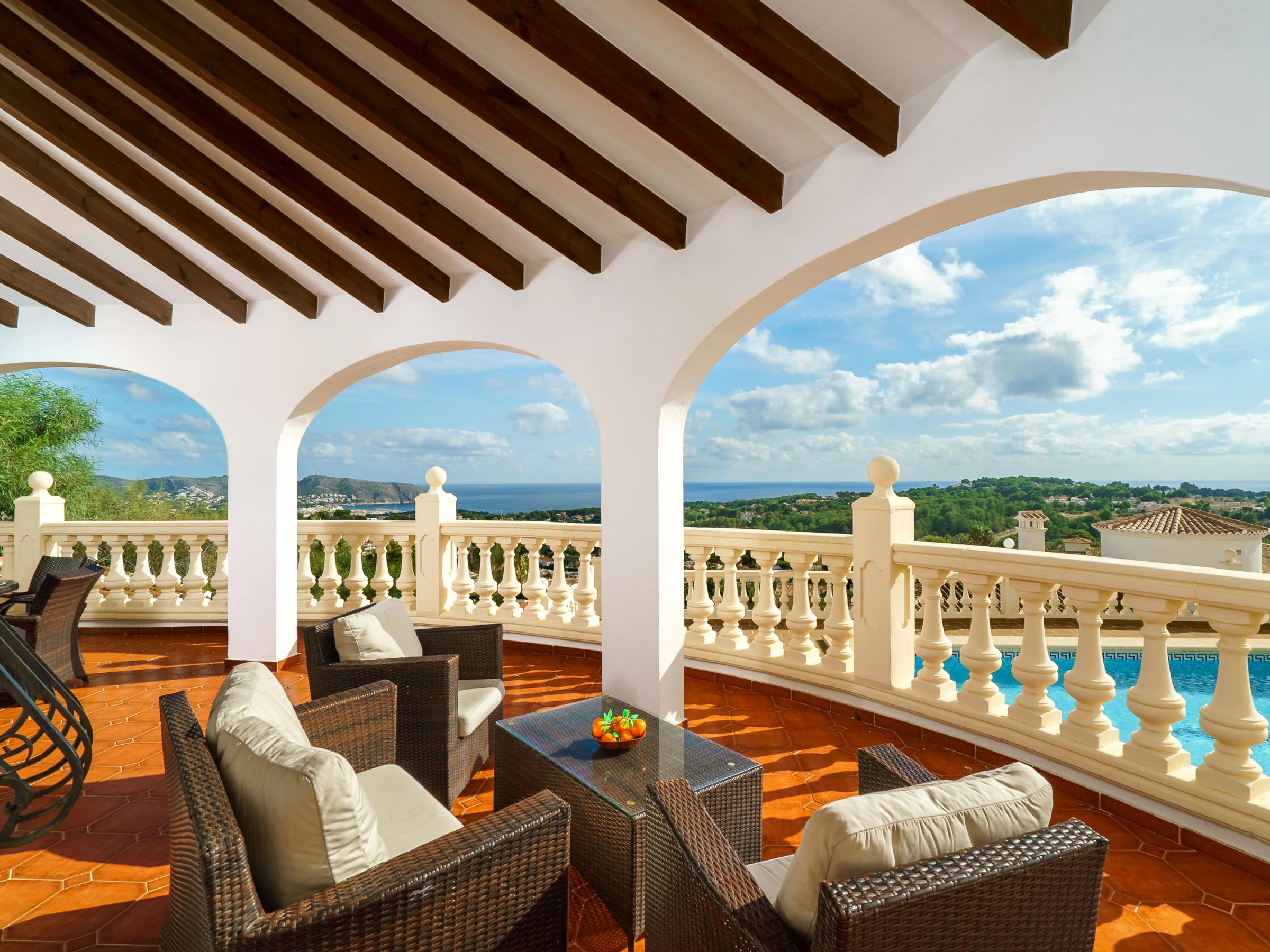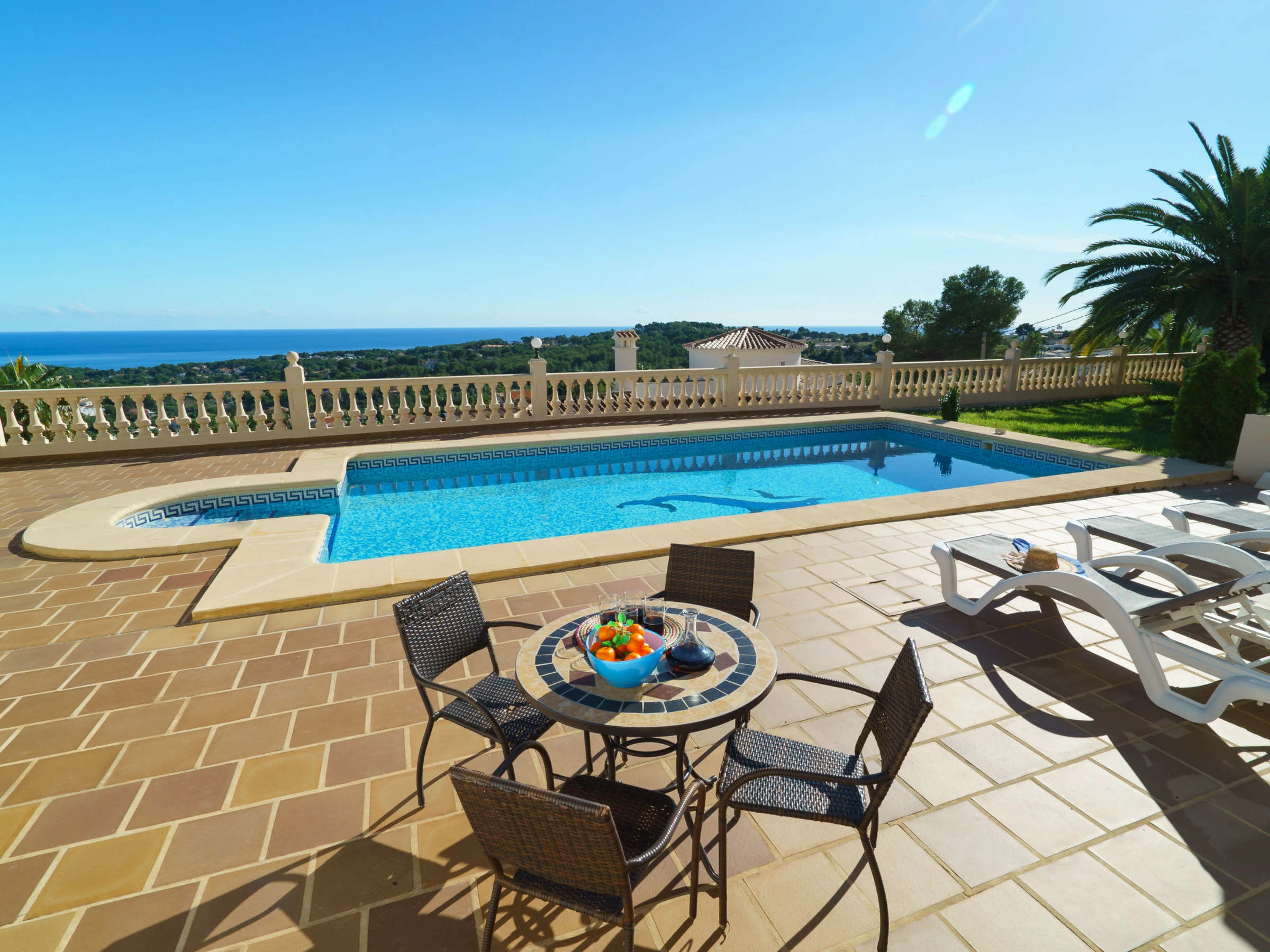 Very beautiful villa "Iris". 3.5 km from the centre of Moraira, in a quiet, sunny, elevated position, 3.1 km from the sea, 4 km from the beach, located by a road. Private: property (fenced), swimming pool angular (5 x 10 m, seasonal availability: [hidden] and [hidden] with internal staircase. Shower/WC in the pool area, garden furniture, barbecue. In the house: WiFi, air conditioning, washing machine, tumble dryer. Parking (for 2 cars). Shop 3.3 km, grocery 2.6 km, supermarket 2.6 km, shopping centre 3.3 km. Golf course (9 hole) 2 km. Please note: car recommended. Suitable for families. Groups of teenagers on request only.