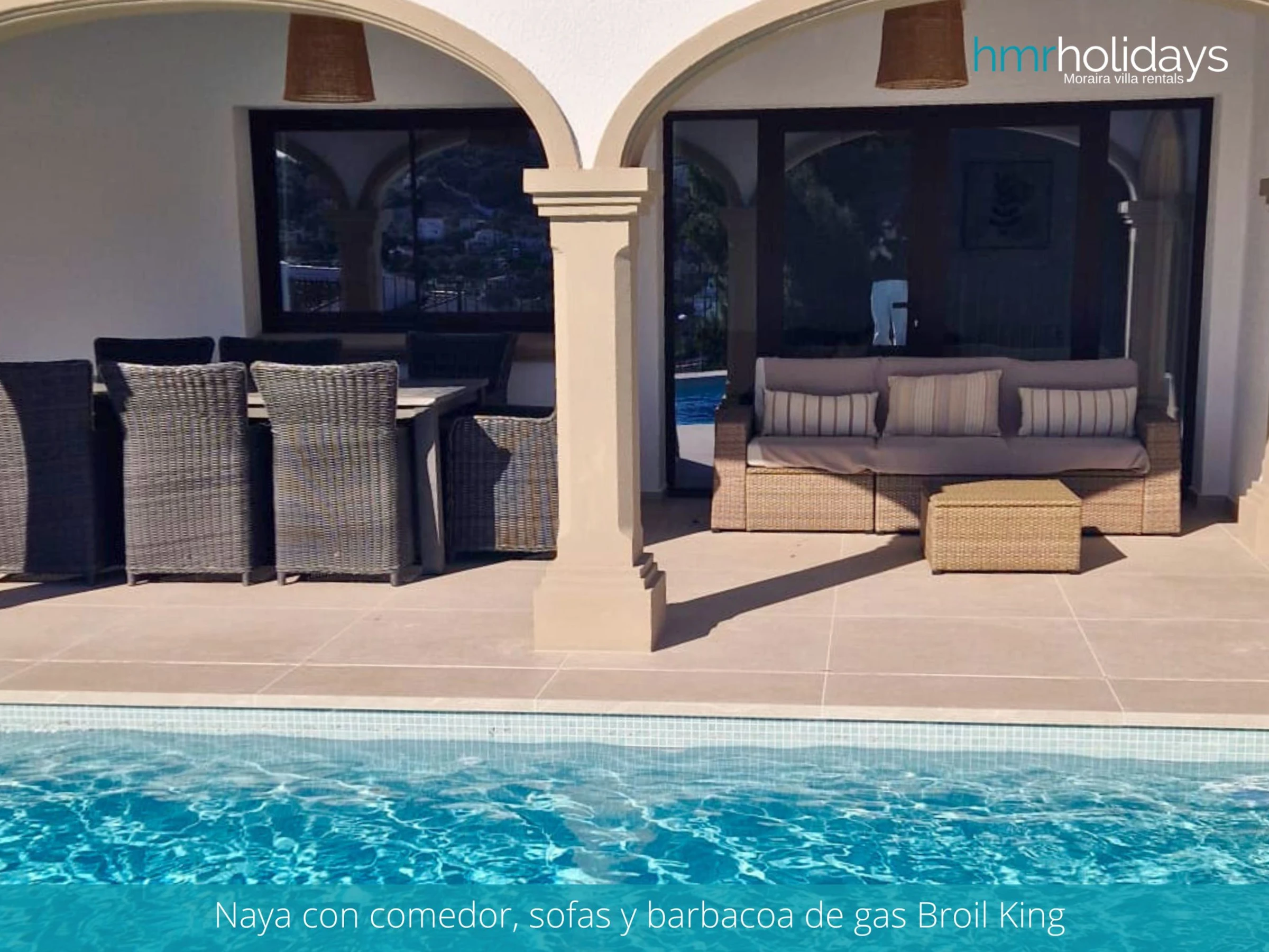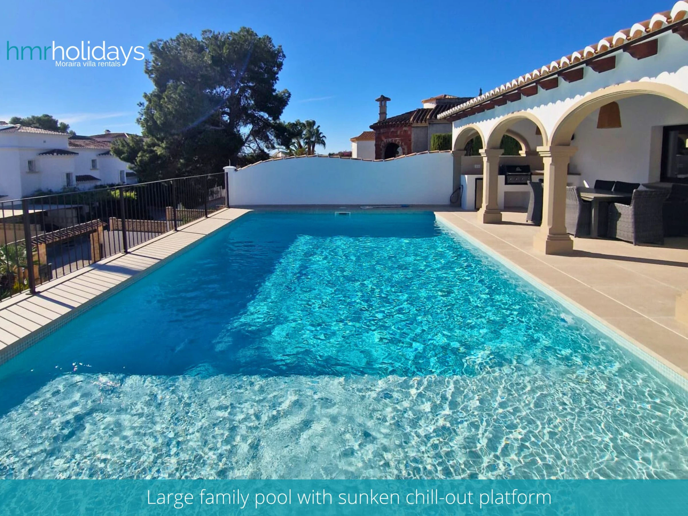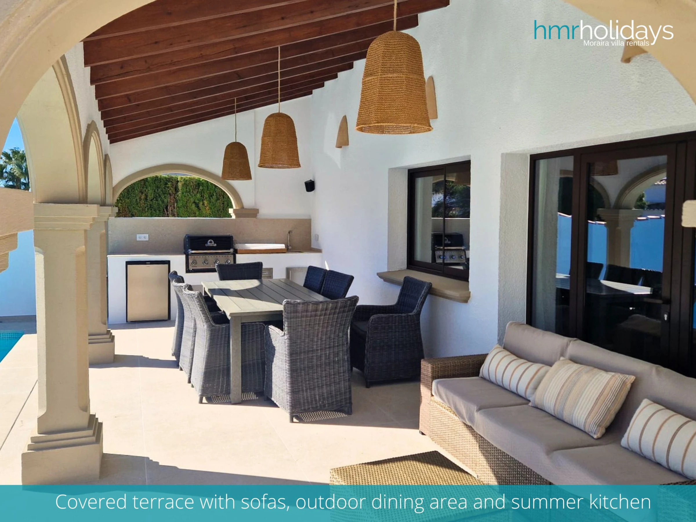 The outdoor area of the villa is equally impressive, featuring a large private pool, surrounded by sun loungers and umbrellas for your comfort. There is also a covered chill-out area, perfect for escaping the sun during the hottest part of the day, as well as a gas BBQ for alfresco dining.