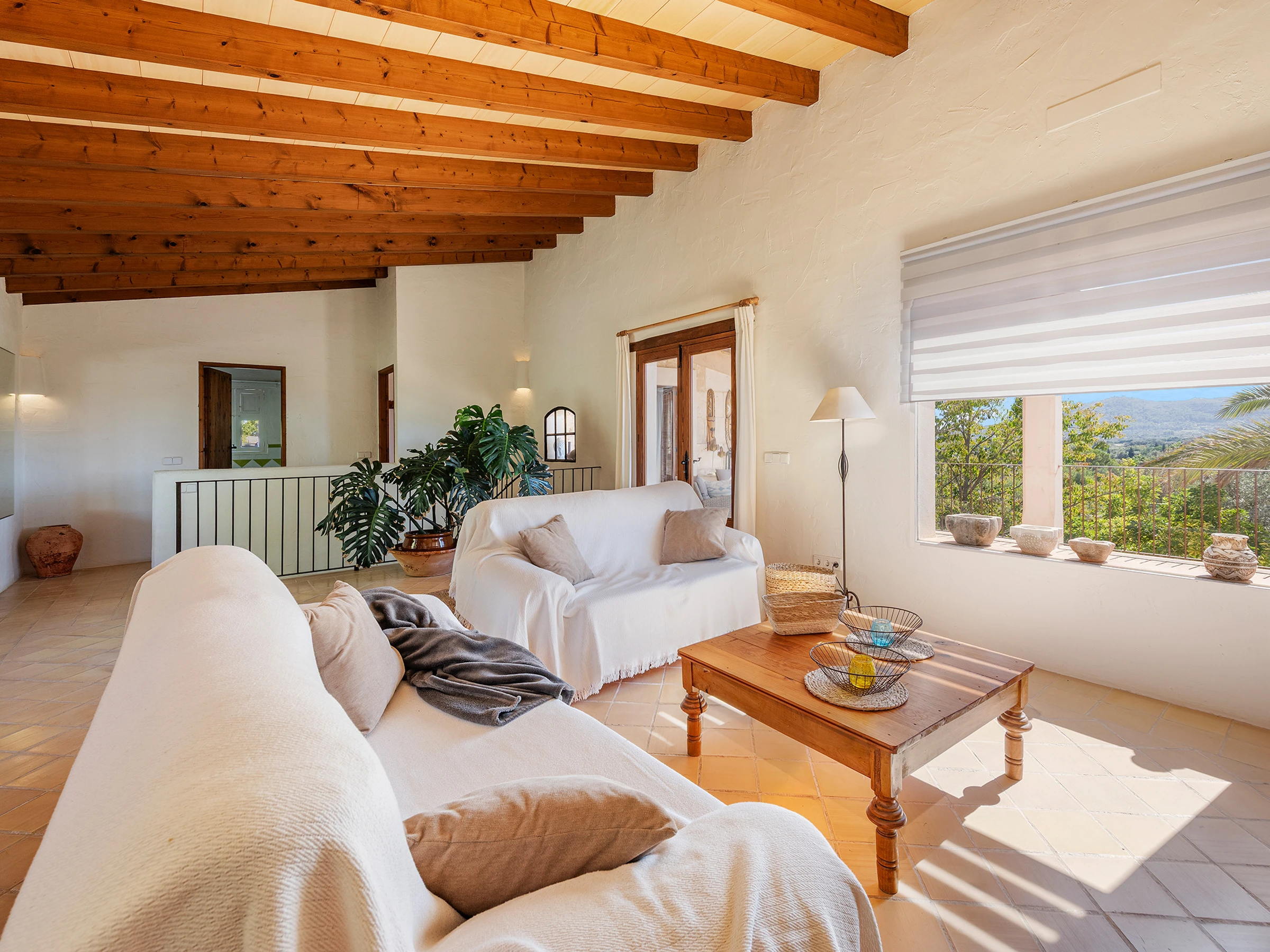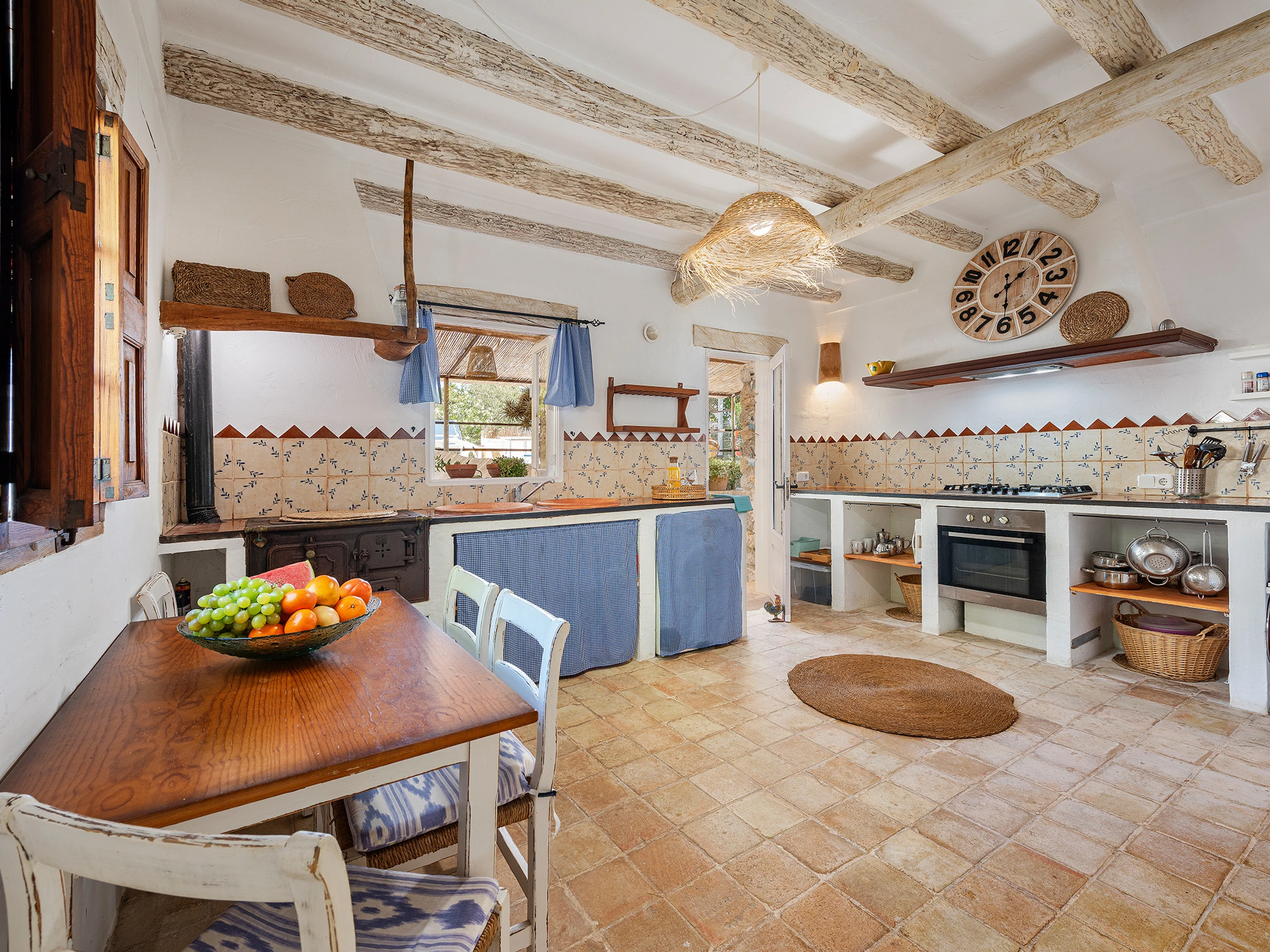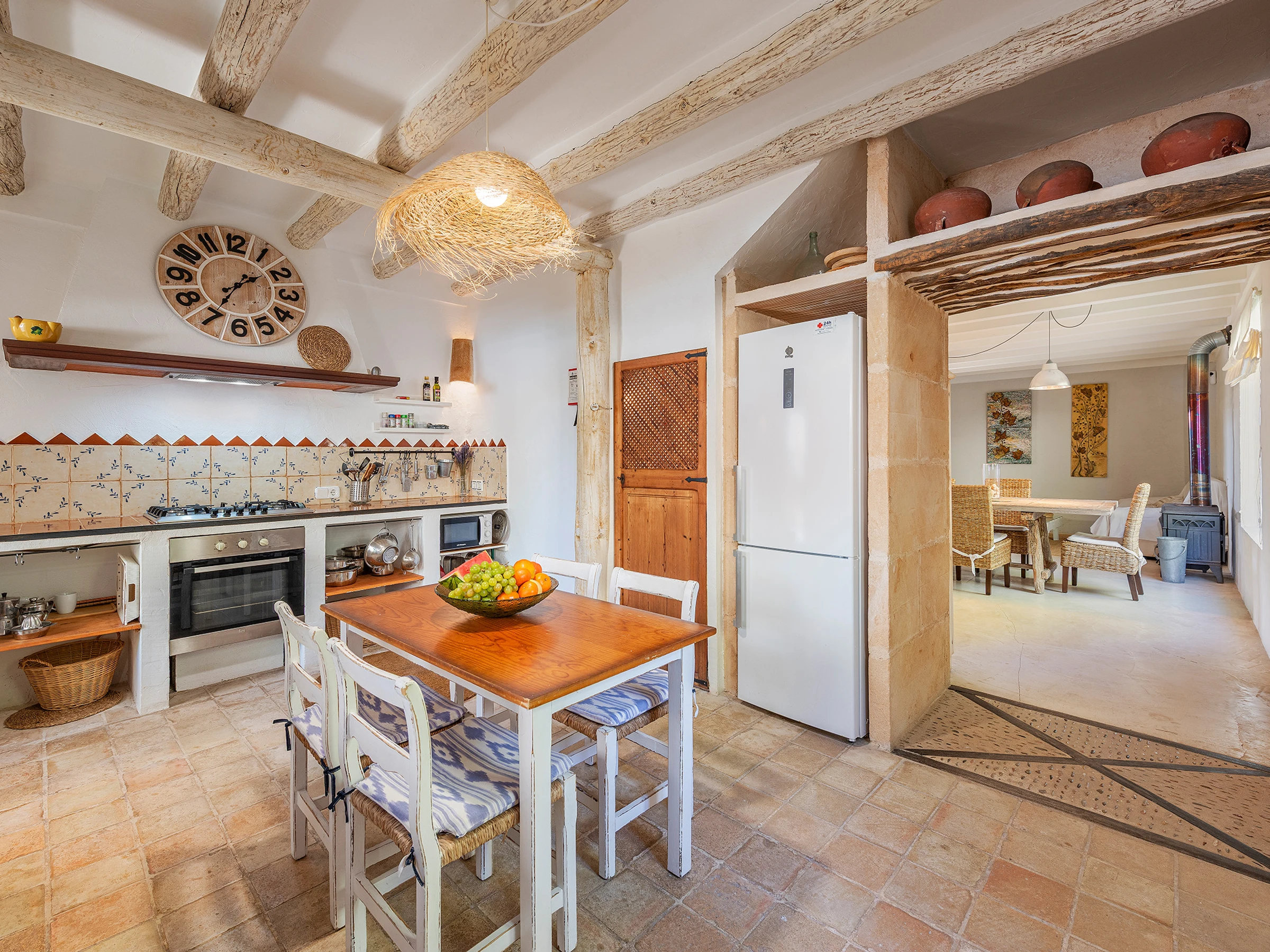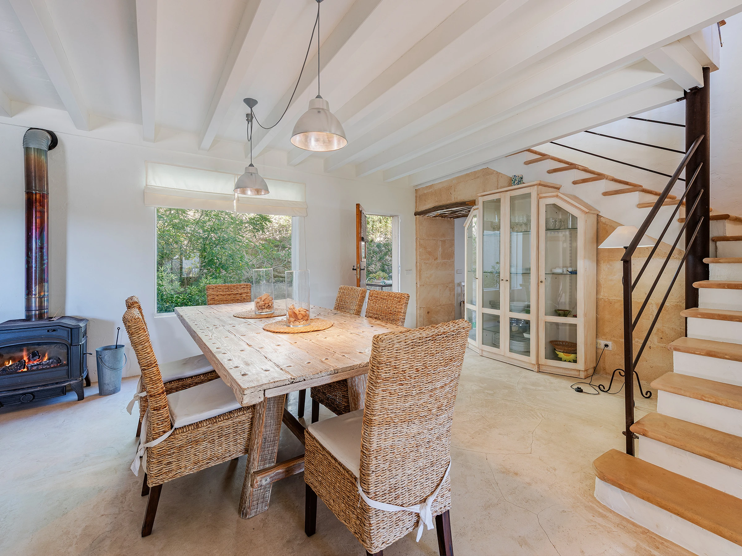 The bright and airy living-dining room is also bathed in natural light. To the right of the dining area is the house’s magical rustic kitchen, full of character and charm. From here, a door leads to another covered patio and to the lovely private pool — perfect for relaxing under the Mallorcan sun.