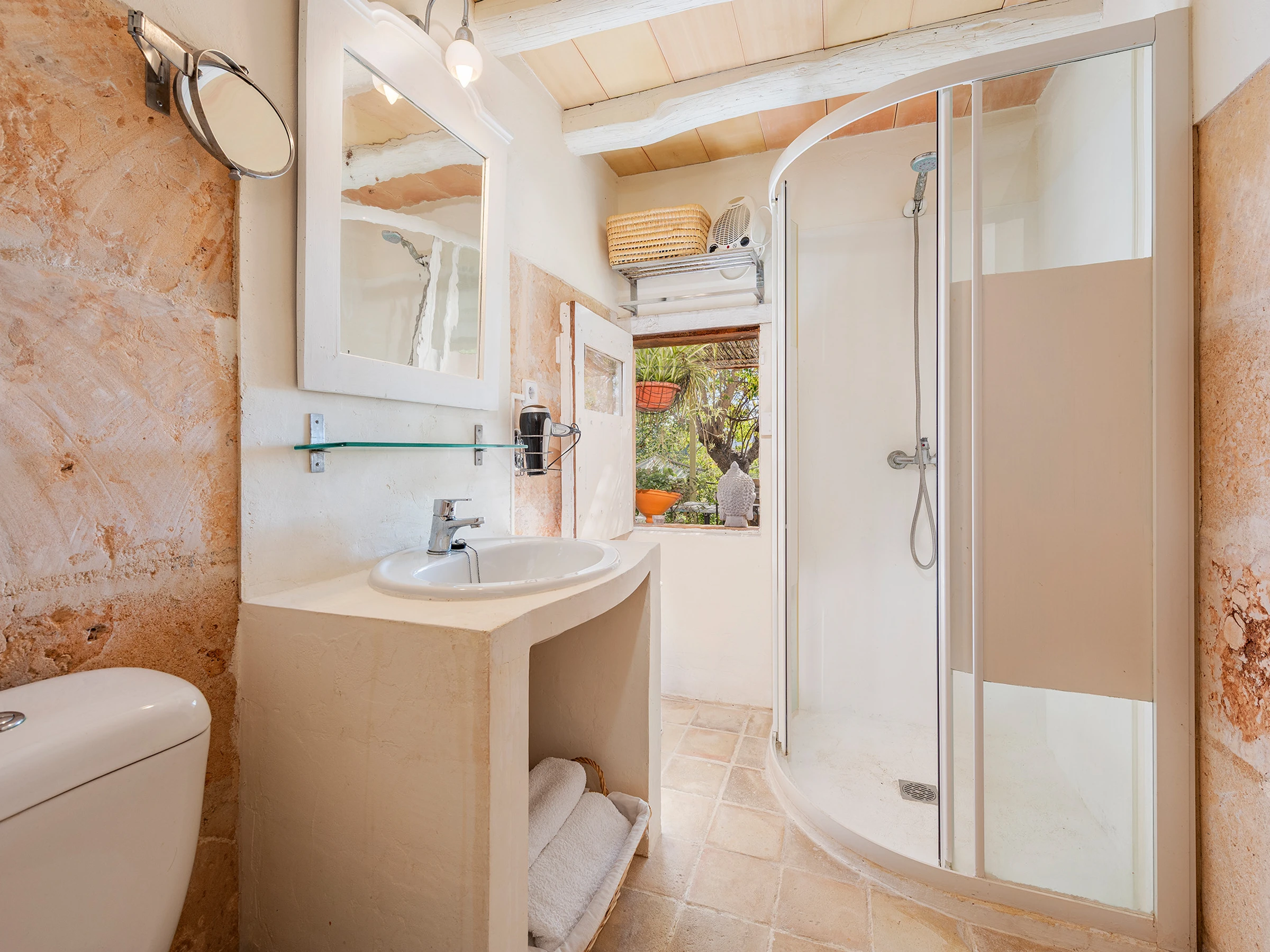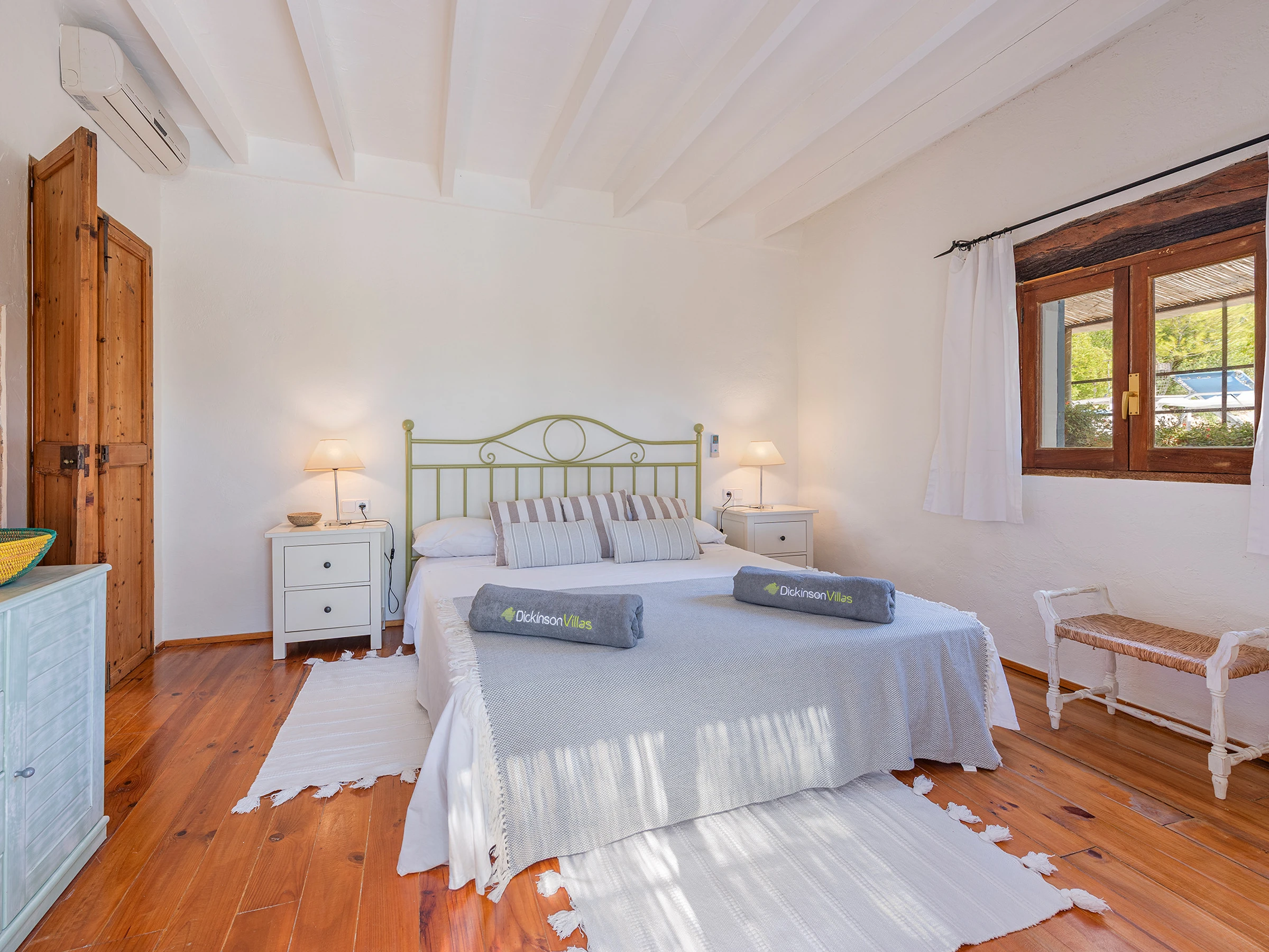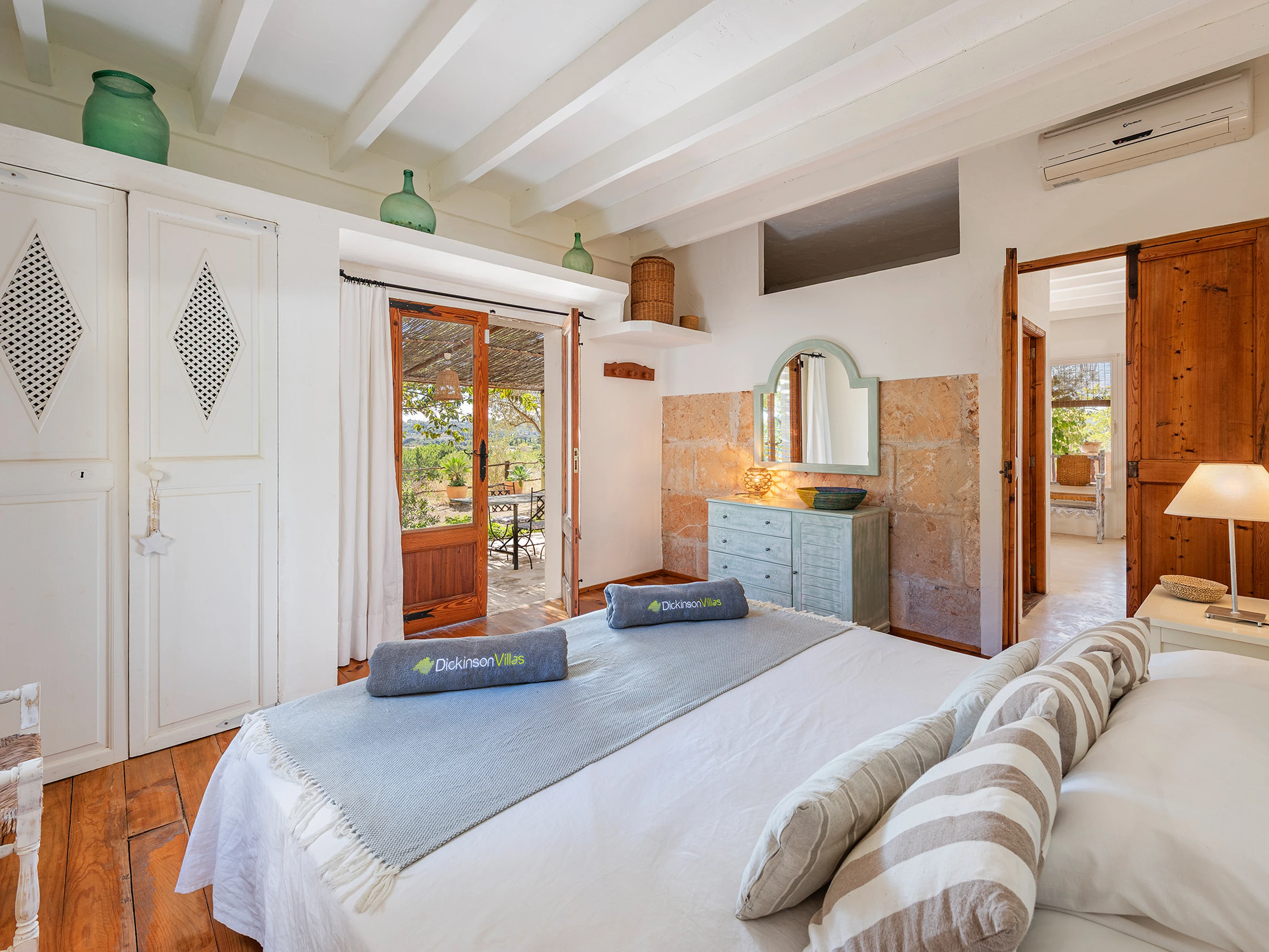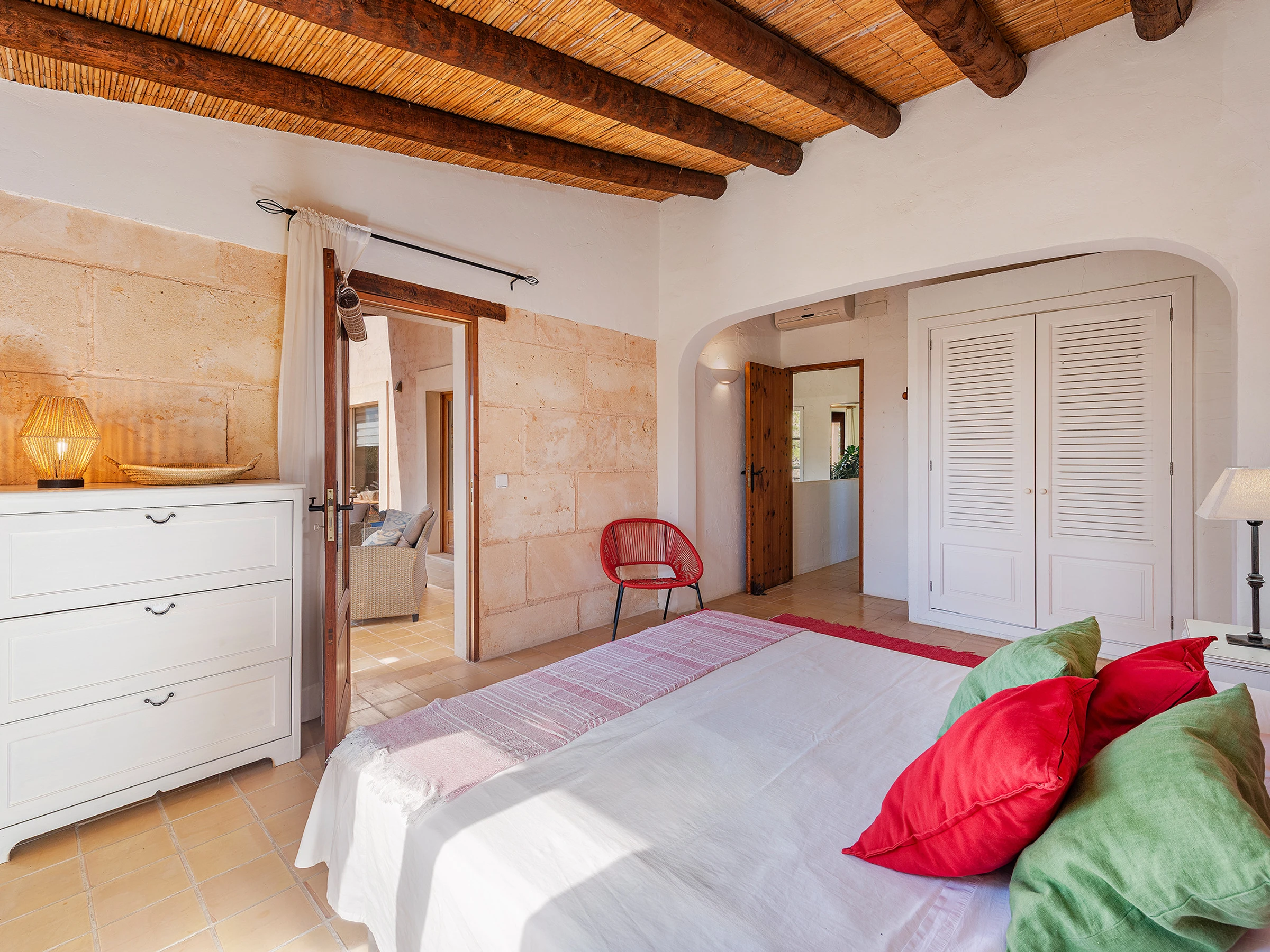 The bright and airy living-dining room is also bathed in natural light. To the right of the dining area is the house’s magical rustic kitchen, full of character and charm. From here, a door leads to another covered patio and to the lovely private pool — perfect for relaxing under the Mallorcan sun.