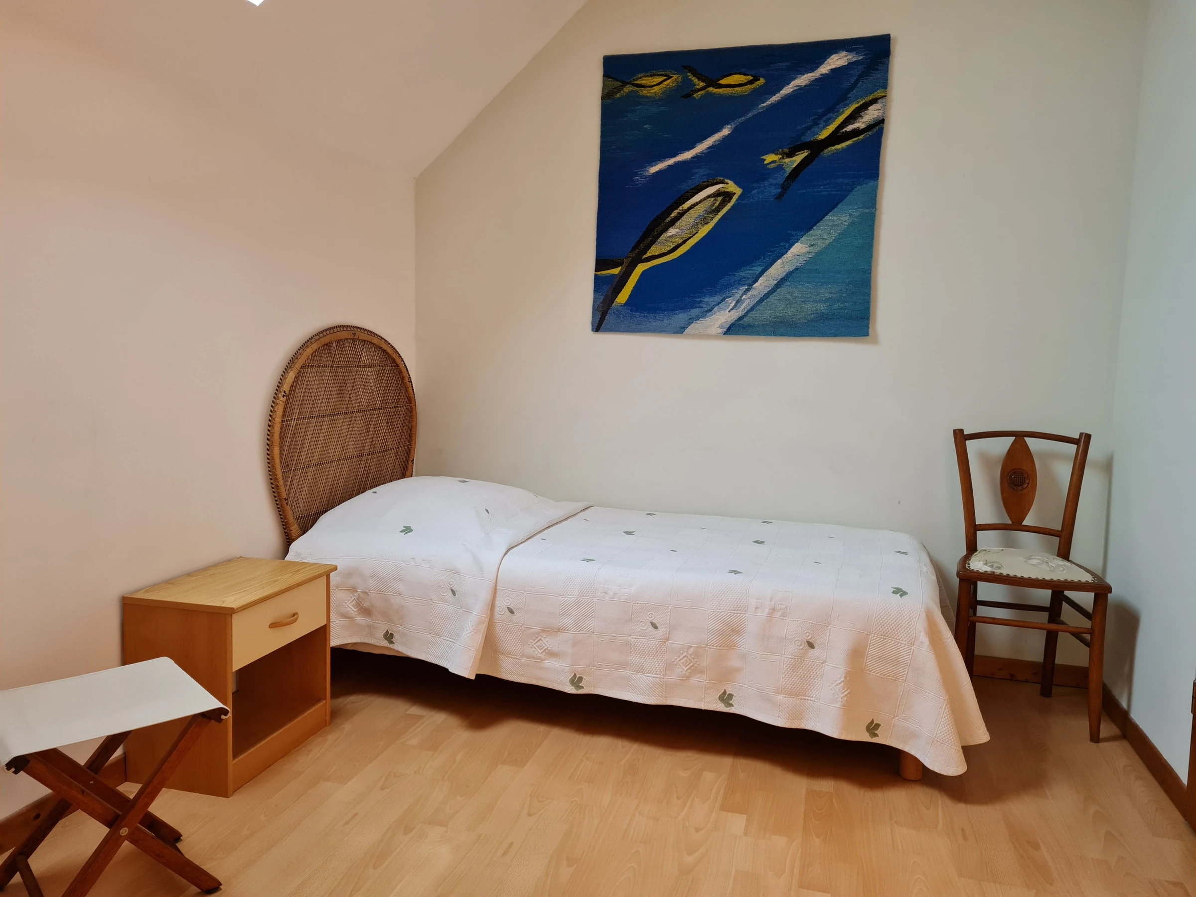 Shared with the other 2 rooms in the guesthouse: Living room on the ground floor with a shared kitchenette and dining area. The "Green" Room sleeps 3 with a double bed (140x190cm) and a single bed (90x190cm) as well as an adjoining private bathroom (shower, vanity, and toilet).