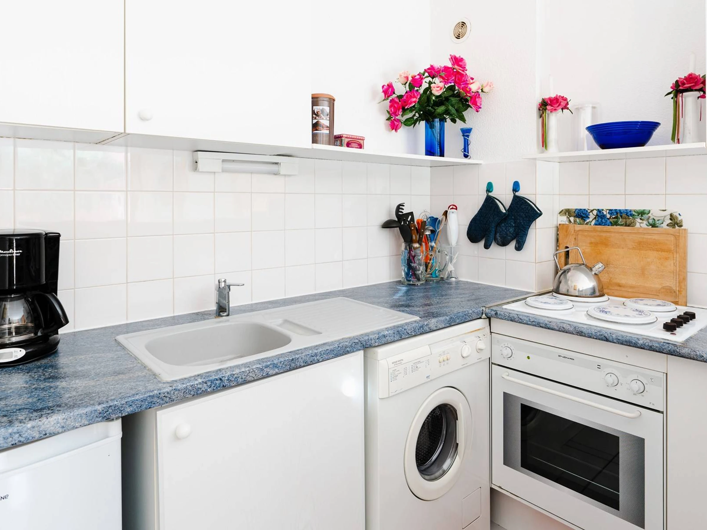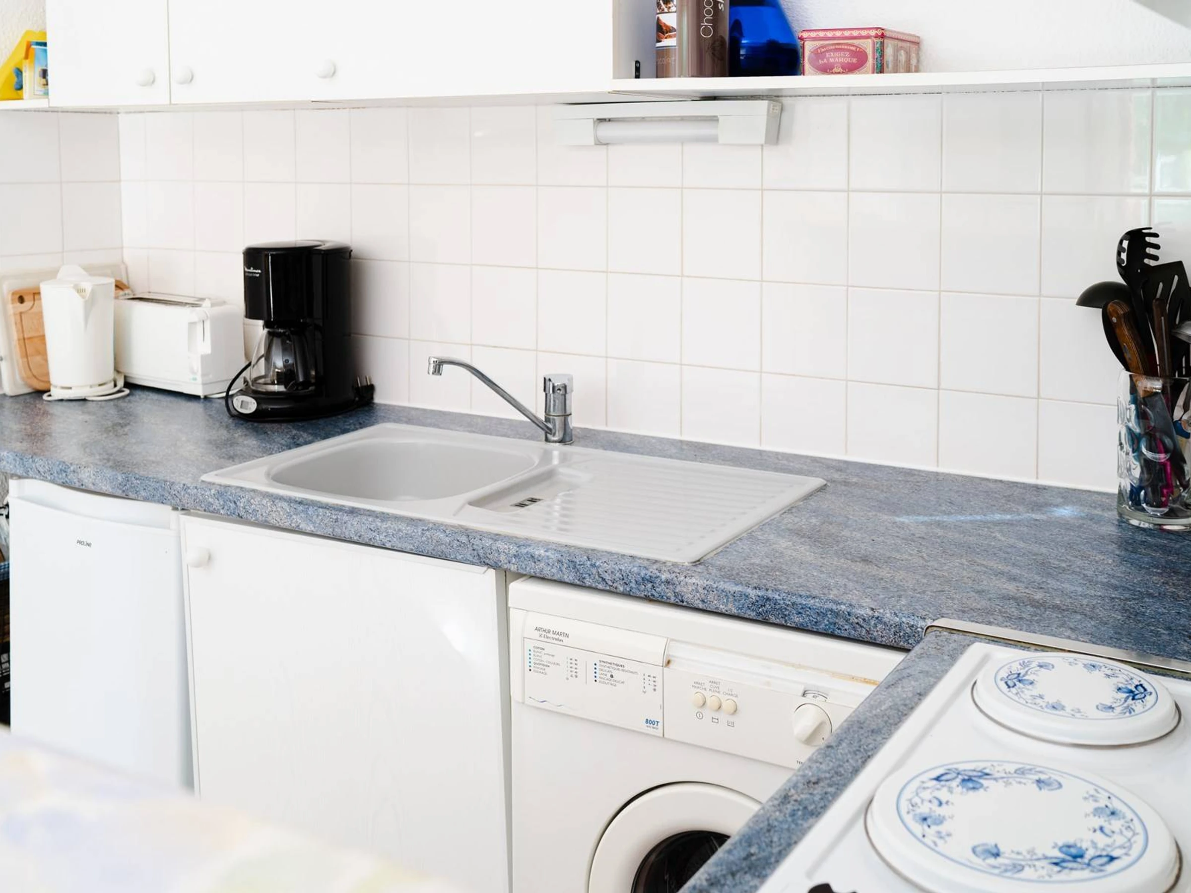 Ground floor : living room (couch, TV- german and french channels) with kitchenette (4 hot plates, fridge, oven, washing machine, microwave, Nespresso Coffee maker and normal coffe maker), separate toilet.