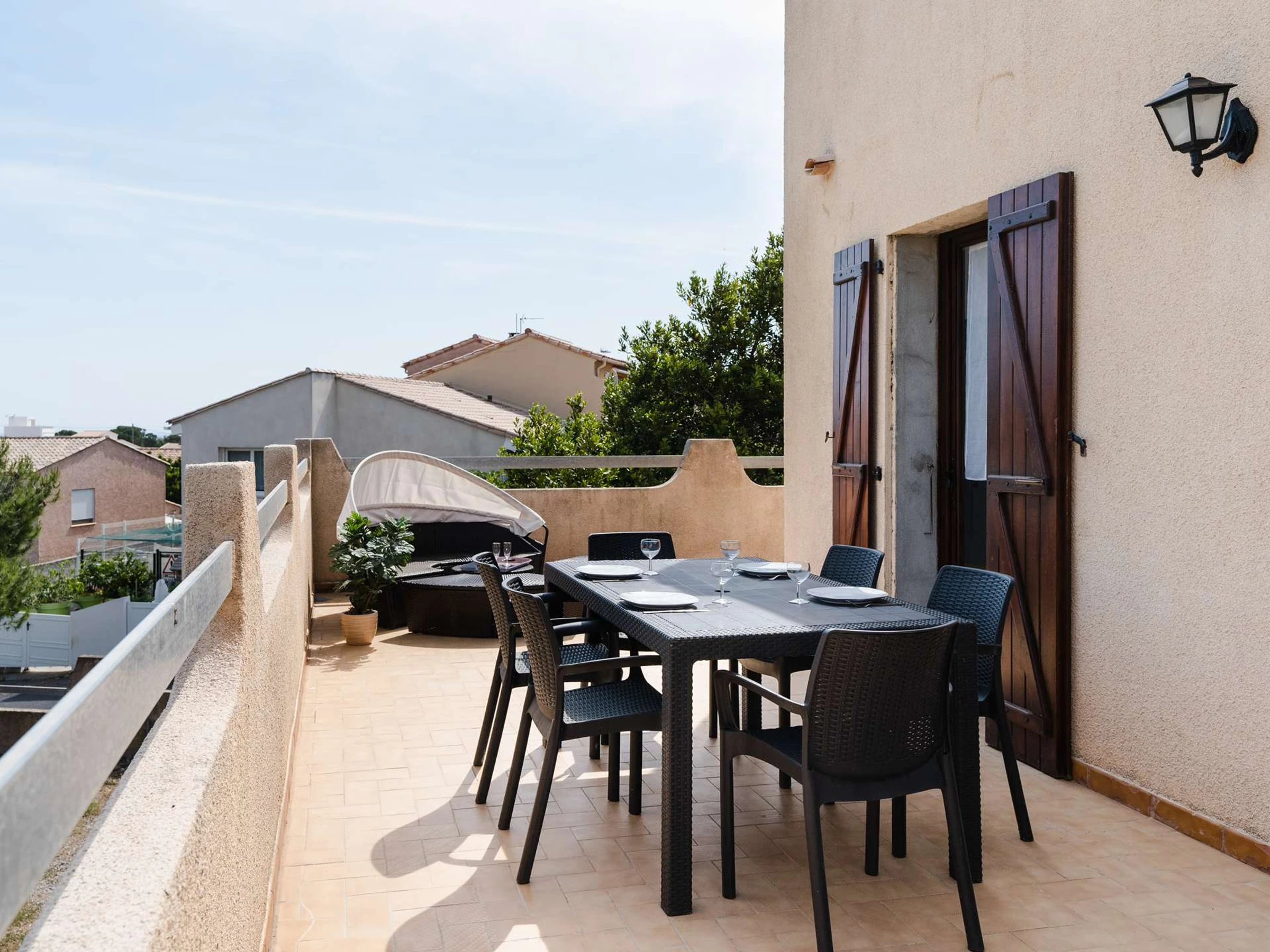 The staircase secured by 2 barriers leads to the first floor where there is a WC with hand-washer, a second bedroom with bunk beds (2x90x190) and cupboard, and a third bedroom with double bed (140x200) and storage space. Both bedrooms have access to a solarium with view on the Massif de la Clape and the sea. Free Wifi.