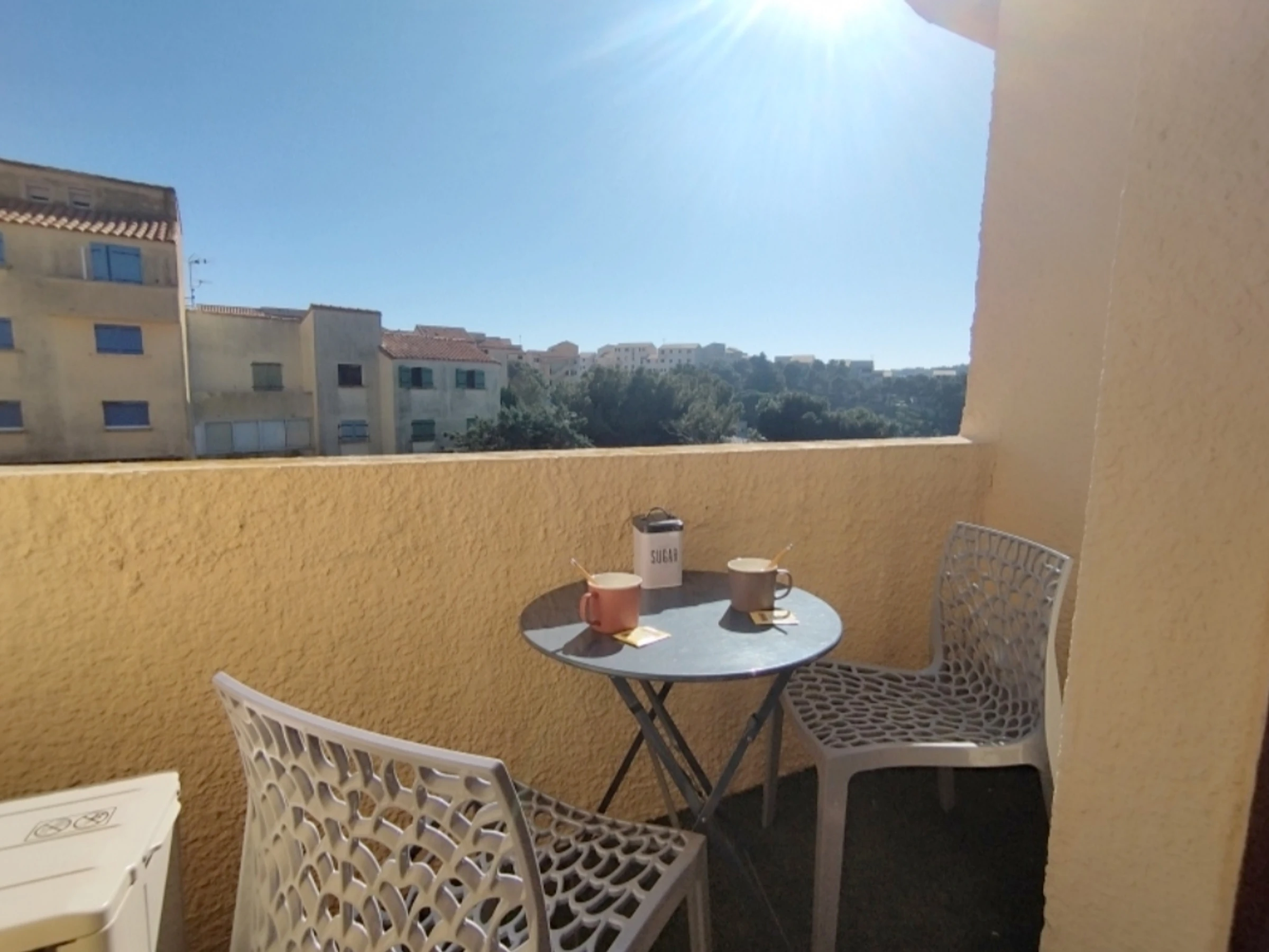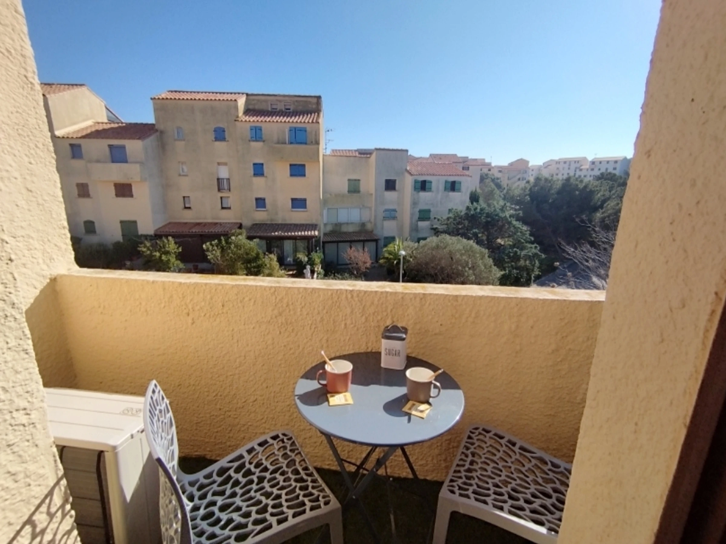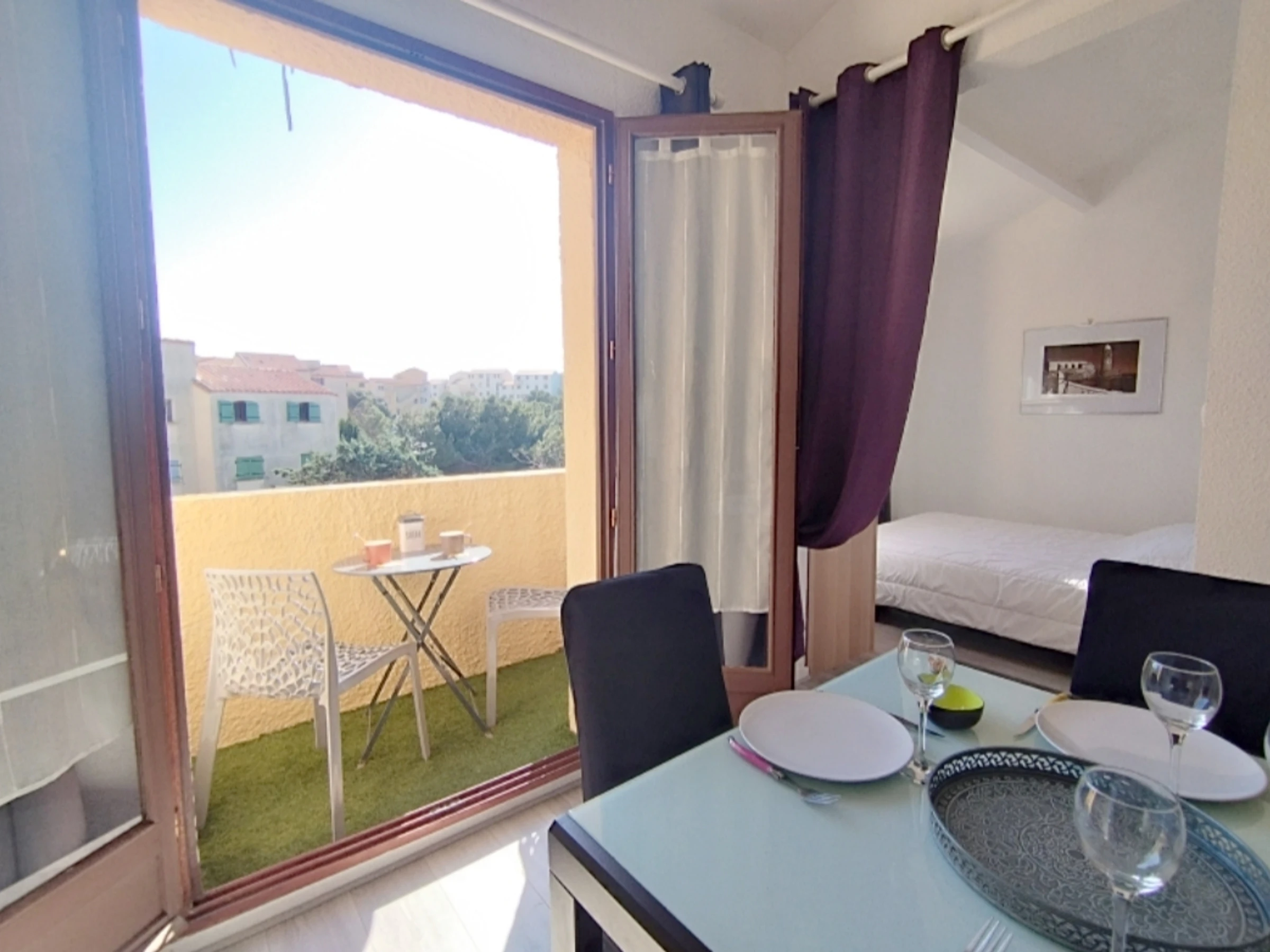 Spacious living room (double sofa bed) opening onto a bright balcony (awning). Equipped kitchenette.