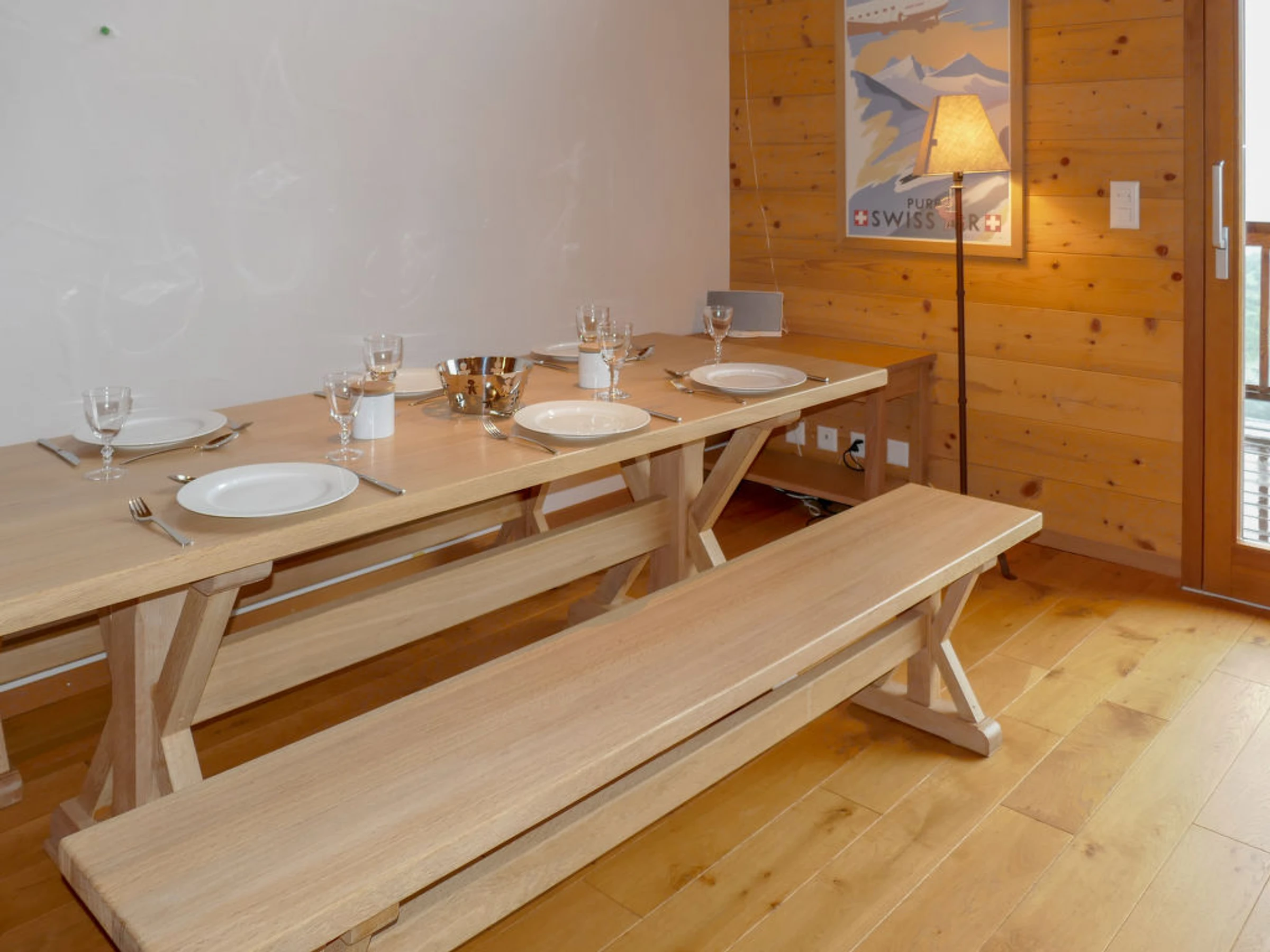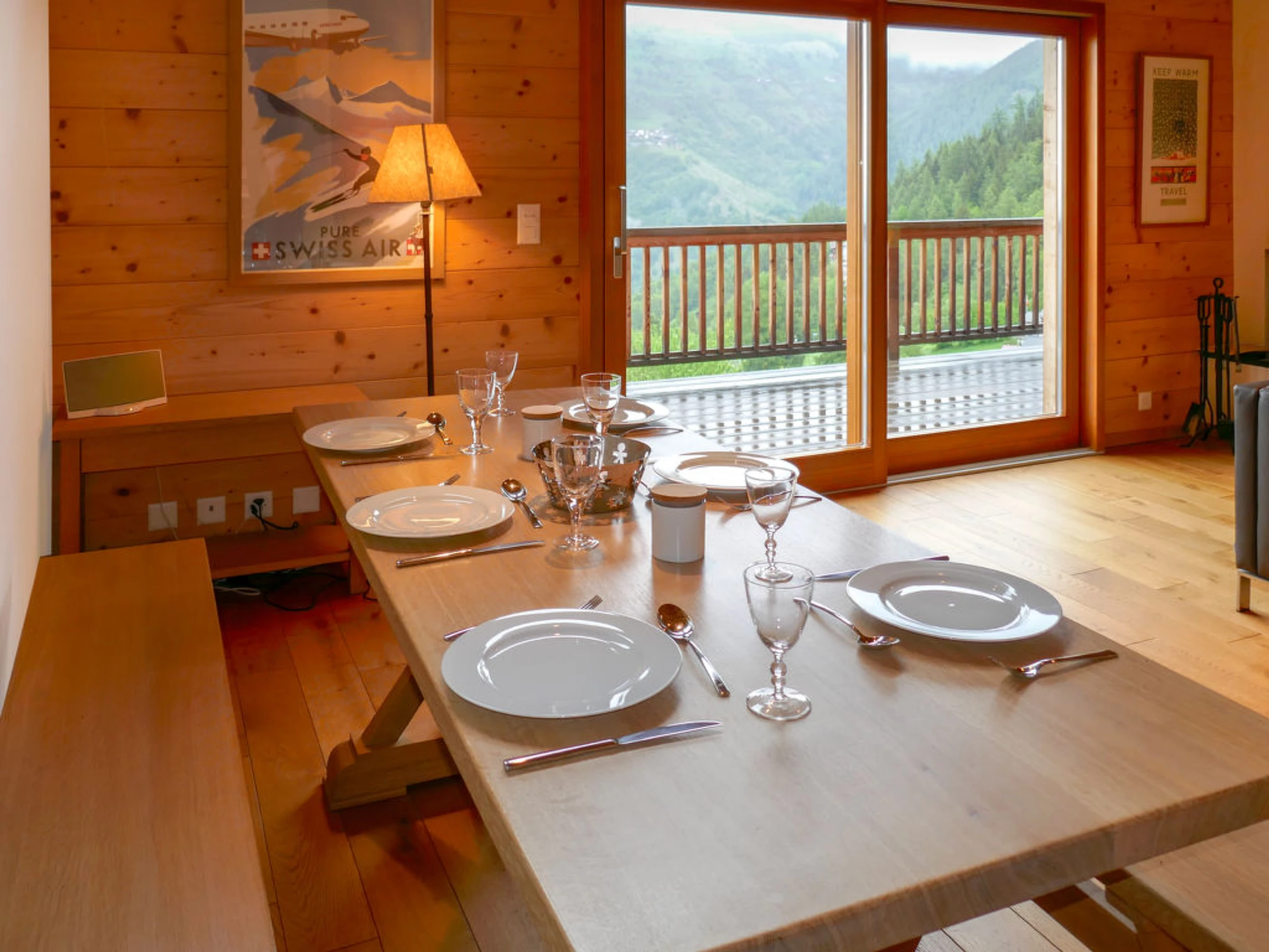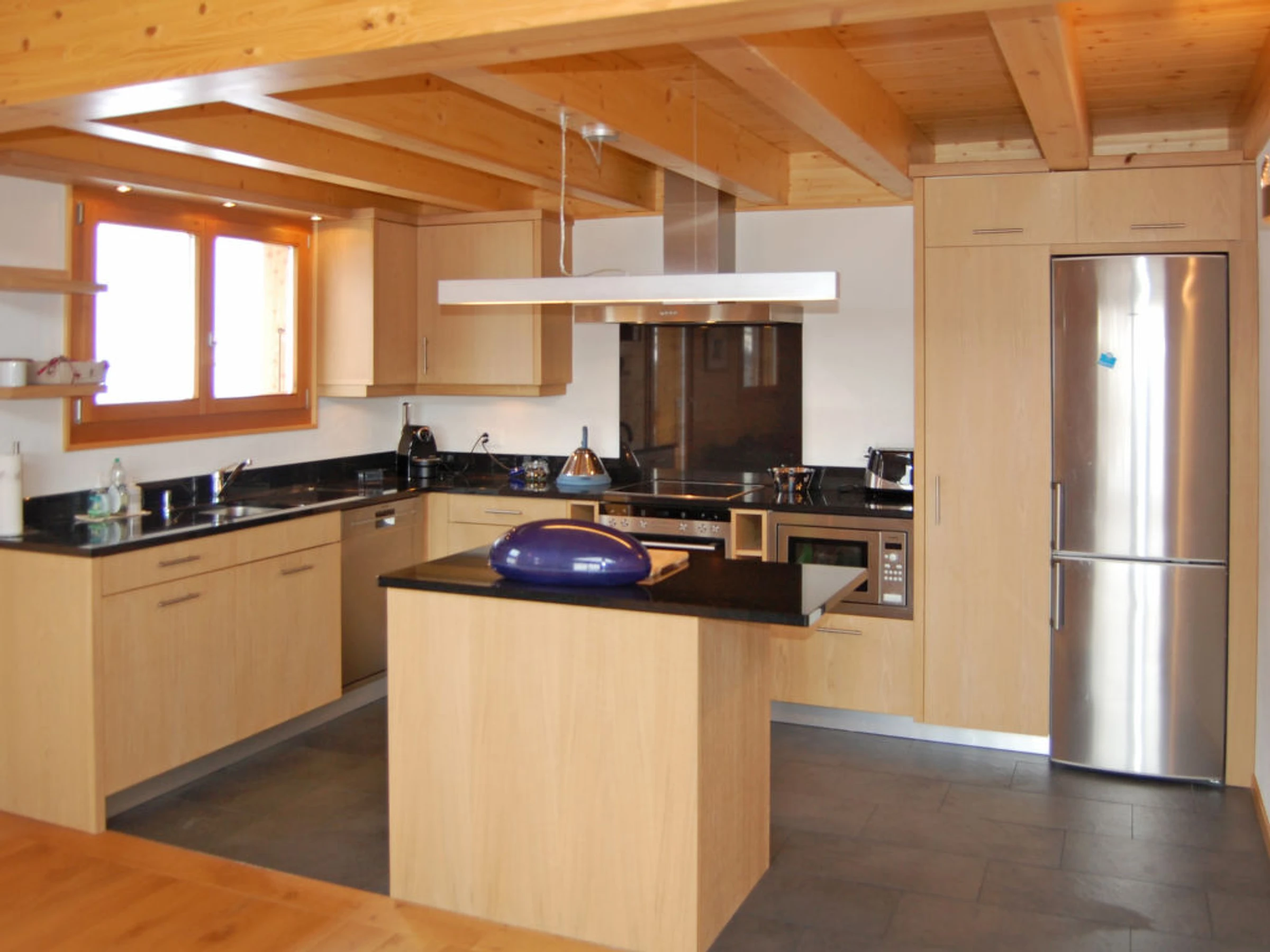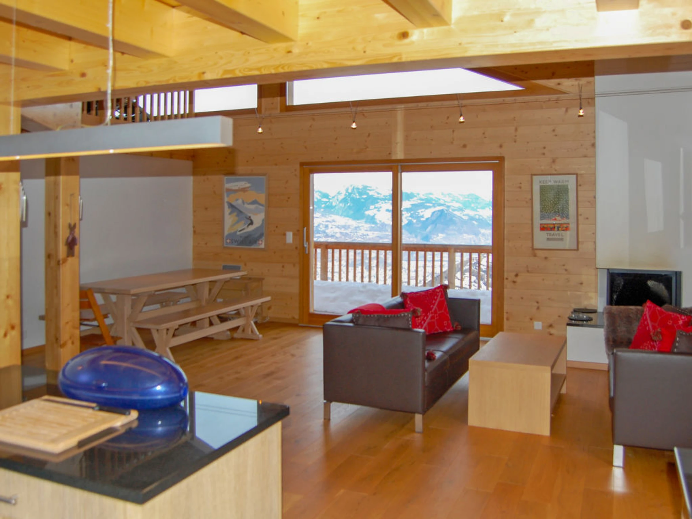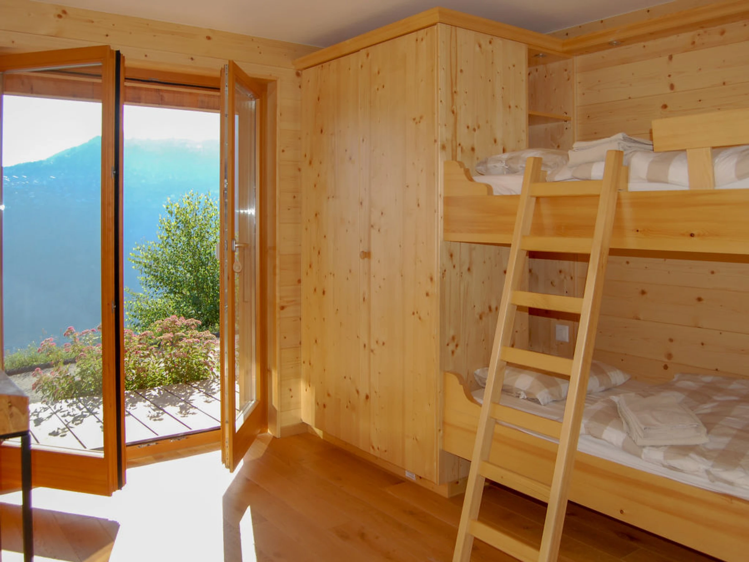 "Chocolat Chaud", 4-room chalet 180 m2 on 3 levels. Beautiful and modern furnishings: living/dining room with open-hearth fireplace and cable TV. Open kitchen (oven, dishwasher, 4 ceramic glass hob hotplates, microwave, freezer, electric coffee machine, Capsules for coffee machine (Nespresso) extra, fondue Set (chinoise, cheese)). Sep. WC. On the lower ground floor: 1 room with 1 french bed (160 cm, length 200 cm). 2 rooms, each room with 1 x 2 bunk beds (90 cm, length 200 cm). Bath/shower/WC, double hand-basin. Upper floor: gallery with cable TV and DVD. Balcony, north facing position terrace, east facing position, garden, west facing position and south facing position. Terrace furniture, barbecue, deck chairs (2). Beautiful view of the valley. Facilities: washing machine, children's high chair, baby cot. Internet (WiFi, free). IPod docking station. Reserved parking (2 cars). Please note: suitable for families. Non-smoking house. Piano. Included: Wireless internet access (WIFI), ERV assurance annulation gratuite Available on site with supplement: Highchair 4.39EUR per day, Cot (up to 2 years) 4.39EUR per day, Baby Buggy 4.39EUR per day Mandatory extra services on site: Local tax children (6-15) 1.25EUR per person/day, Local tax children (6-15) 1.75EUR per person/day, Local tax 3.5EUR per person/day, Local tax babies (0-2) (per person/day), Final cleaning 42.0EUR per person, Local tax 2.5EUR per person/day, Local tax children (3-5) (per person/day), Laundry (initial supply of bed linen and towels) 29.0EUR per person
