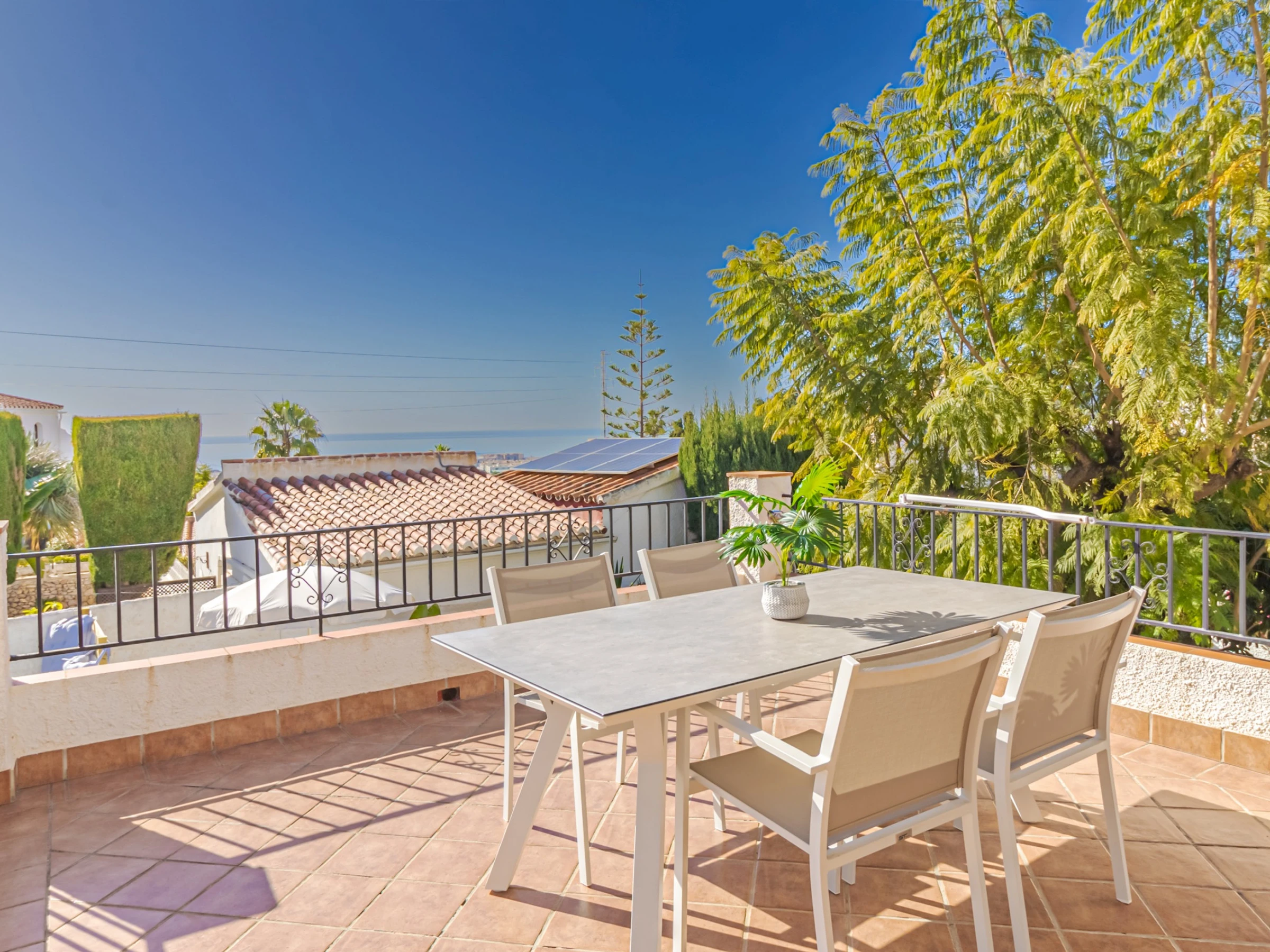 Spacious terrace with panoramic sea views, furnished for al fresco dining and lounging.