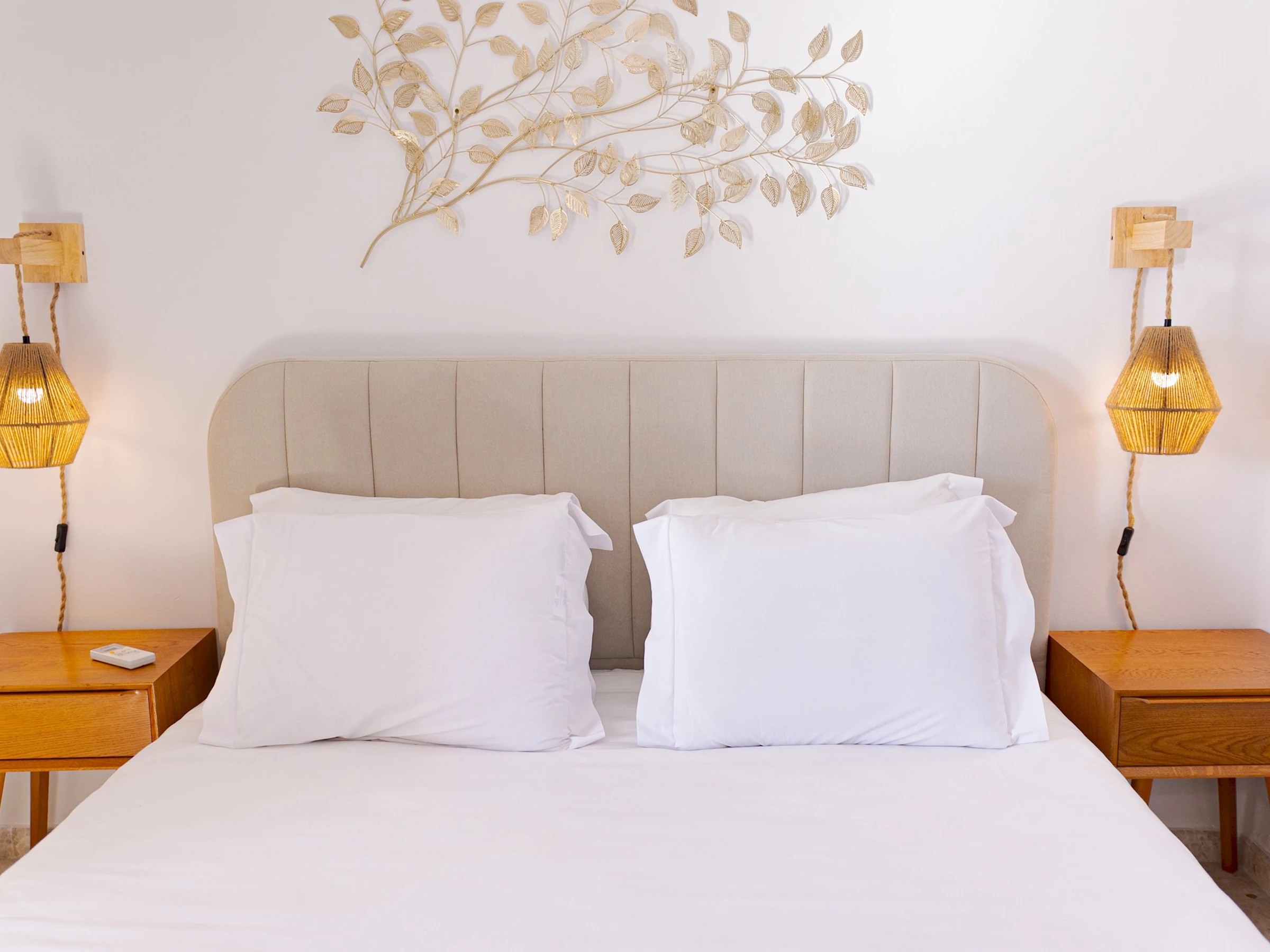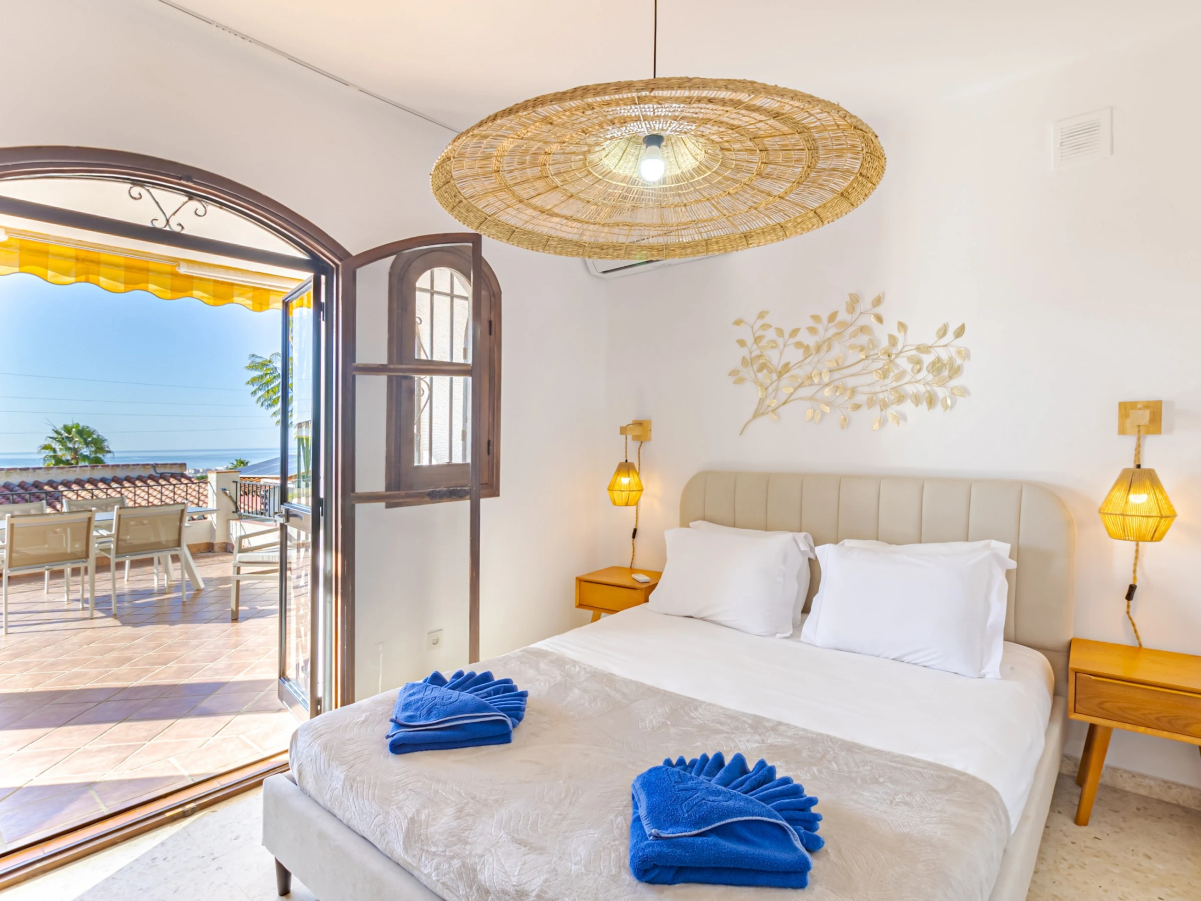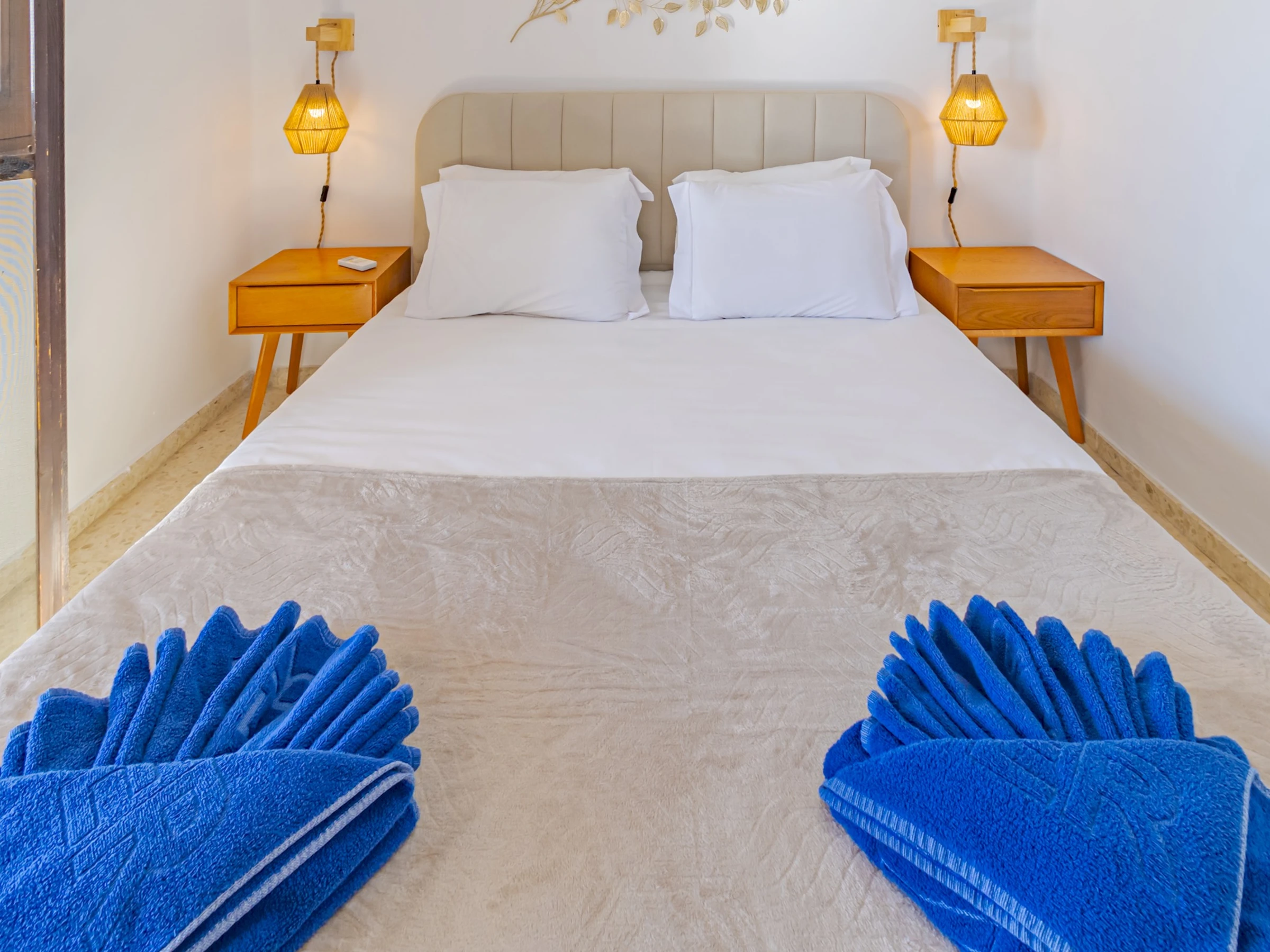 Master Bedroom: Features a comfortable double bed, tastefully decorated with modern touches, and opens directly onto a private terrace with beautiful sea views — perfect for morning coffee or evening relaxation.