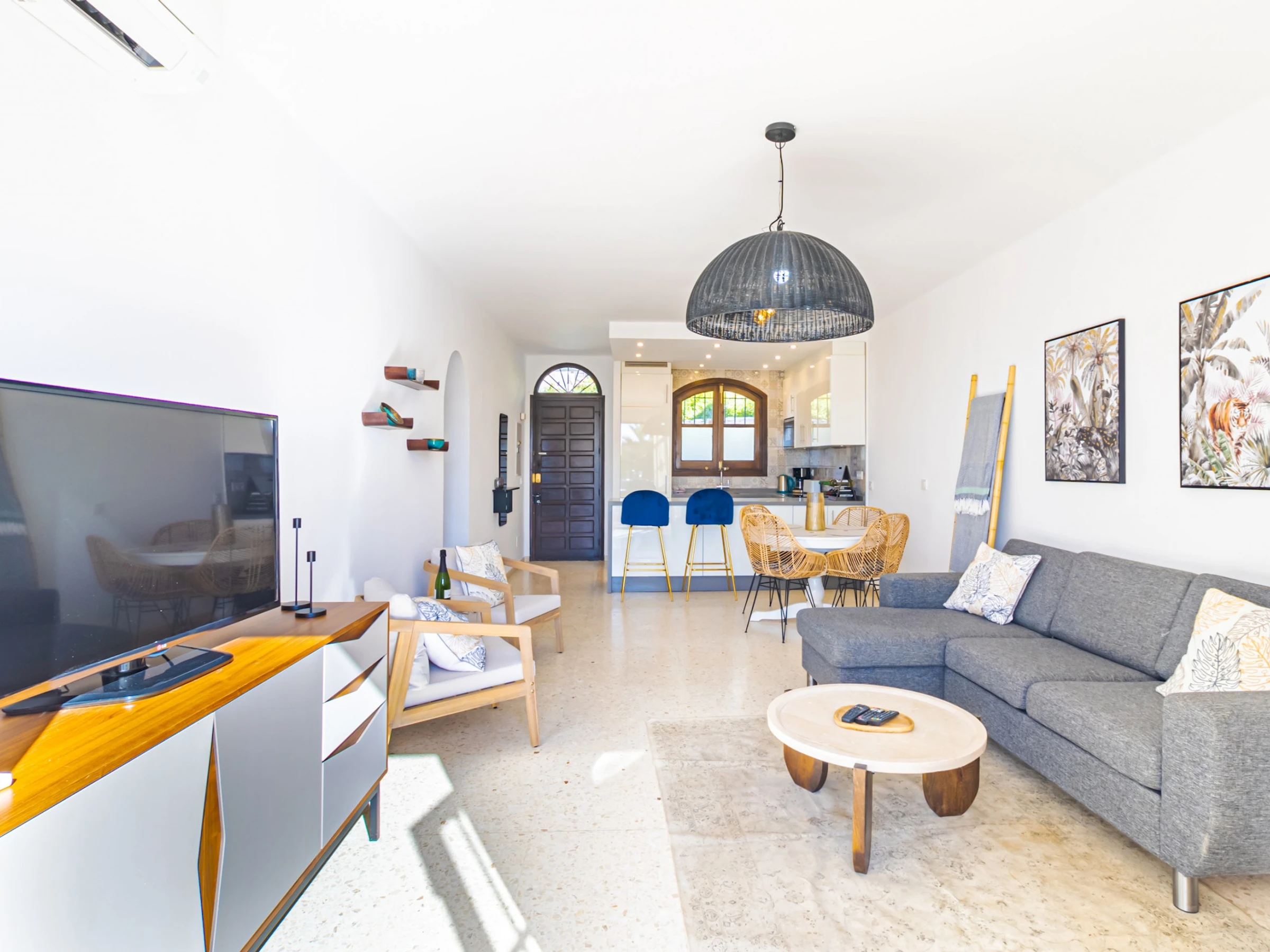 The main house features a bright, open-plan living space with comfortable seating, ideal for relaxing or enjoying movie nights.