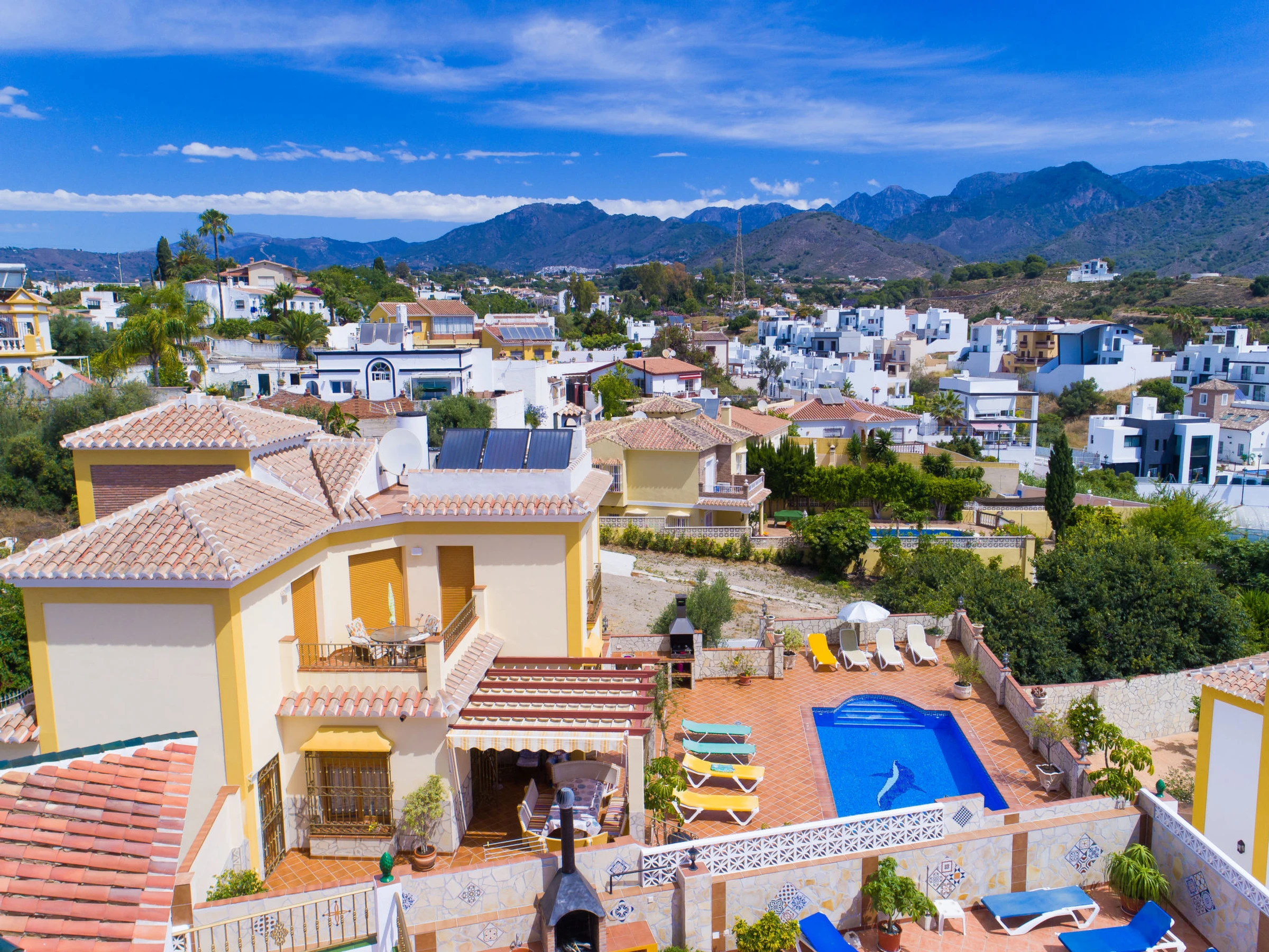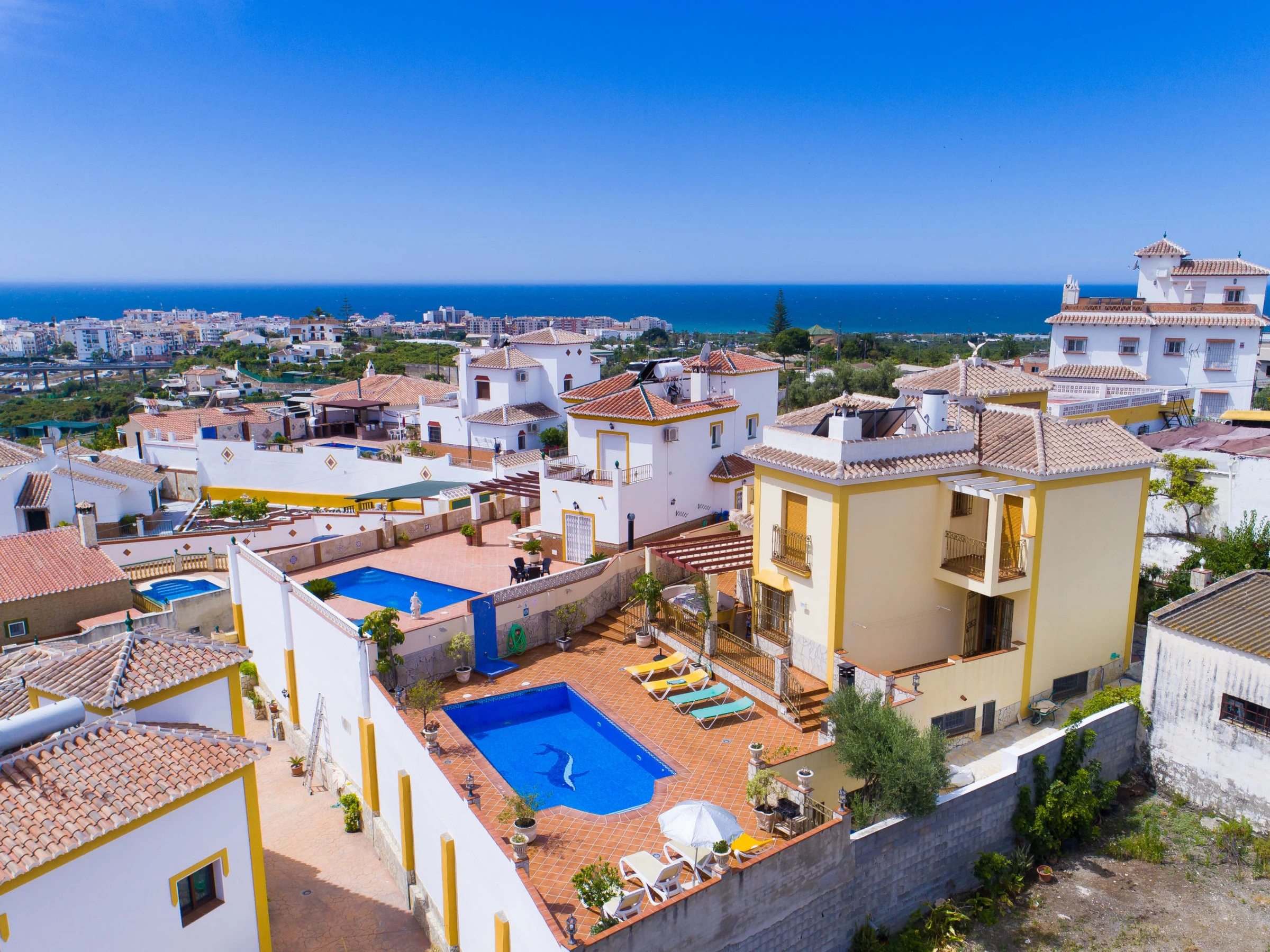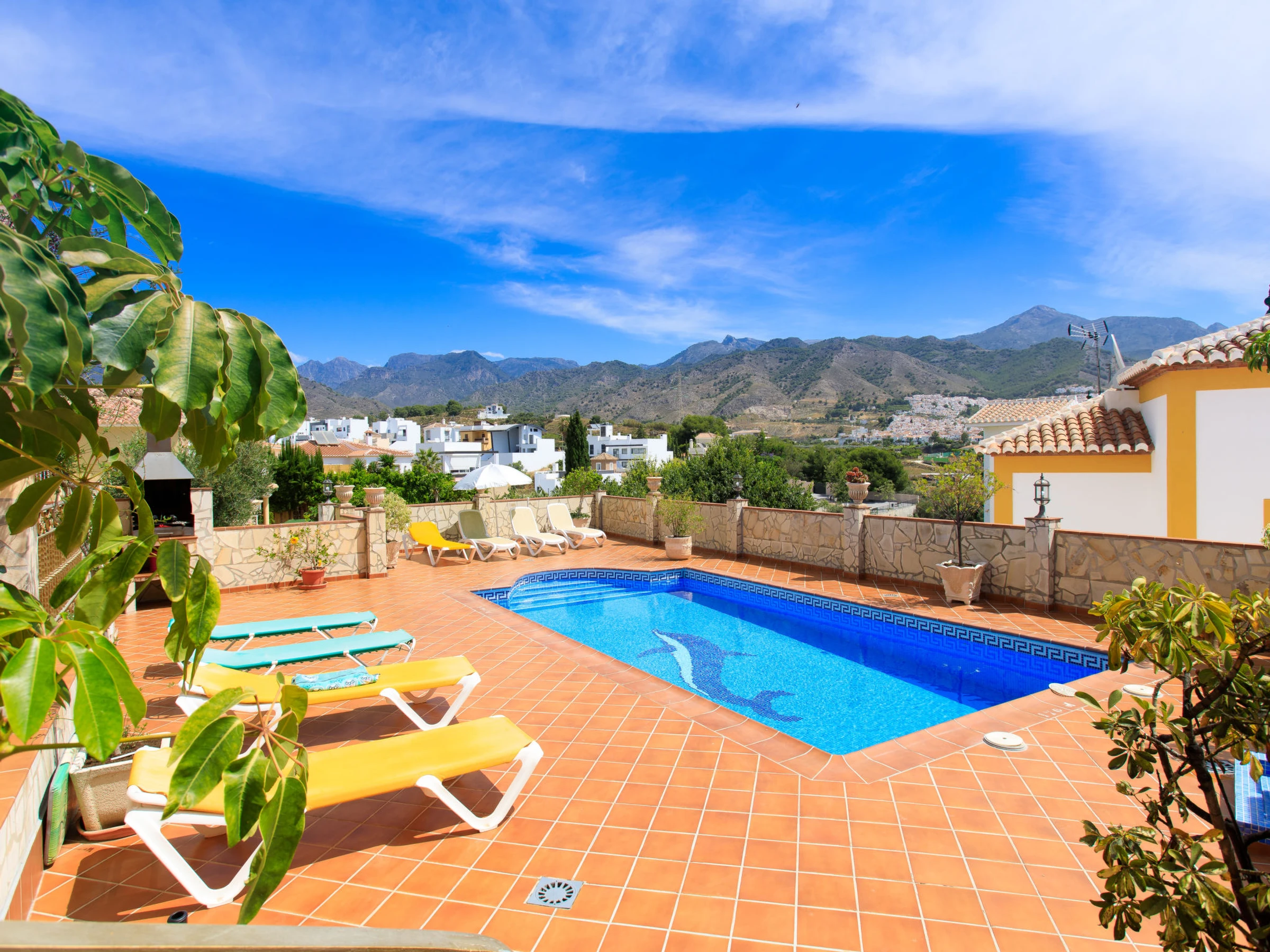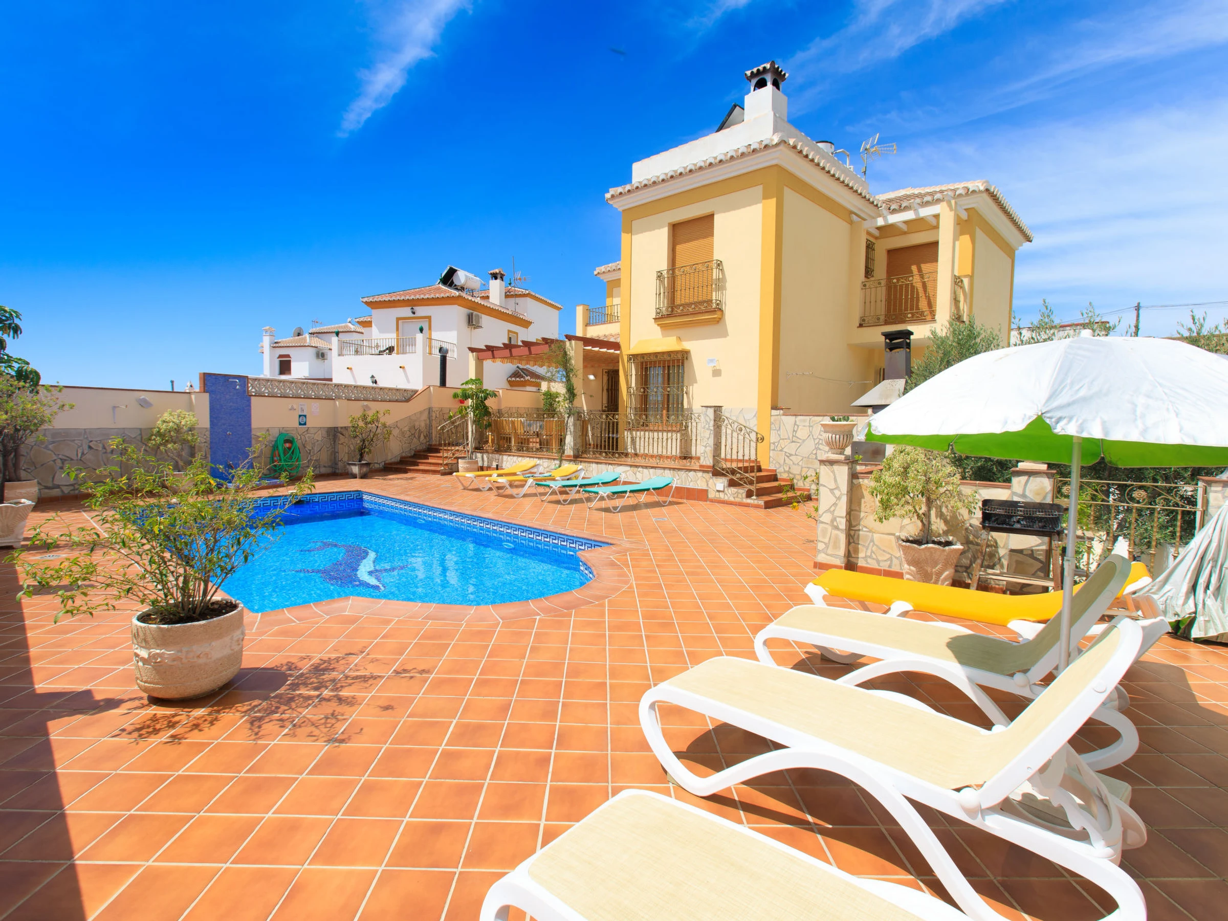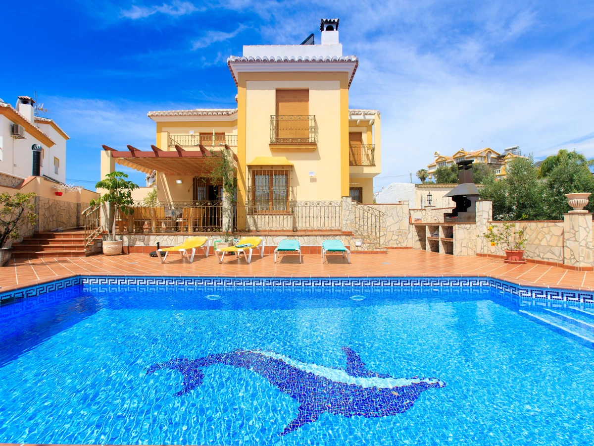 Nerja 2 km from Nerja: Beautiful, comfortable house "Loren", 3 storeys. Outside the resort, 2 km from the centre of Nerja, in a sunny position residential area (villas), 2 km from the beach. Private: swimming pool angular (8 x 4 m, depth 100 - 200 cm,[hidden].). Outdoor shower, pergola, terrace (300 m2), garden furniture, barbecue. In the house: washing machine. Shop 500 m, grocery 2 km, supermarket 500 m, shopping centre 25 km, restaurant 1 km, bakery 500 m, café 1 km, pedestrian zone 2 km, bicycle rental 2 km, bus stop "Nerja" 1.5 km, railway station "Malaga" 50 km, sandy beach "Burriana" 2 km, diving center 2 km. Sports harbour 25 km, marina 25 km, golf course (28 hole) 27 km, surf school 25 km, sailing school 25 km, tennis 2 km, riding stable 1 km. Nearby attractions: Frigiliana, Nerja, Maro, La Herradura, Malaga, Granada. Well-known ski regions can easily be reached: Sierra Nevada. Well-known lakes can easily be reached: La Viñuela. Hiking paths: Sierra Tejeda, Sierra de Almijara. Groups of teenagers on request only. Please note: Loading and unloading of baggage is possible at the holiday house. Property ref. es5405.398.1 is situated on the same property.