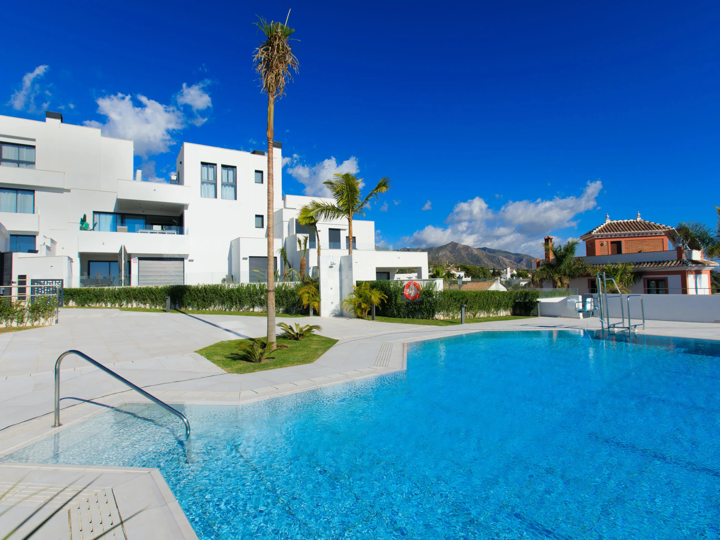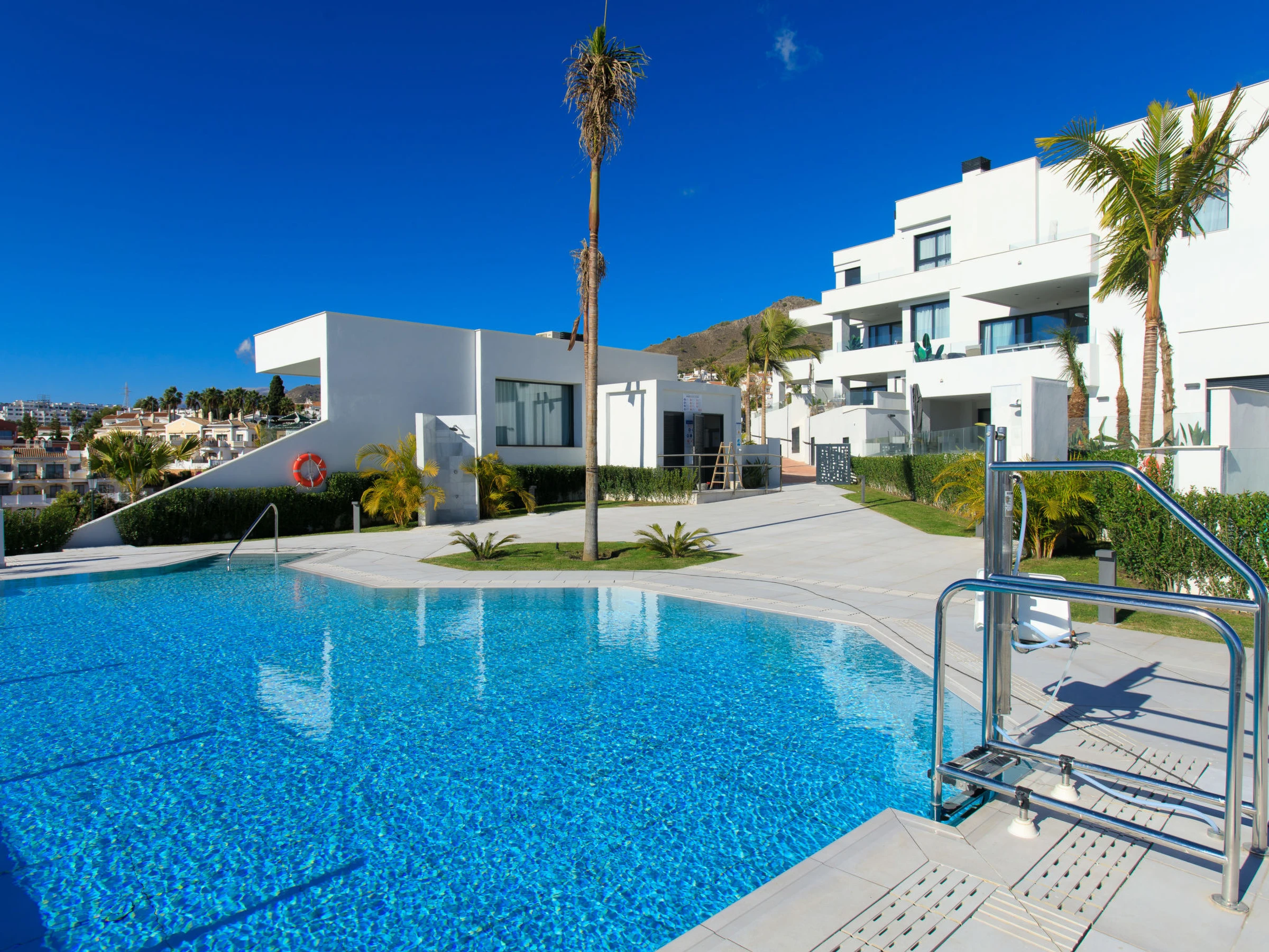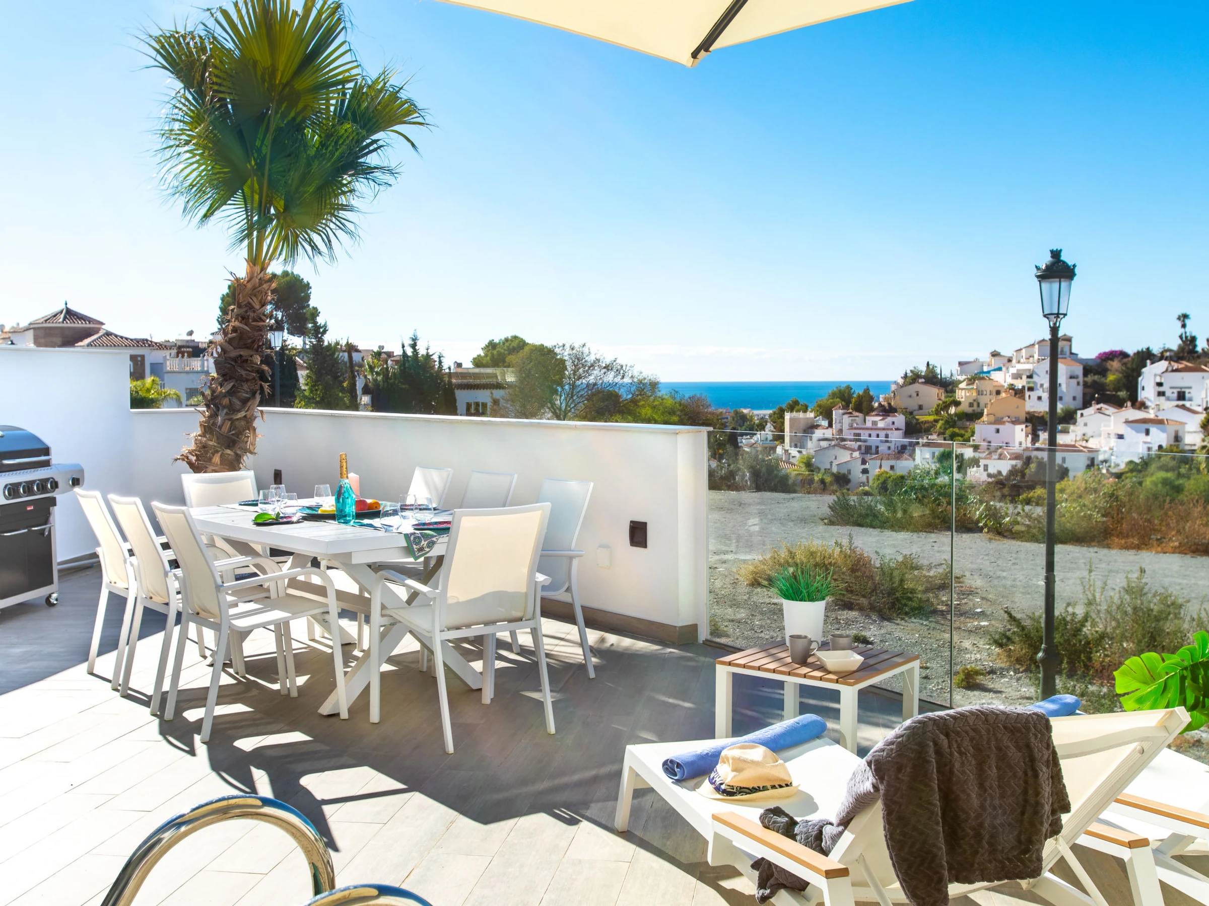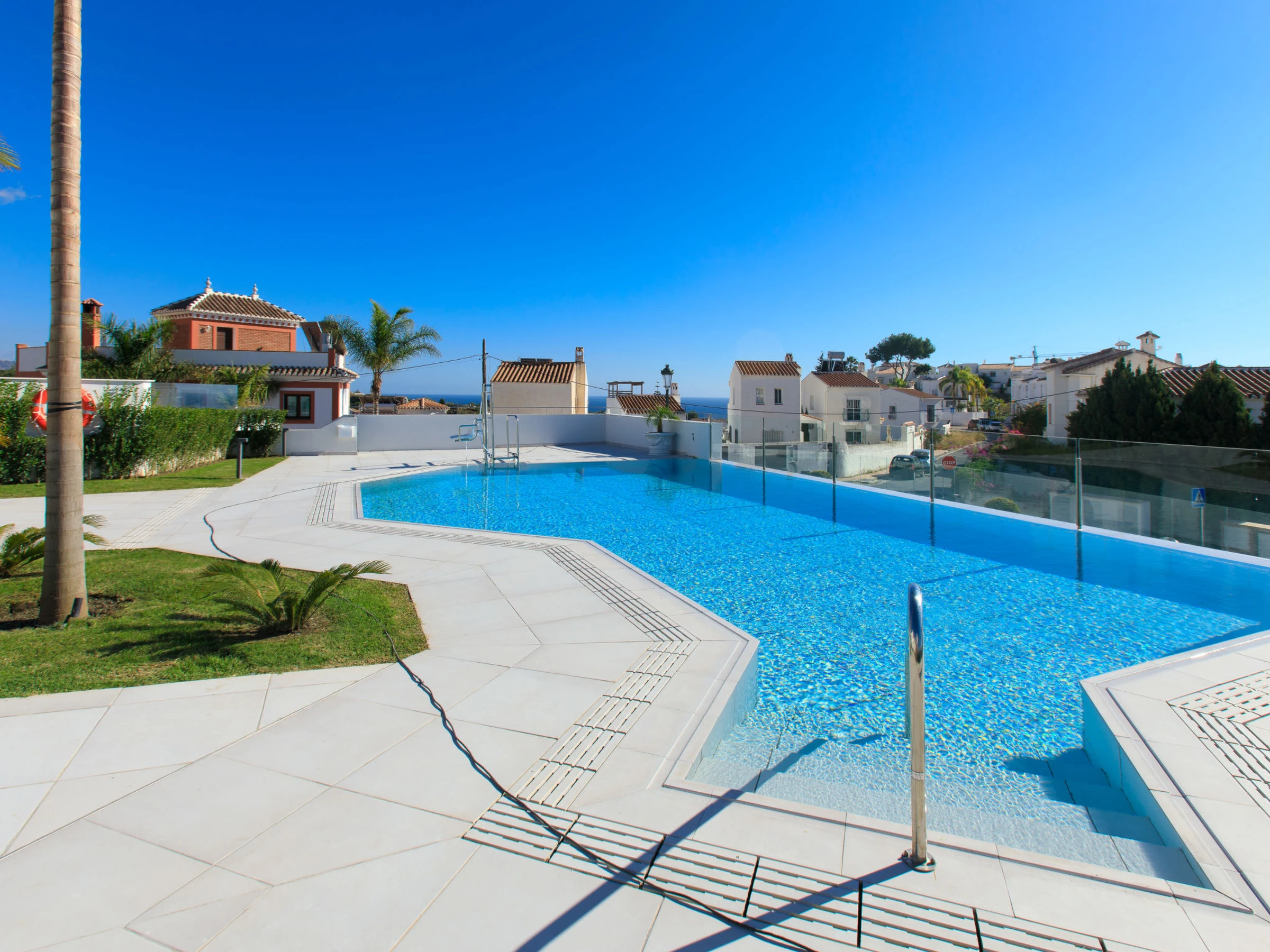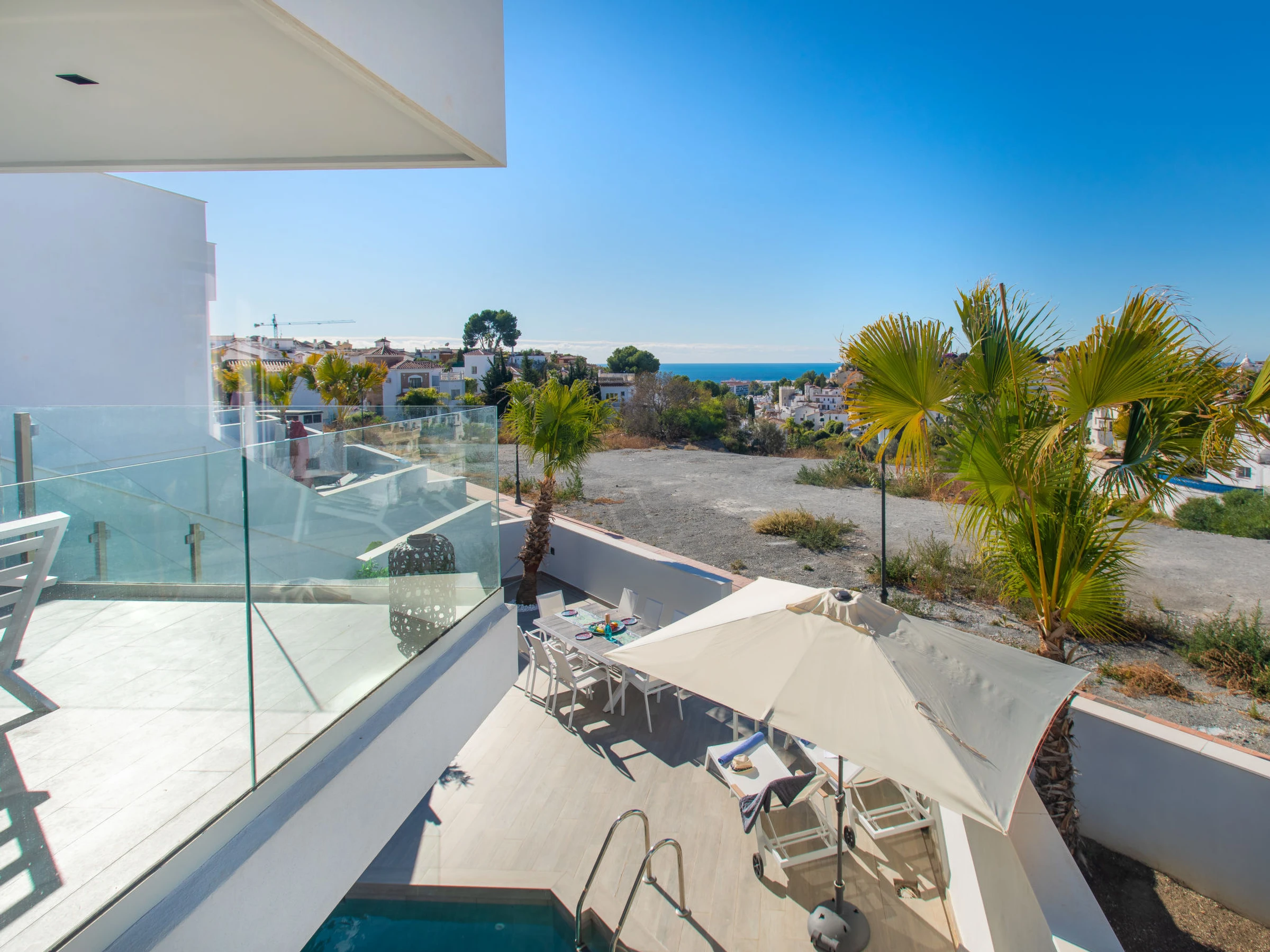 Nerja: Large, modern, beautiful house "Royal Palm", 3 storeys. In the resort 1.6 km from the centre of Nerja, in a sunny position residential area (villas), 500 m from the sea, 500 m from the beach, south facing position. For shared use: swimming pool angular (5 x 10 m, depth 97 - 162 cm, seasonal availability: [hidden] - [hidden], extra 30 per day). Private: swimming pool heated (2 x 3 m, seasonal availability: [hidden] - [hidden] In the house: washing machine. Parking, single garage. Shop, grocery, supermarket 300 m, shopping centre 20 km, restaurant, bar, bakery, café, internet café 300 m, bicycle rental 500 m, pub garden 300 m, bus stop 150 m, sandy beach "Burriana" 500 m. The owner does not accept any youth groups. Please note: Loading and unloading of baggage is possible at the holiday house.