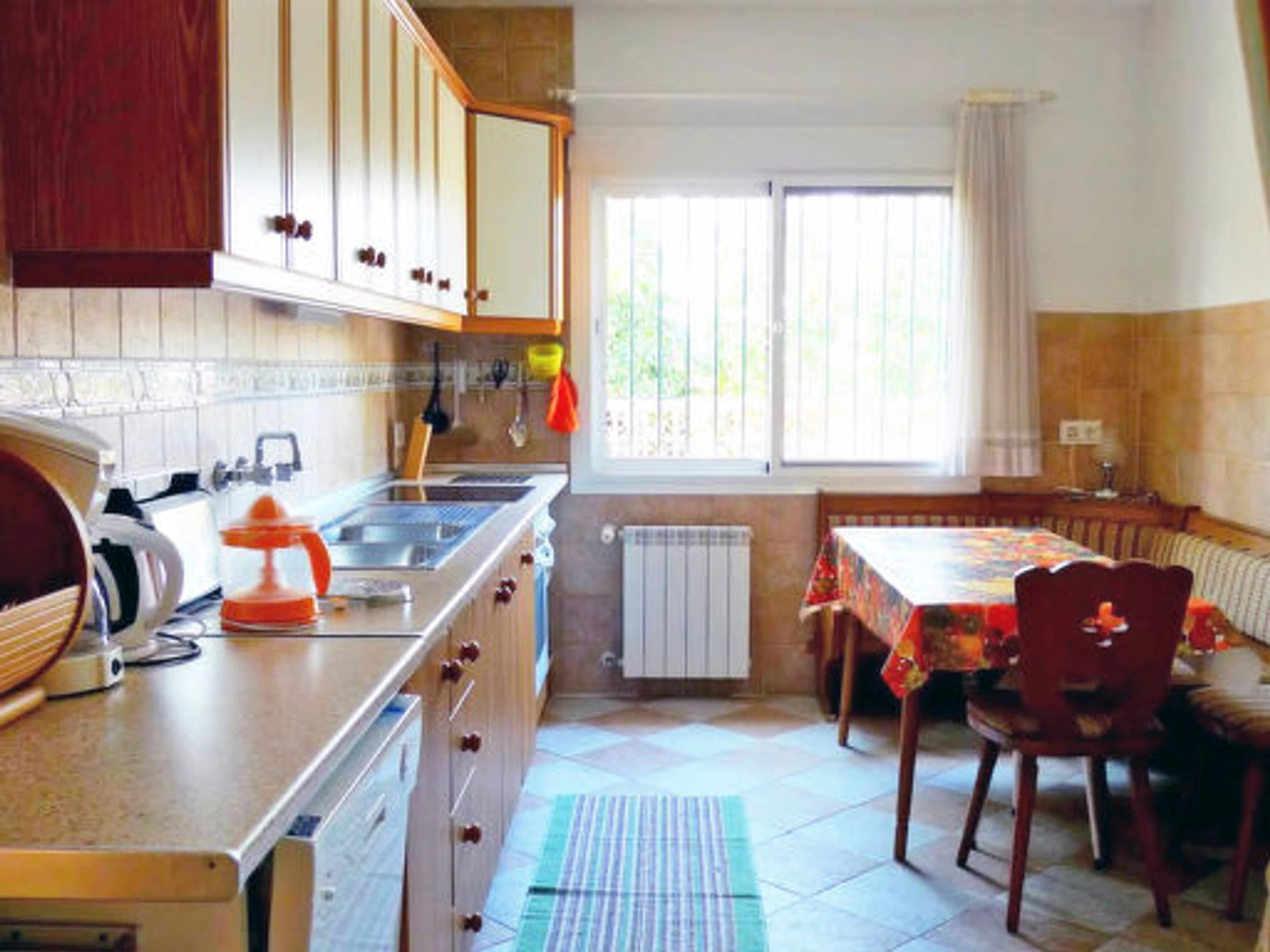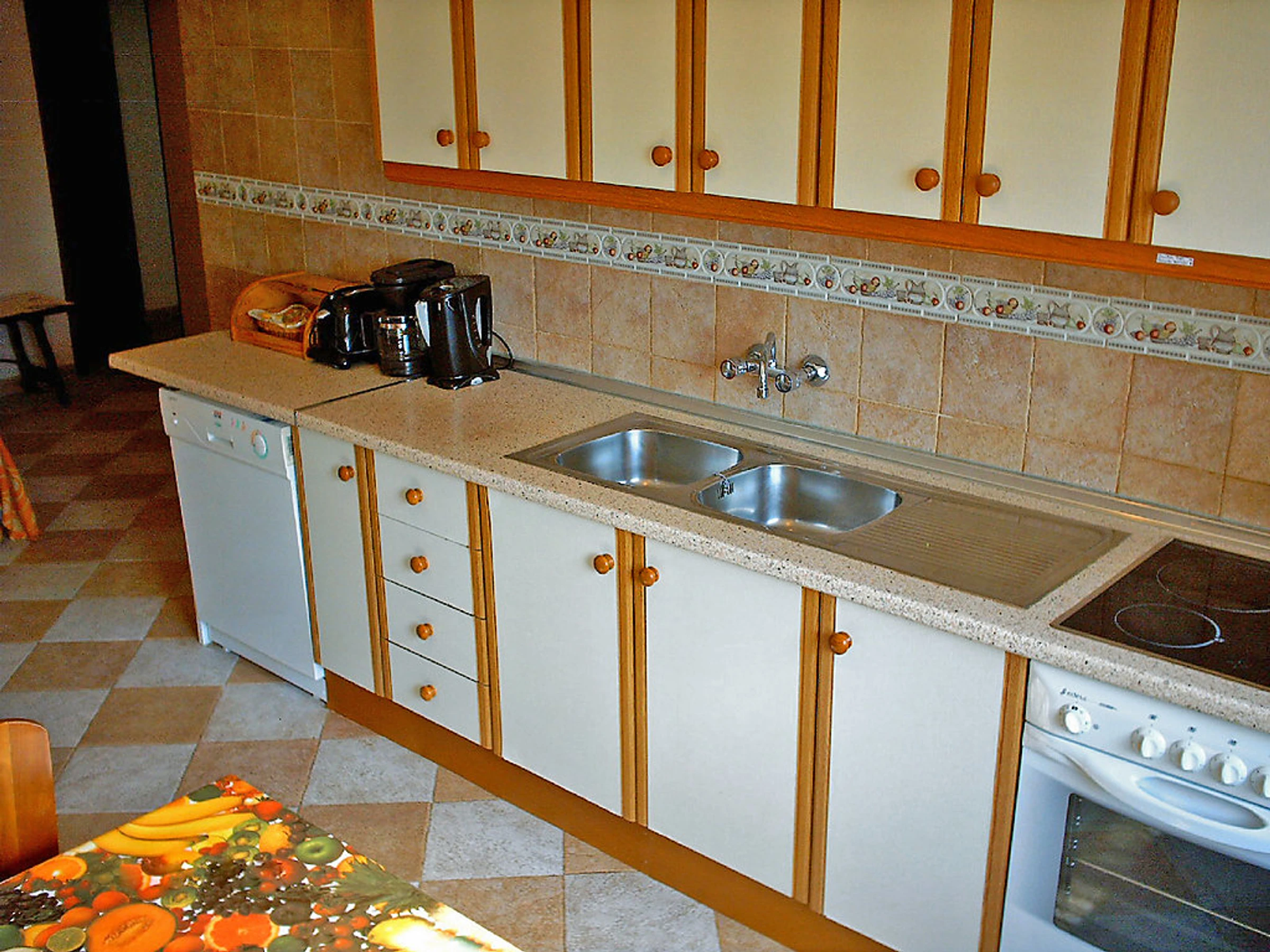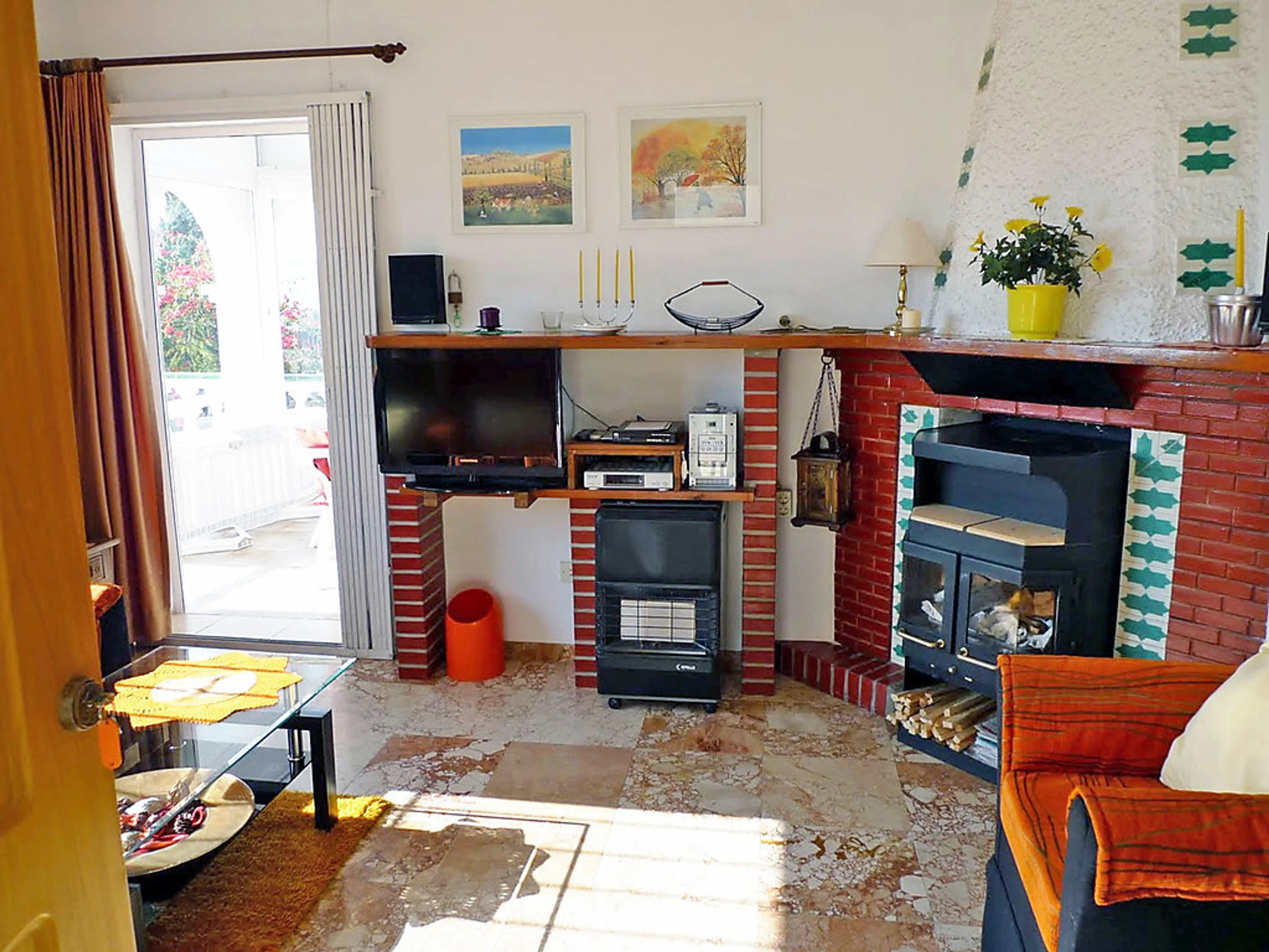 4-room apartment 80 m2. Comfortable furnishings: living room with open-hearth fireplace, satellite TV and hi-fi system. Exit to the terrace, south facing position. 1 room with 1 bed. 1 room with 1 french bed. 1 room with 1 french bed. Kitchen (oven, dishwasher, microwave, freezer) with dining table. 2 showers/WC. Terrace partly roofed. Terrace furniture, deck chairs. Facilities: safe. Internet (WiFi, free). Garage. TV with Astra satellite and local channels. ADSL internet connection (cable). The kitchen has a ceramic hob.