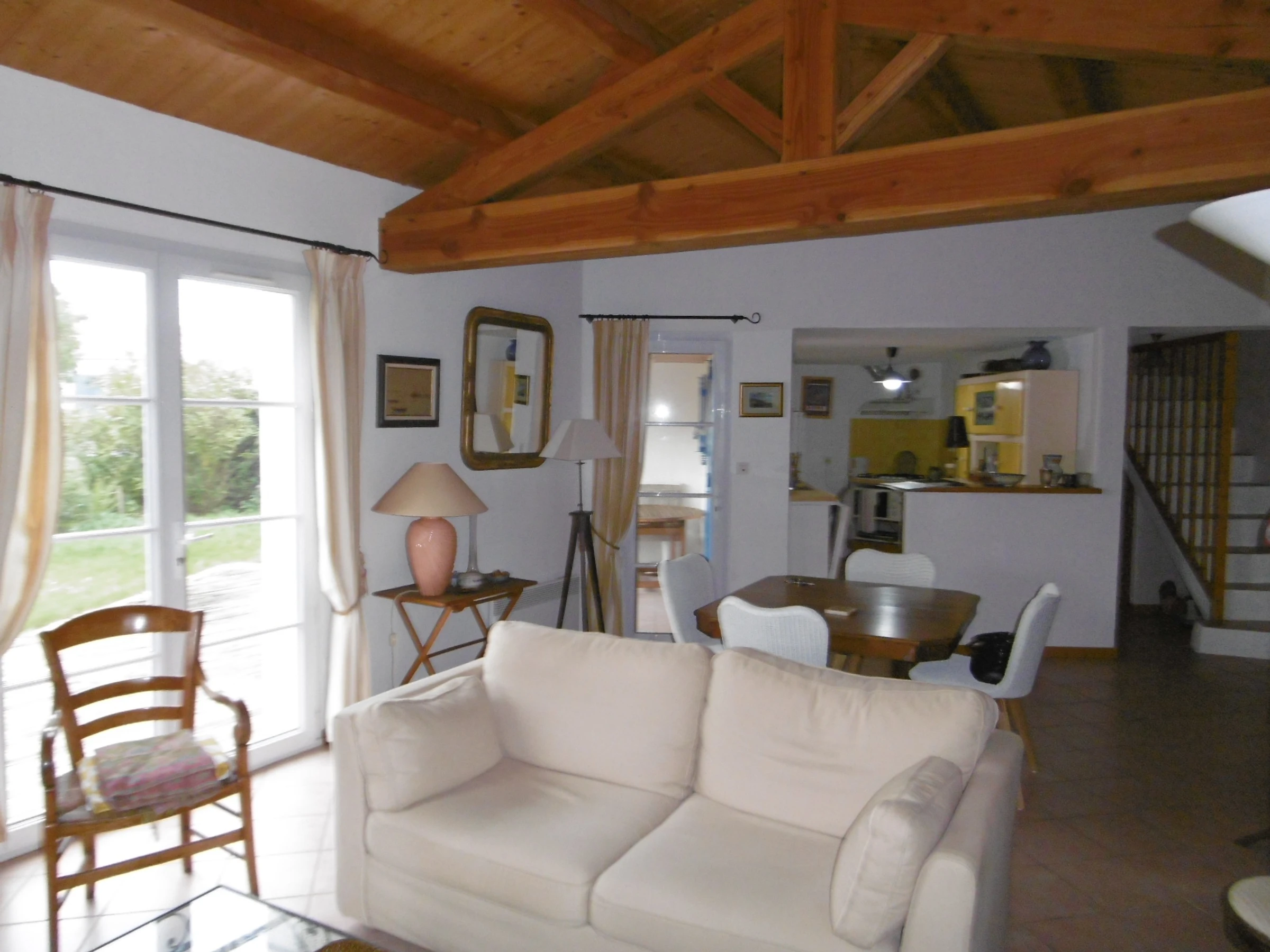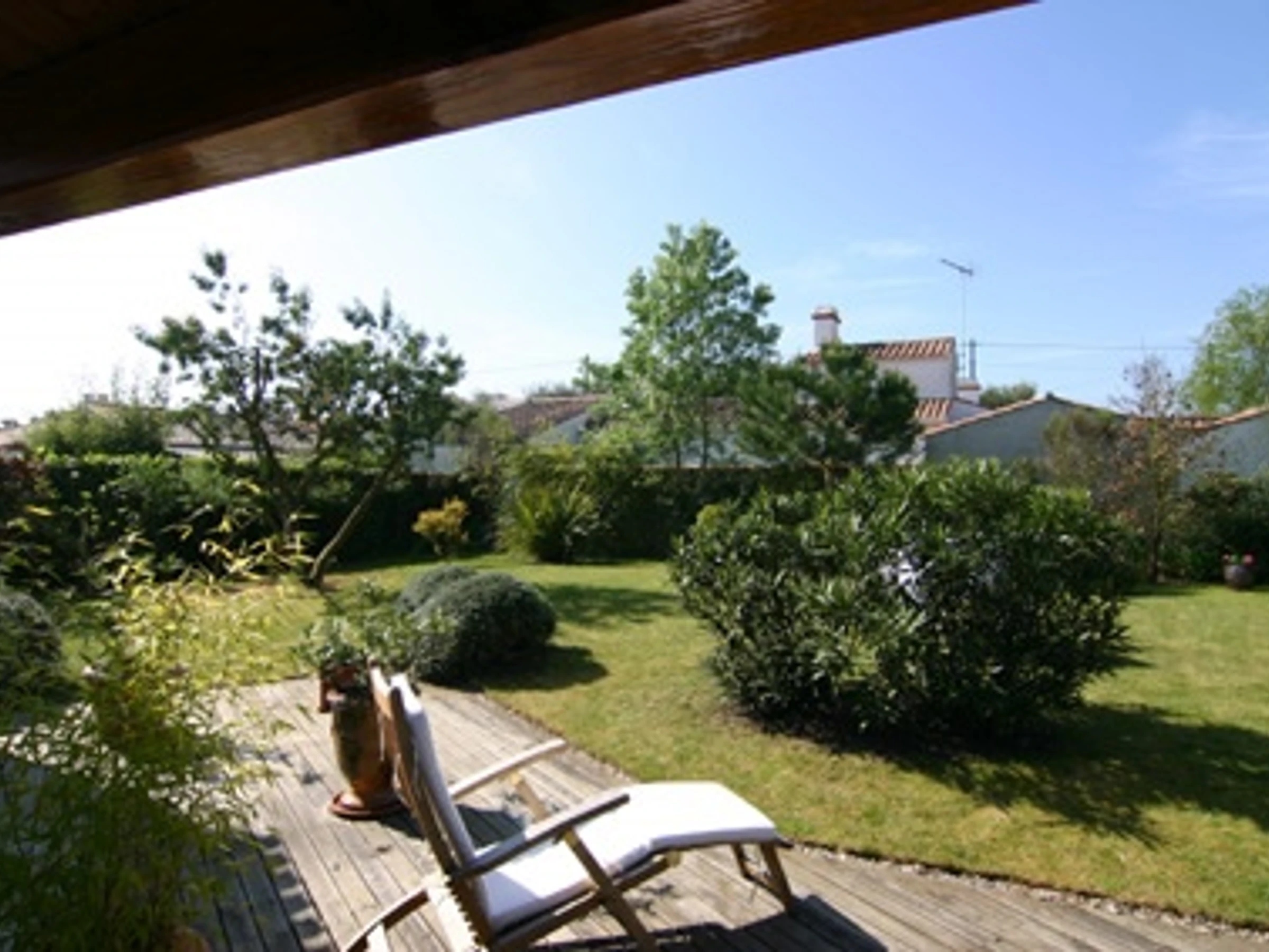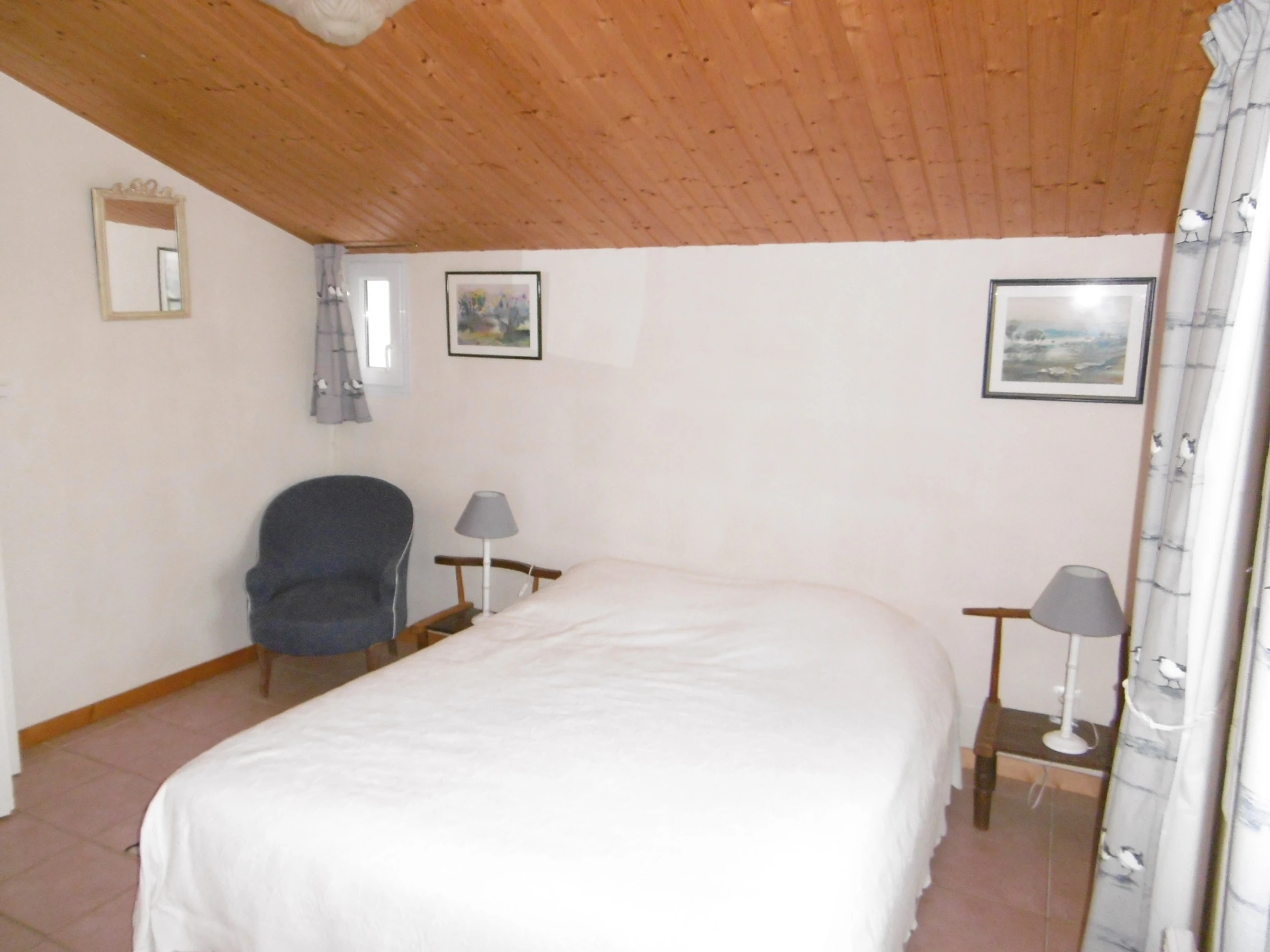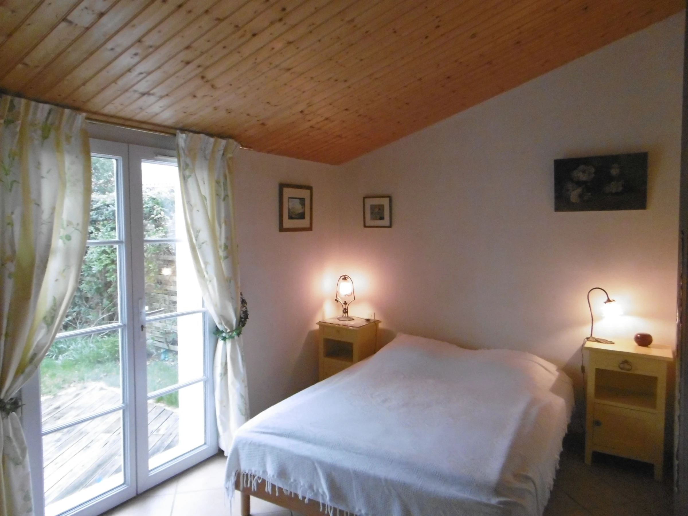 Pleasant, comfortable, detached two-story house in a quiet area at the end of a cul-de-sac in an enclosed, wooded, and flowered garden - approximately 90 m² - Sleeps 5. It includes a living room with a sitting area and fireplace, an open-plan equipped kitchen, a bedroom with a 140 cm bed opening onto a terrace and garden, a bedroom with a 90 cm bed, a bathroom, and a separate toilet with a washbasin. Upstairs: a bedroom with a 140 cm bed with a private bathroom with shower, sink, and toilet. Dishwasher, washing machine, Wi-Fi. Refrigerator with freezer compartment and 3 gas burners with an electric hob. Covered patio with wooden deck and garden furniture, barbecue, and deckchairs. Garage for bicycle storage. Private parking in front of the gate. No pets allowed. Cleaning service available: €108. Optional services not included, to be reserved 1 month prior to arrival and subject to availability: