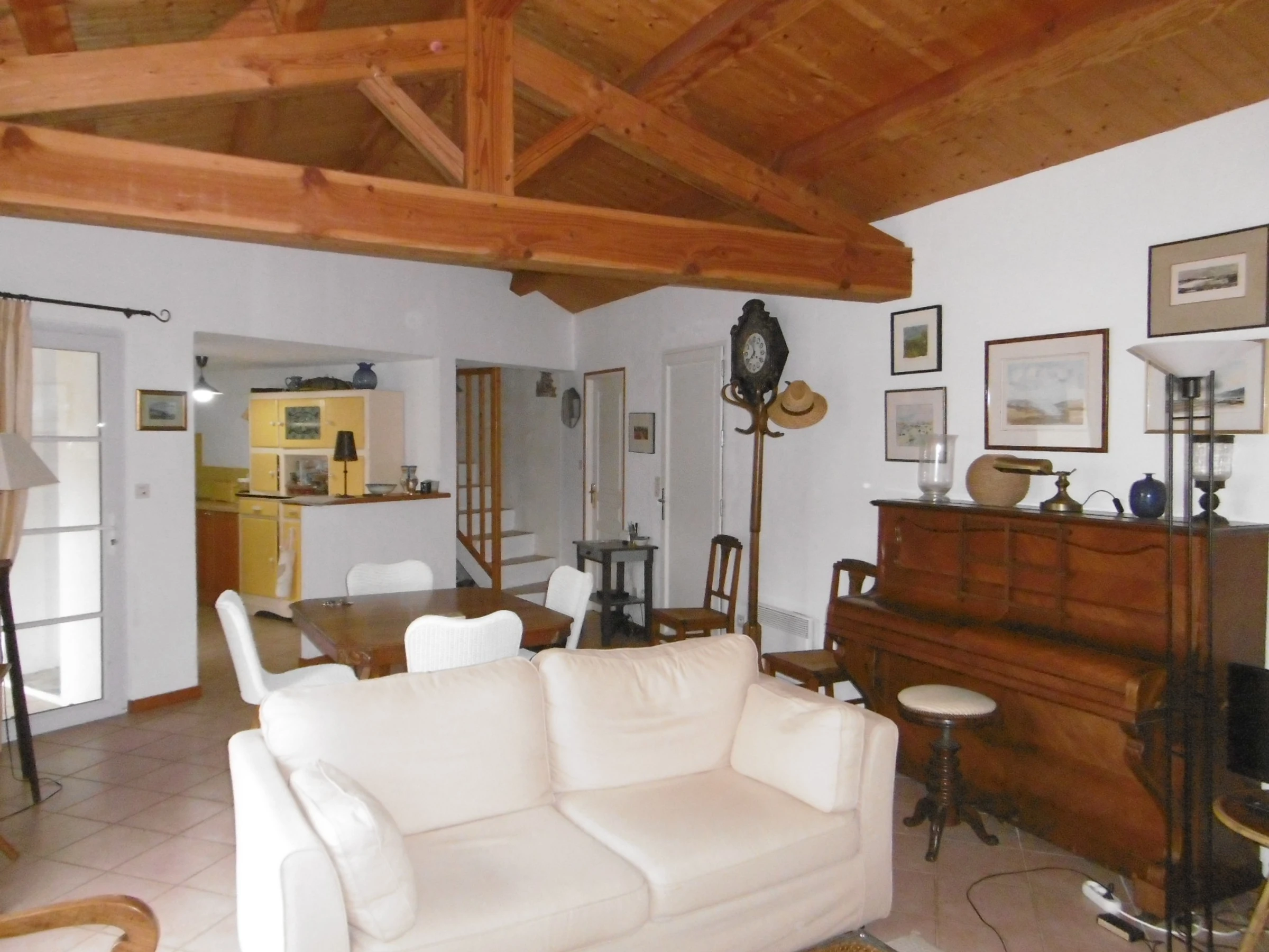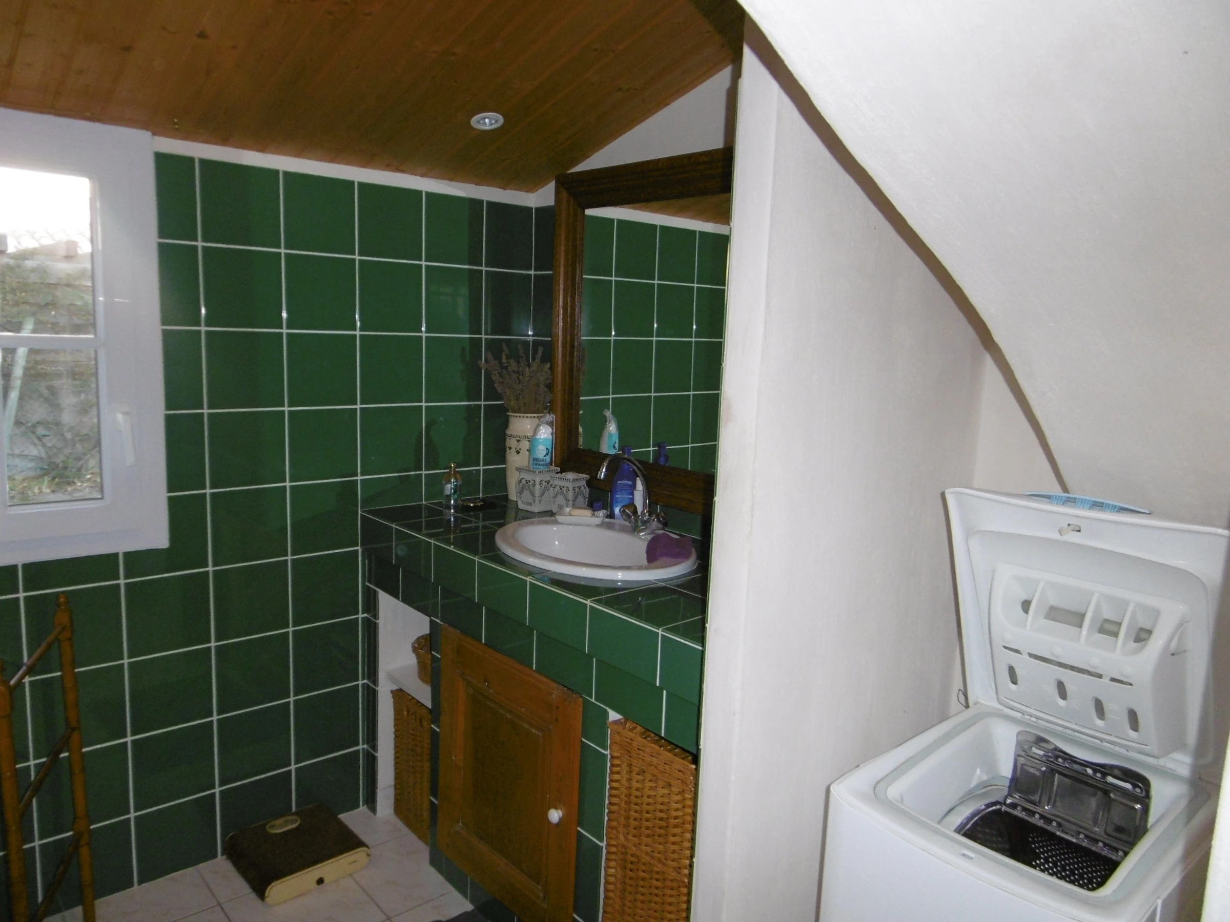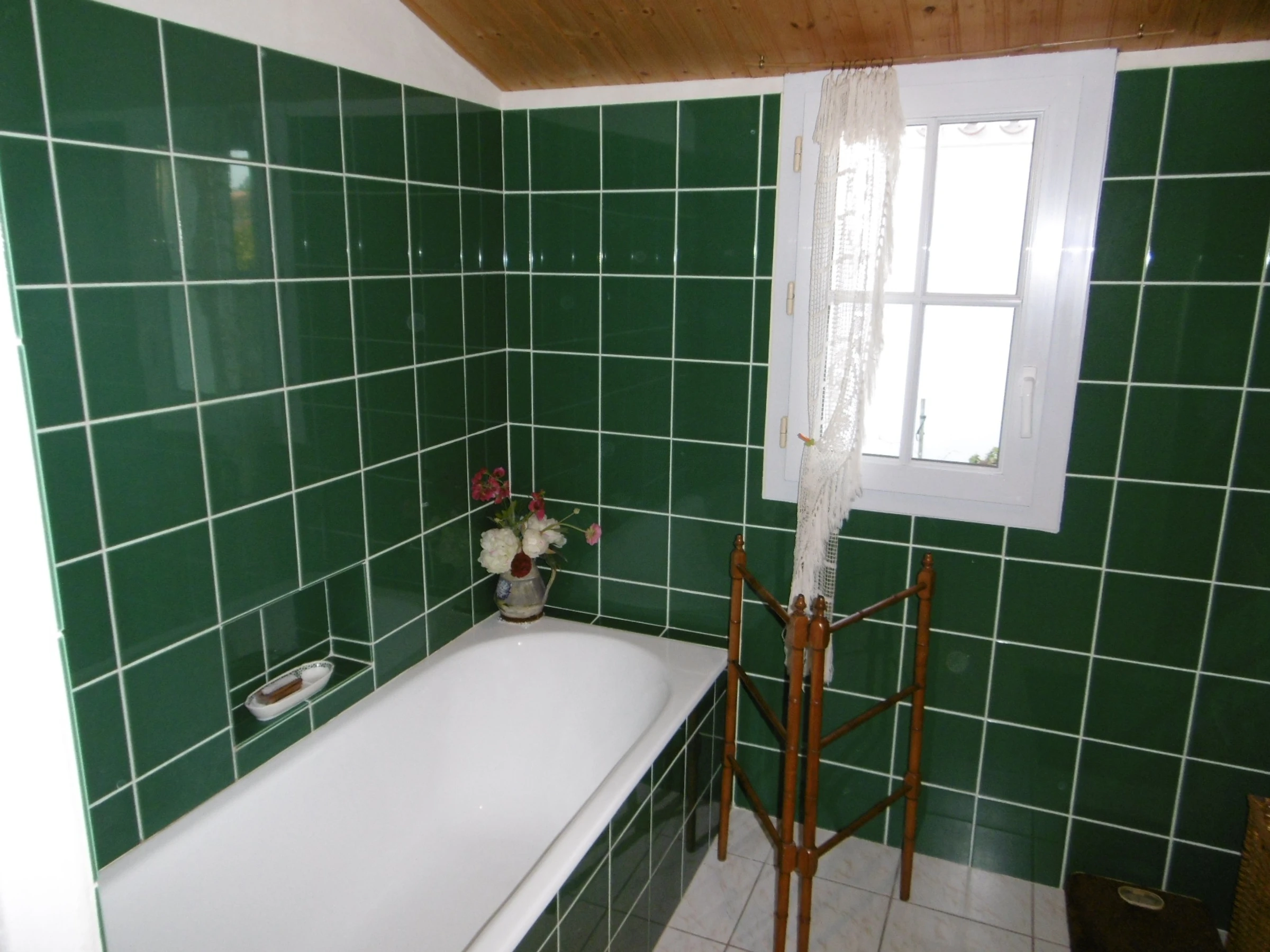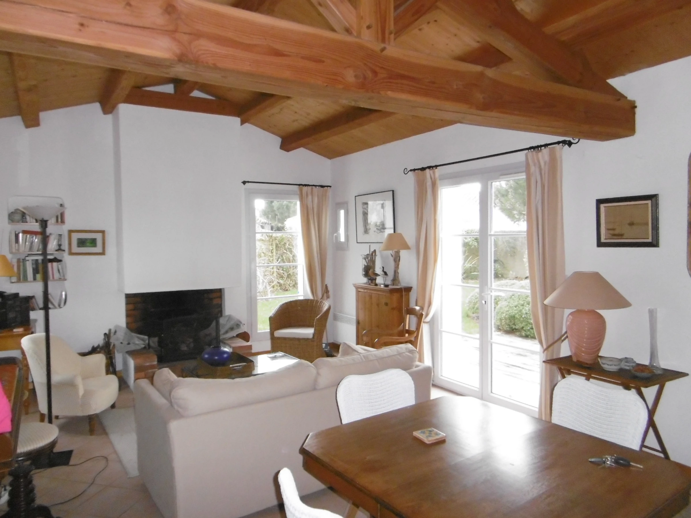Pleasant, comfortable, detached two-story house in a quiet area at the end of a cul-de-sac in an enclosed, wooded, and flowered garden - approximately 90 m² - Sleeps 5. It includes a living room with a sitting area and fireplace, an open-plan equipped kitchen, a bedroom with a 140 cm bed opening onto a terrace and garden, a bedroom with a 90 cm bed, a bathroom, and a separate toilet with a washbasin. Upstairs: a bedroom with a 140 cm bed with a private bathroom with shower, sink, and toilet. Dishwasher, washing machine, Wi-Fi. Refrigerator with freezer compartment and 3 gas burners with an electric hob. Covered patio with wooden deck and garden furniture, barbecue, and deckchairs. Garage for bicycle storage. Private parking in front of the gate. No pets allowed. Cleaning service available: €108. Optional services not included, to be reserved 1 month prior to arrival and subject to availability: