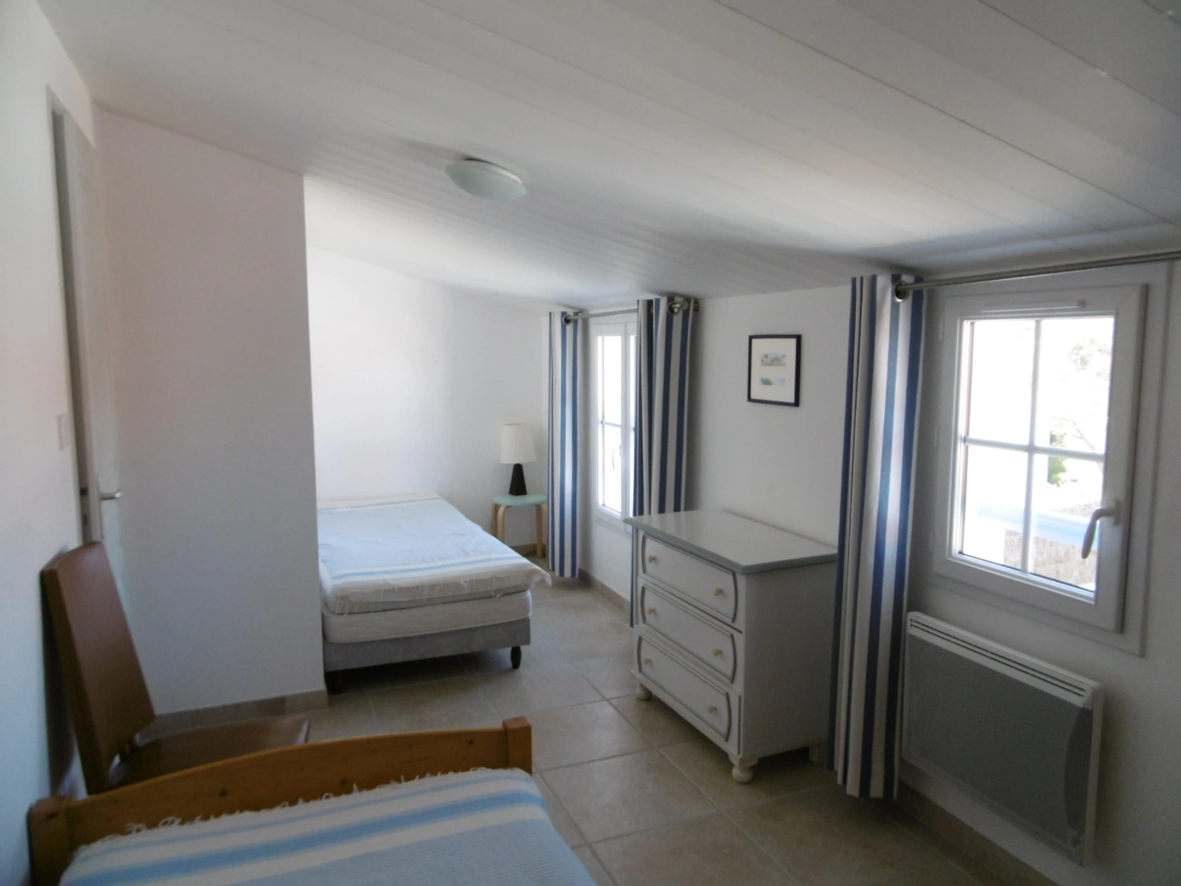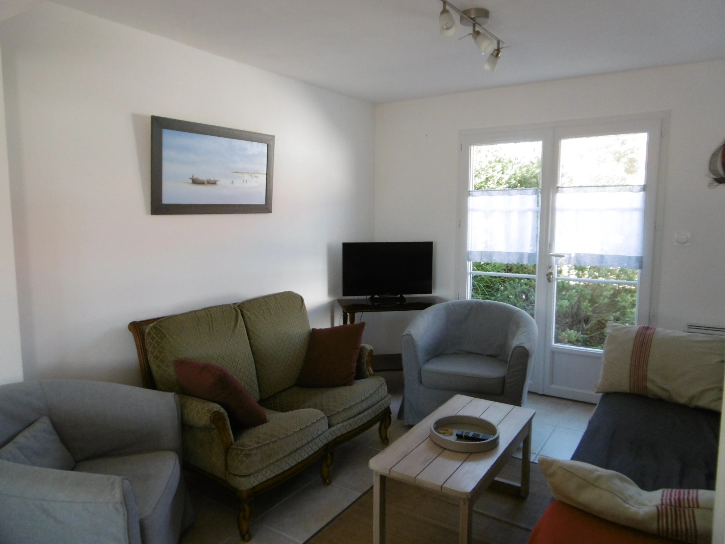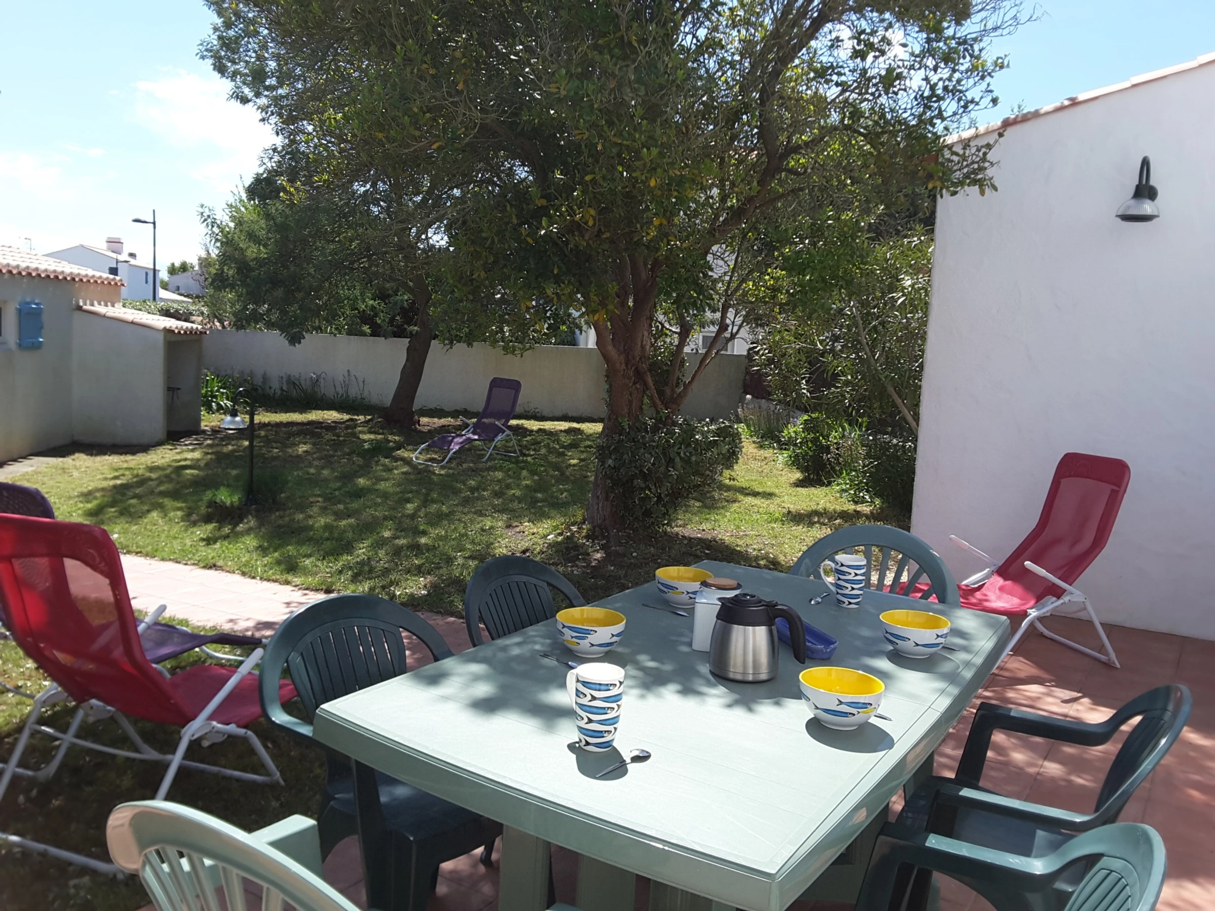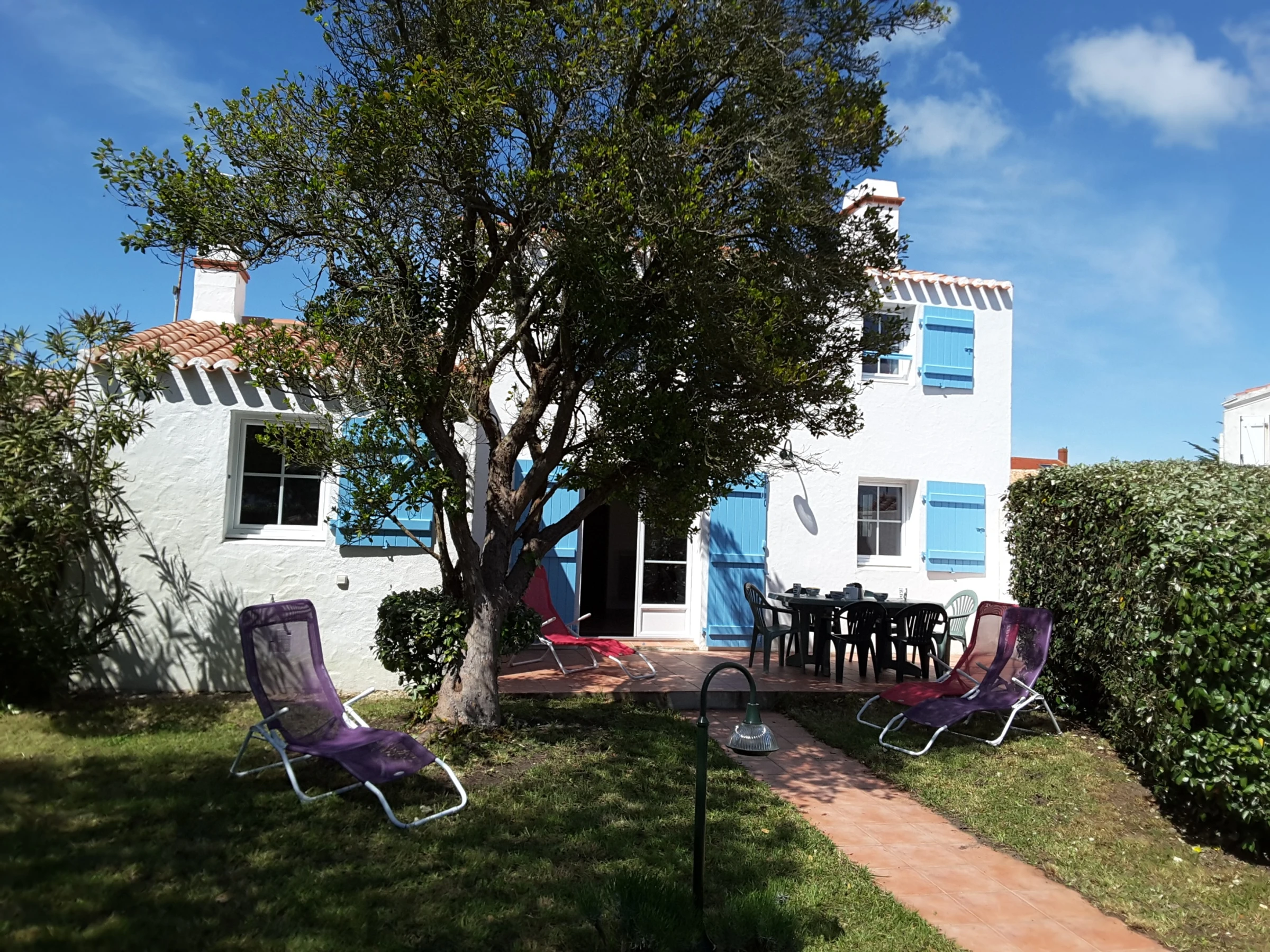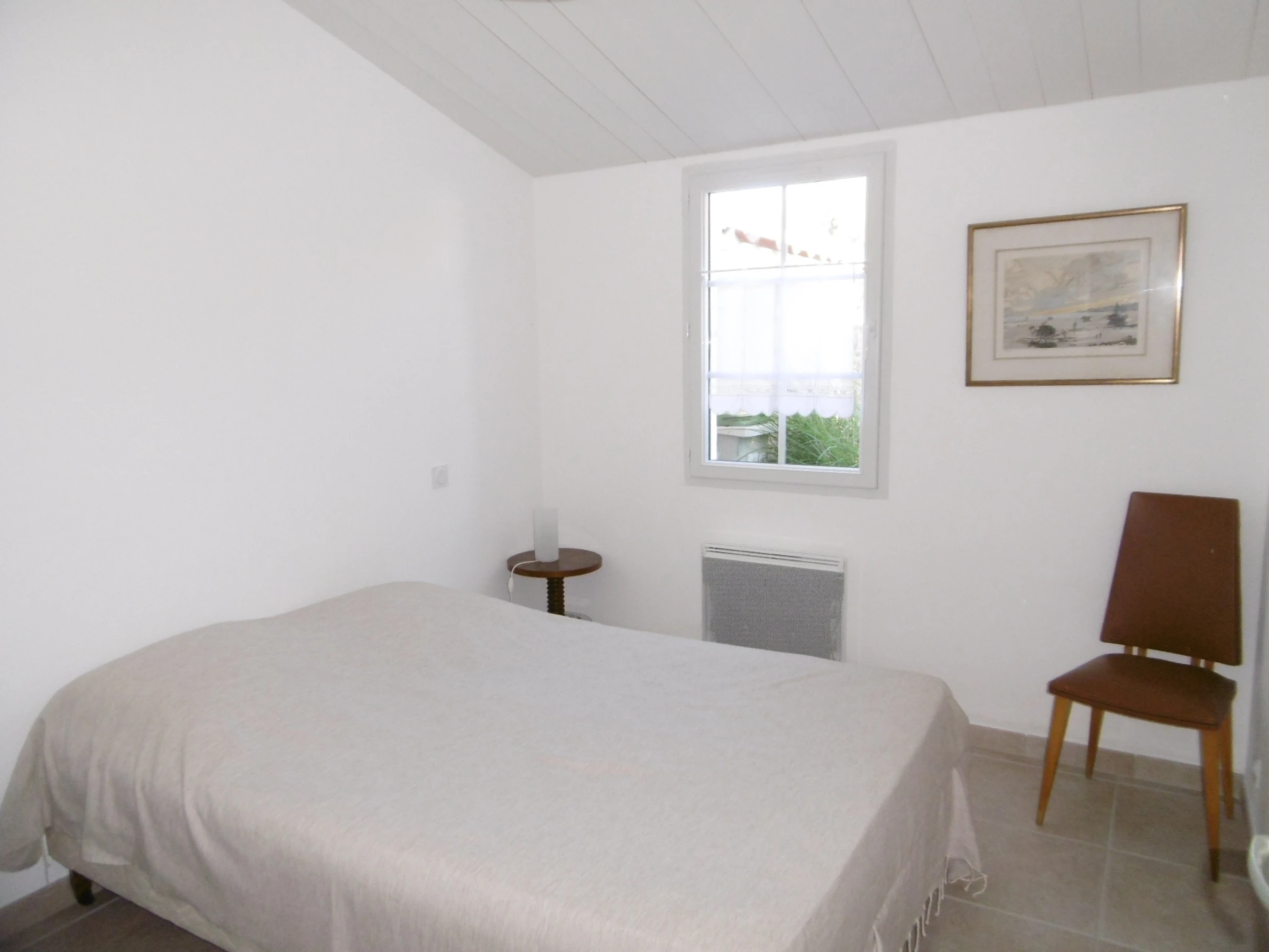 Detached house in a shaded, enclosed garden with a comfortable floor - approximately 100 m² - Sleeps 8. The ground floor comprises a living room with a sitting area, a separate fitted and equipped kitchen, and a bedroom with a 140 cm bed and cupboards. A bathroom (walk-in shower) and a heated towel rail. A separate toilet. A pantry with a second refrigerator and freezer. Upstairs: Two bedrooms with two 90 cm beds and a fourth bedroom with a 140 cm bed. Bathroom with toilet and heated towel rail. Washing machine, dishwasher, microwave, flat-screen TV. Enclosed garden with a tiled terrace, garden furniture (bench and small outdoor table), deckchairs, and a barbecue. Baby bath. Street parking. Pets not allowed. Cleaning service available: €125. Optional services not included, to be reserved 1 month prior to arrival and subject to availability: