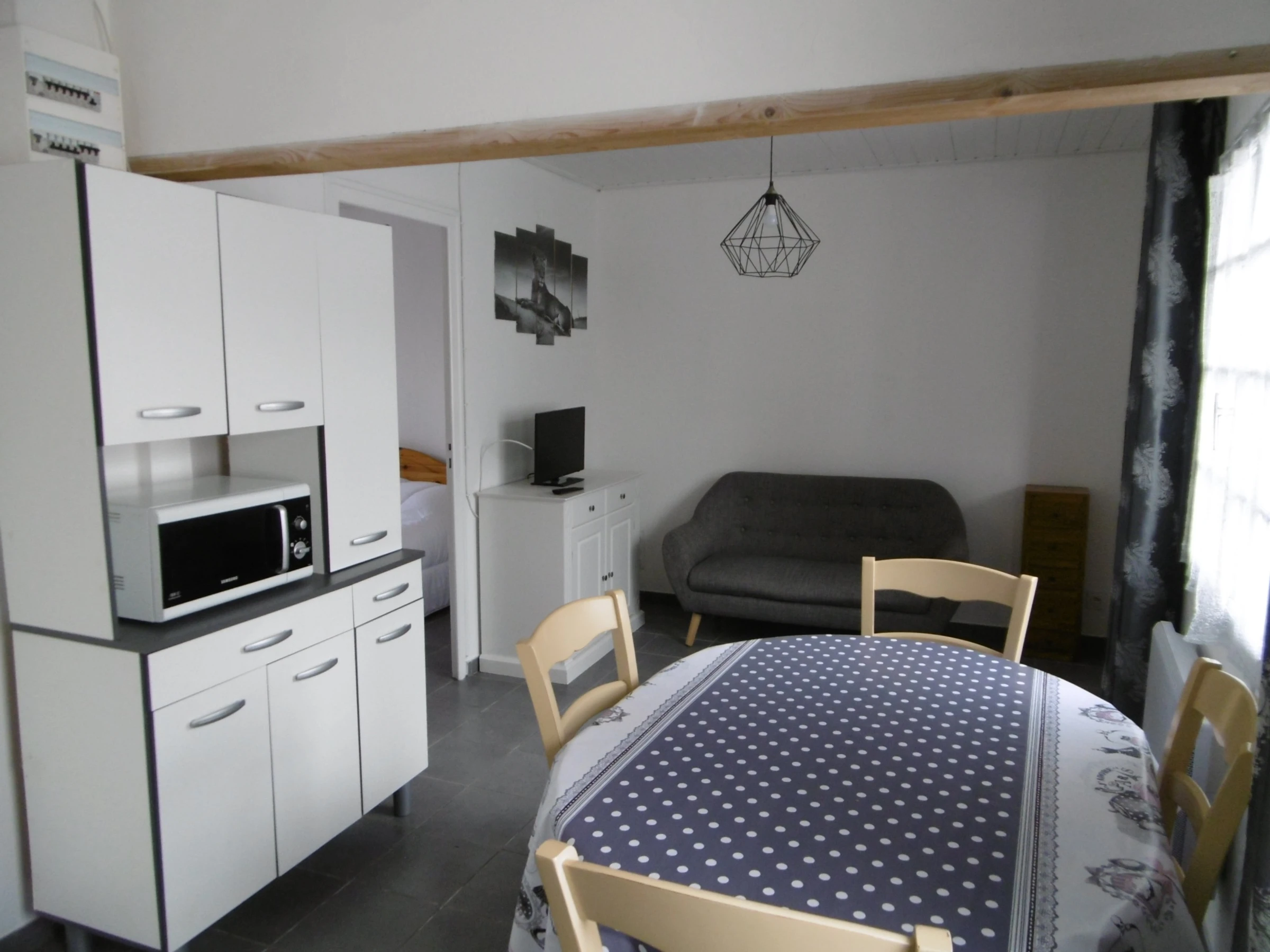 Renovated, detached, single-story country house in a fenced courtyard and terrace - approximately 38 m² - sleeps 2-4 people, comprising a living room, kitchenette with lounge area, one bedroom with a double bed (140 cm) and storage, one bedroom with a double bed (140 cm) and storage, shower room with washing machine, separate WC, hallway - Adjoining garage for storing bicycles and surfboards - Dishwasher, microwave, freezer compartment, flat-screen TV, oven in the garage - High chair and cot - Garden furniture, barbecue, parasol and 2 sun loungers - Pets not allowed. Optional cleaning service: €80.