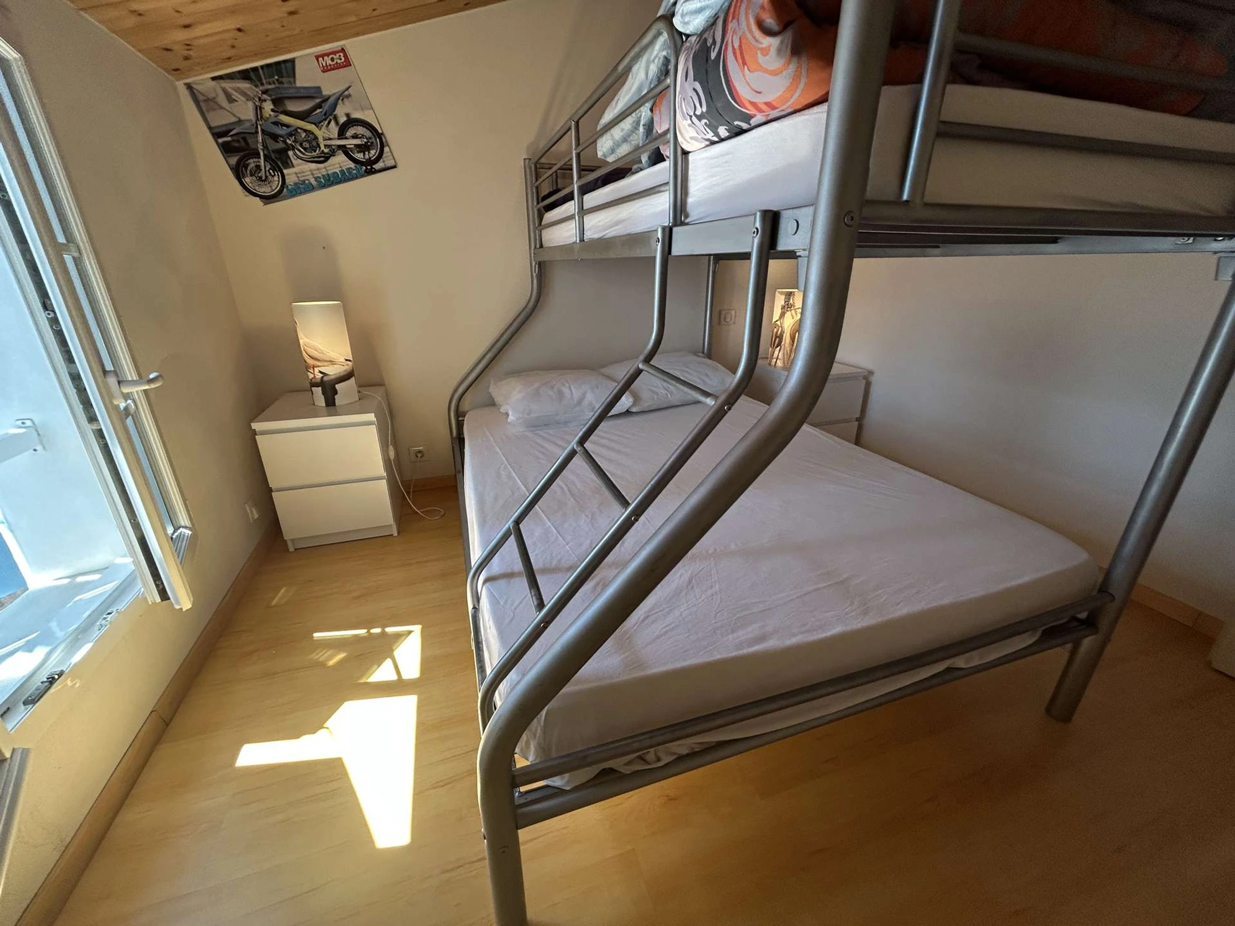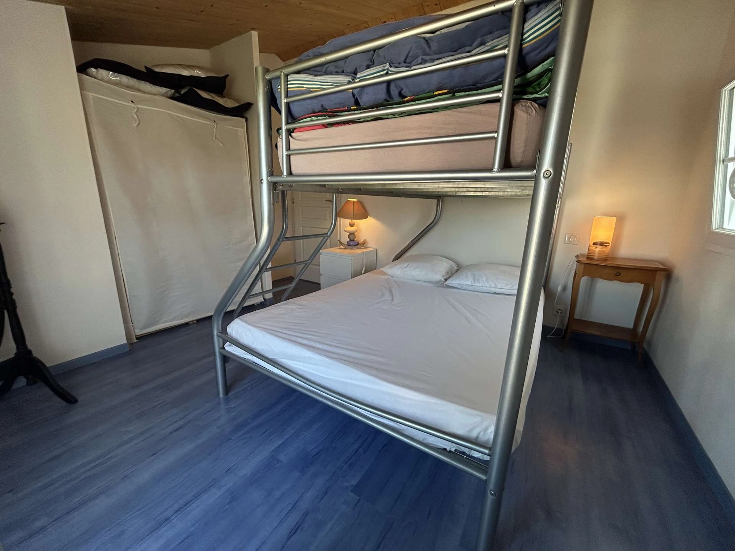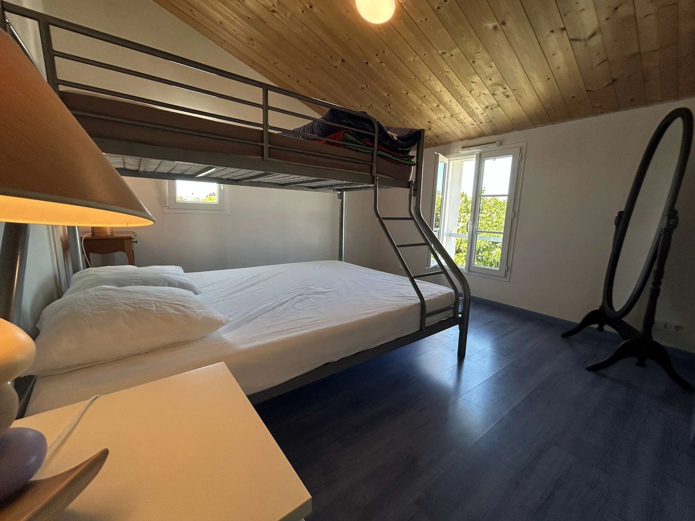 Upstairs, the house has a bedroom with a sofa bed and a single bed, as well as two bedrooms each equipped with bunk beds, including a double bed on the bottom and a single bed on the top. A second bathroom is also available.