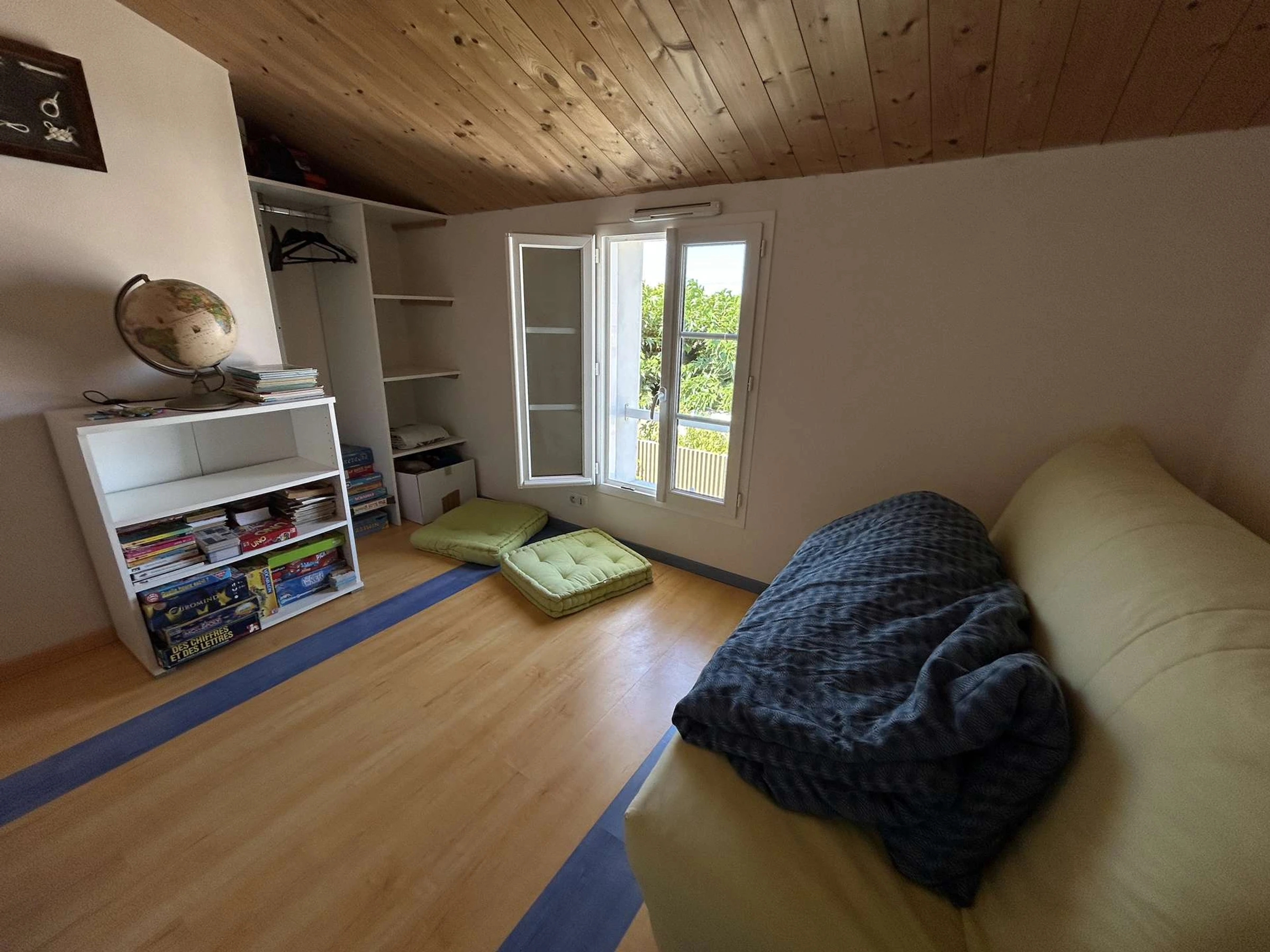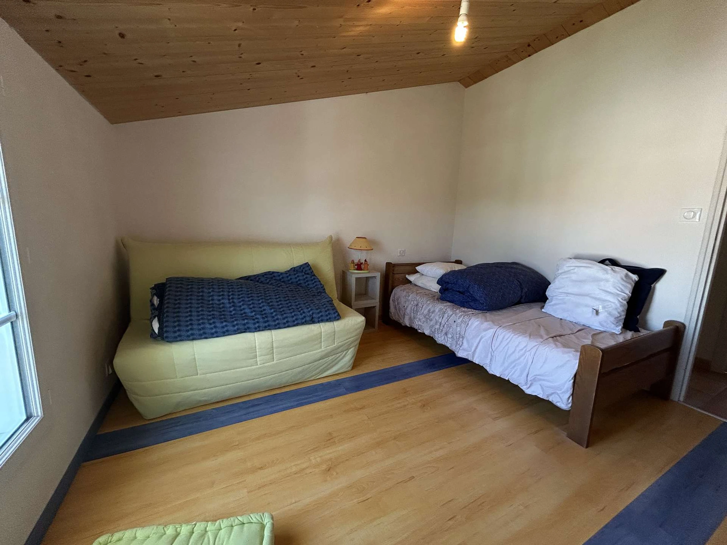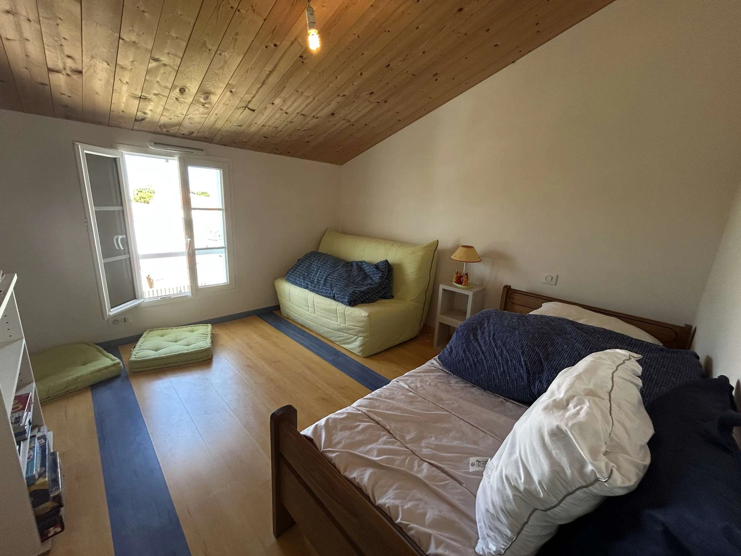 Upstairs, the house has a bedroom with a sofa bed and a single bed, as well as two bedrooms each equipped with bunk beds, including a double bed on the bottom and a single bed on the top. A second bathroom is also available.