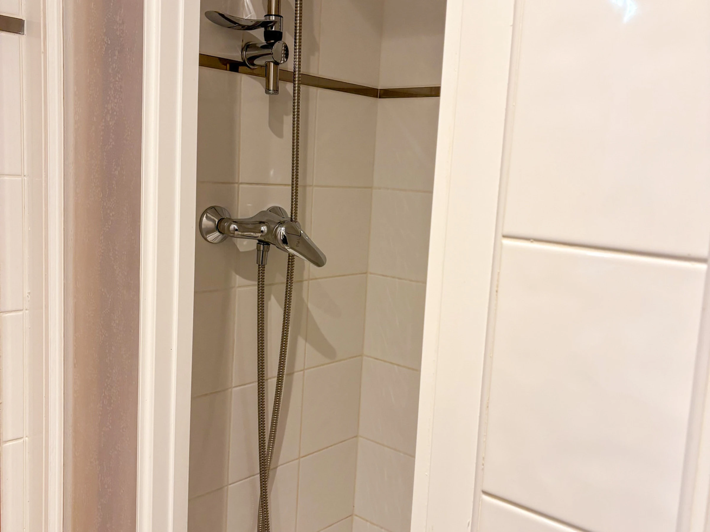 - This apartment has a bathroom with a bathtub, a shower room with a shower cubicle, and a separate toilet.