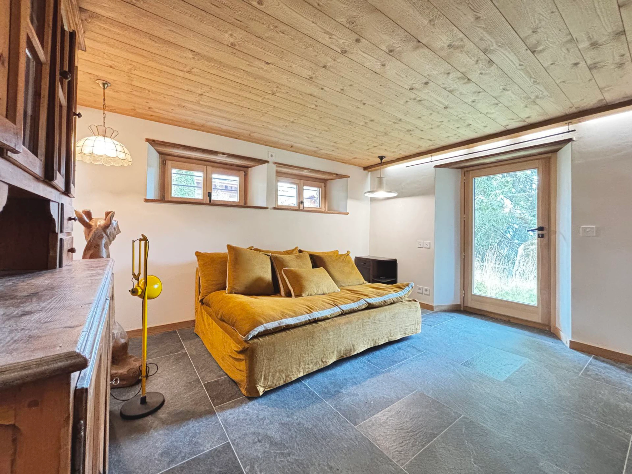 -Multipurpose room used as a "dormitory," equipped with a 140 cm sofa bed, adjoining the fourth bedroom and offering direct access to the outdoor area