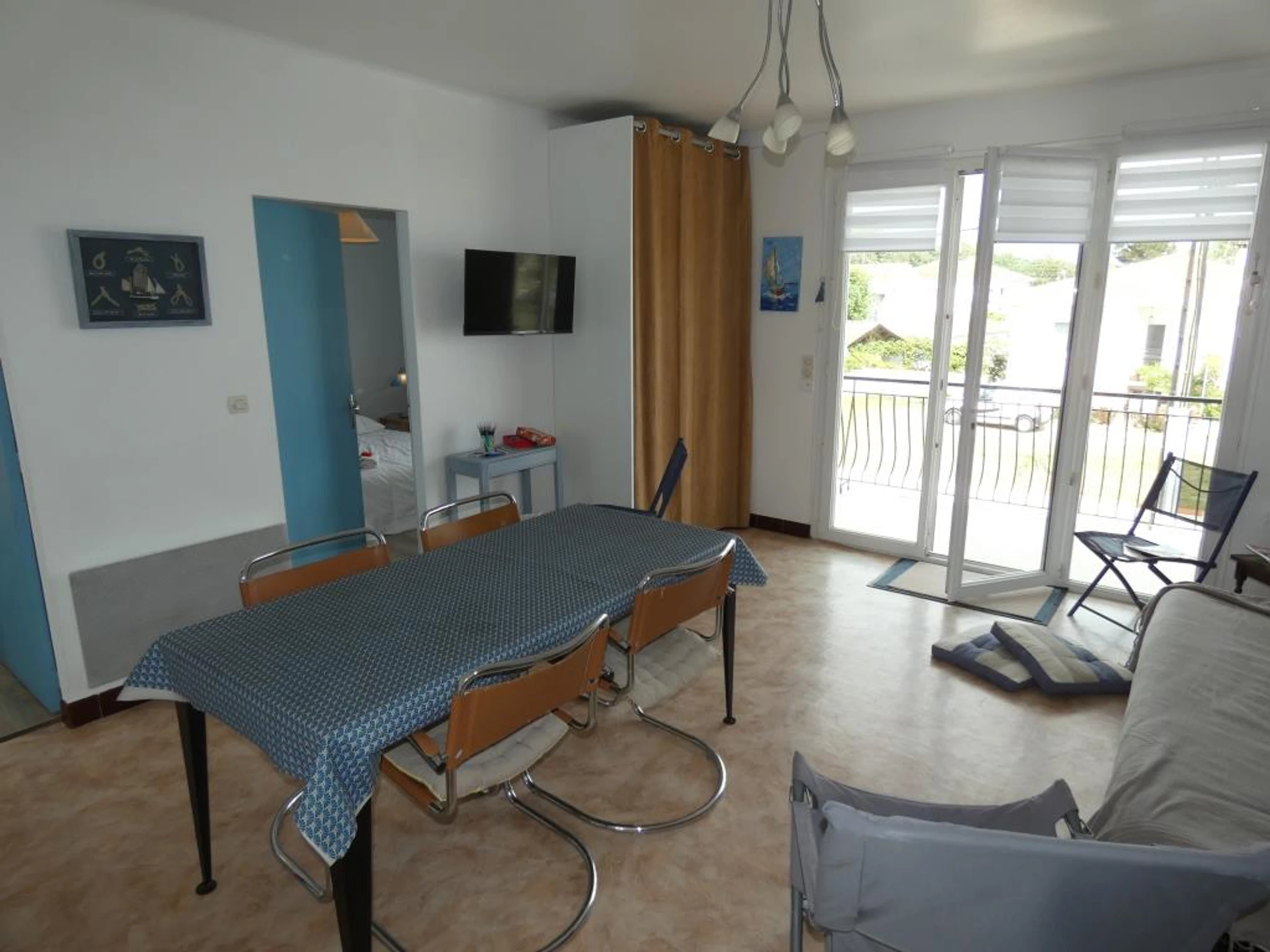 - a living room with 2 French windows opening onto the balcony, 1 140*200 sofa bed, a table and six chairs, a TV, storage space.