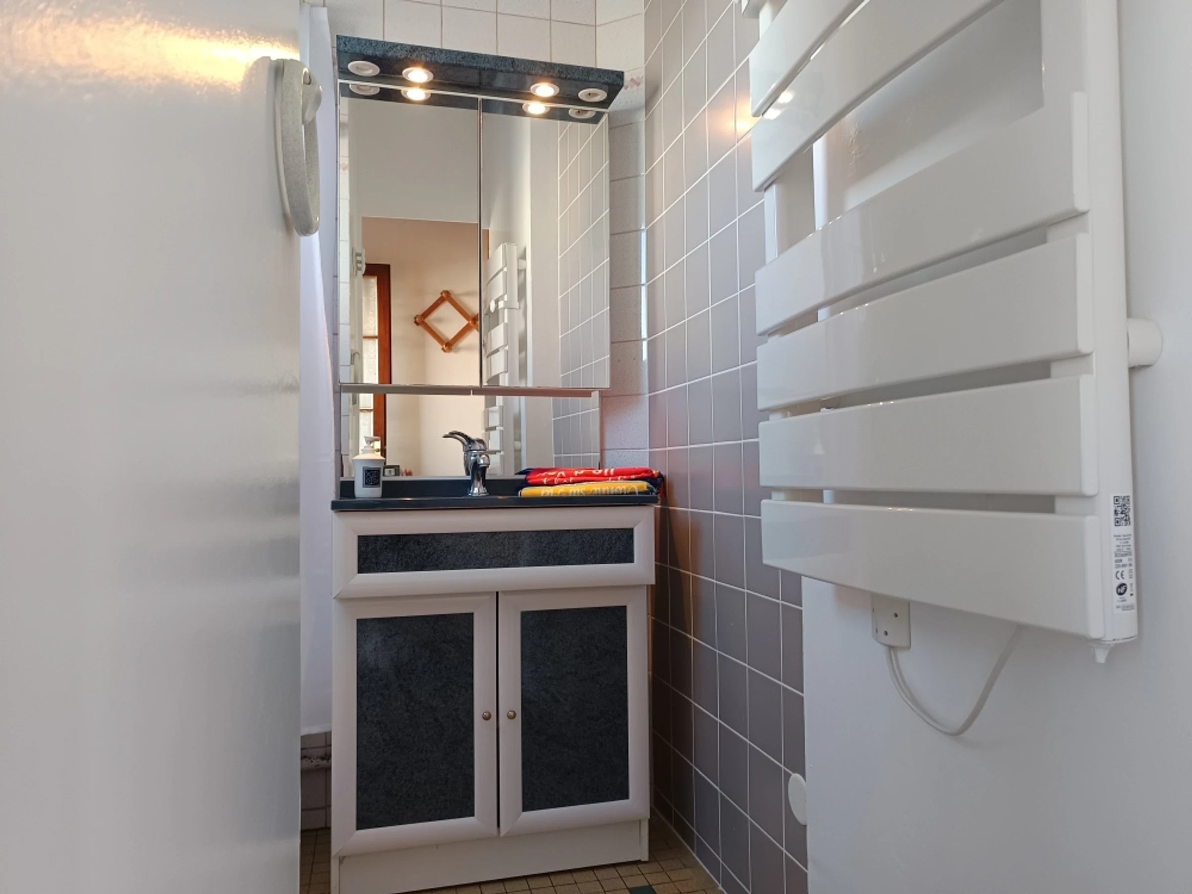 • A shower room with a shower, washbasin and storage space, mirror,