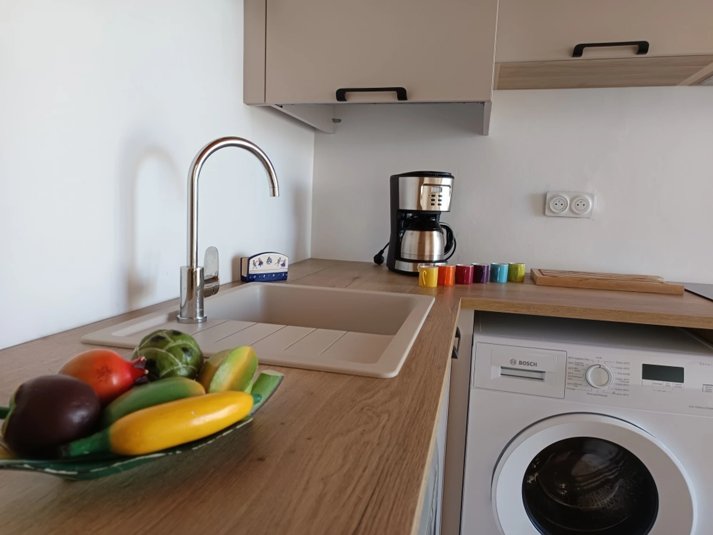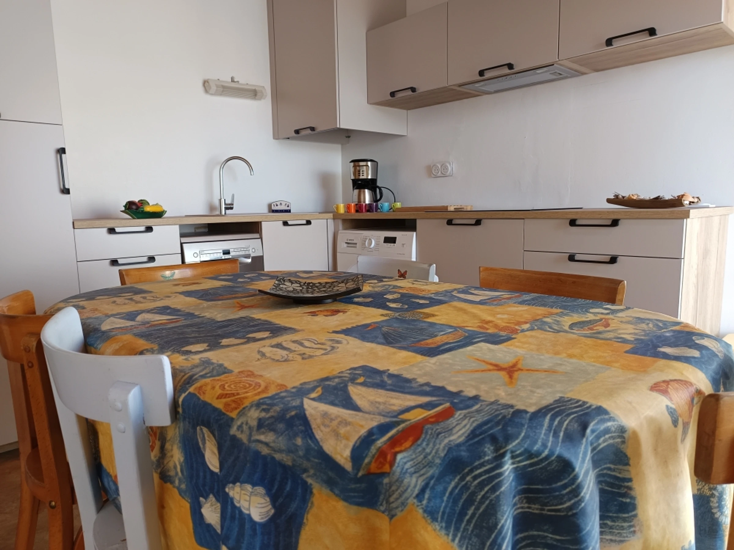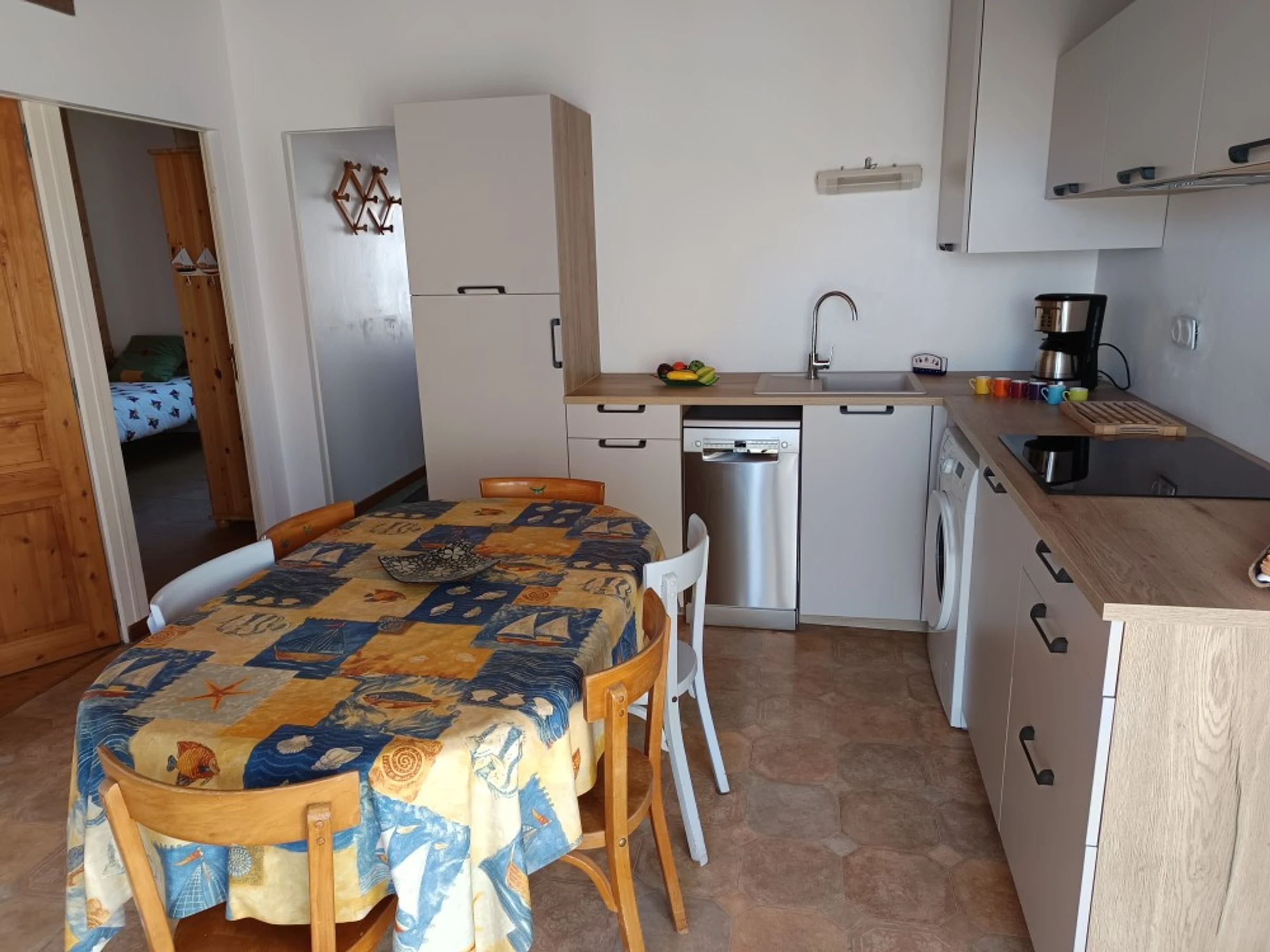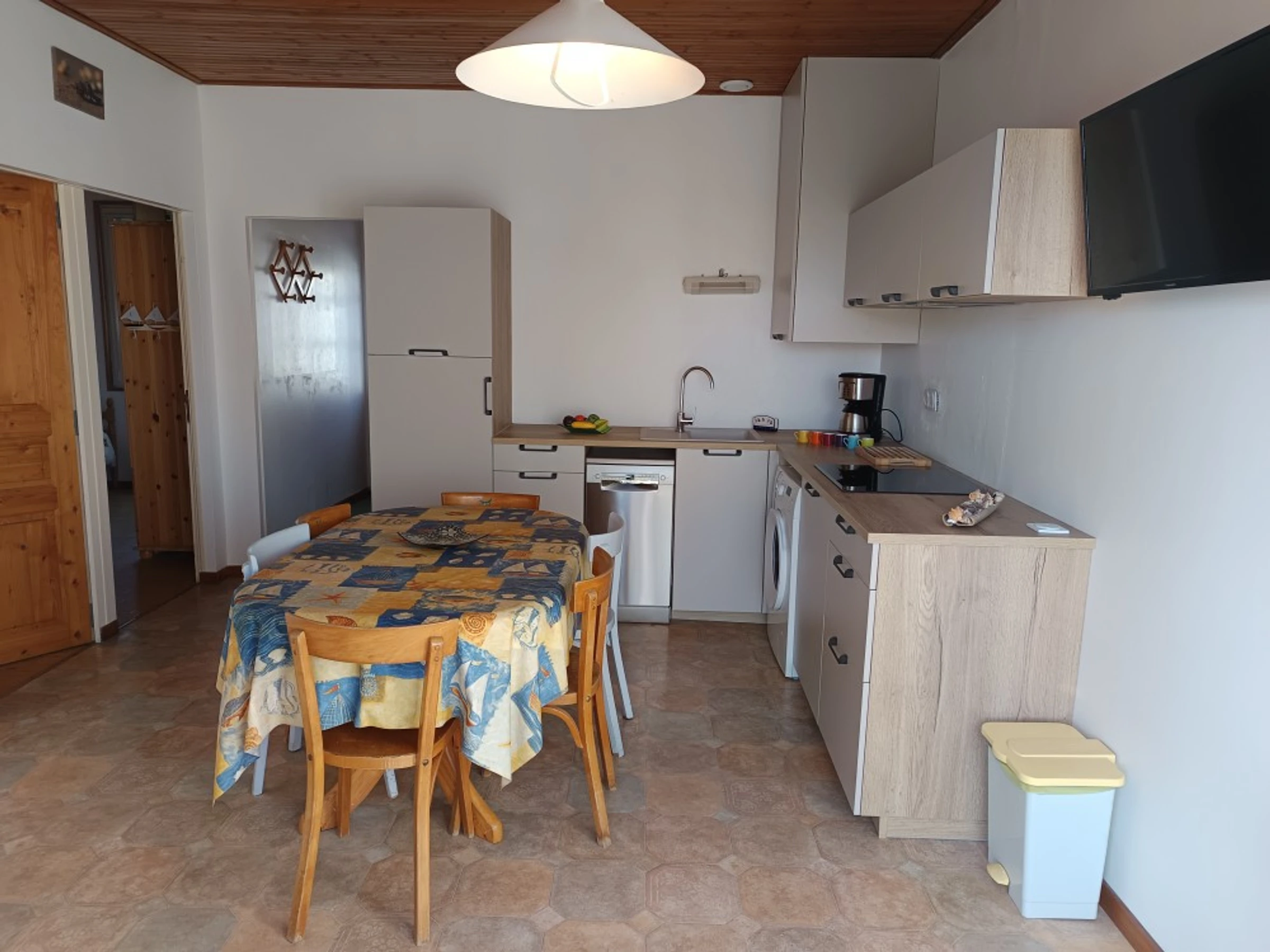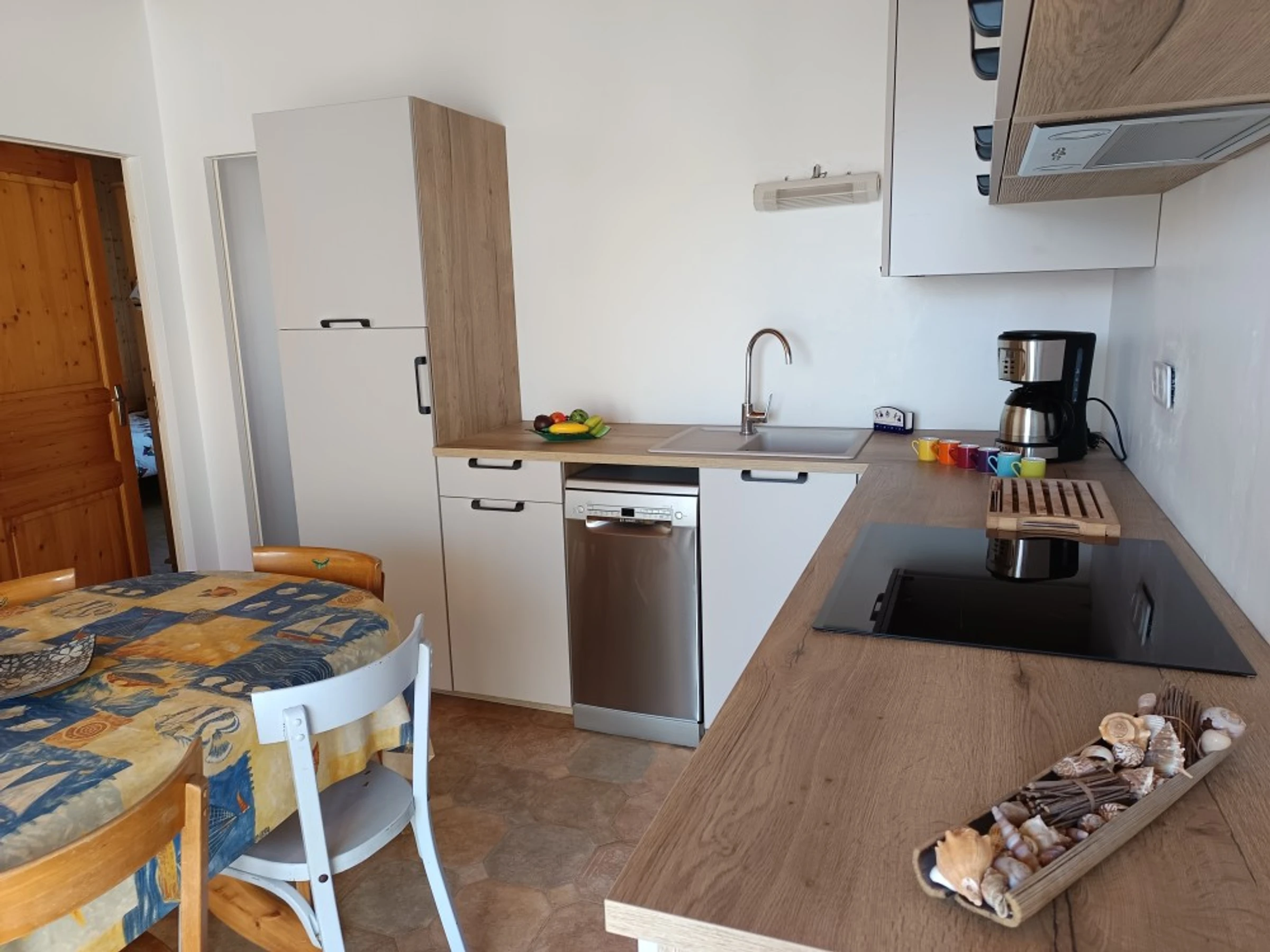 • The main room with its open-plan kitchen, equipped with a fridge-freezer, induction hob, extractor hood, microwave, filter coffee machine, kettle and toaster. The washing machine and dishwasher are two great features of this accommodation, along with its table and chairs, sofa and television.