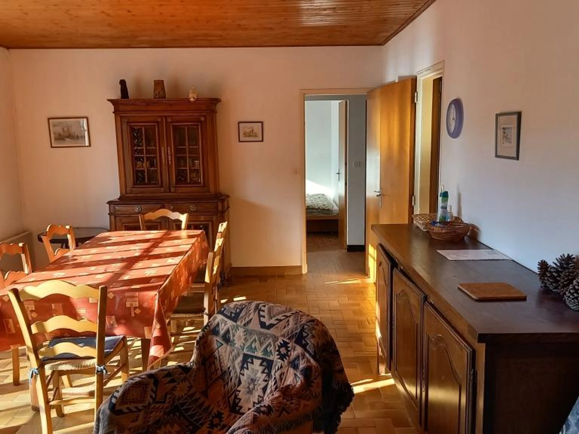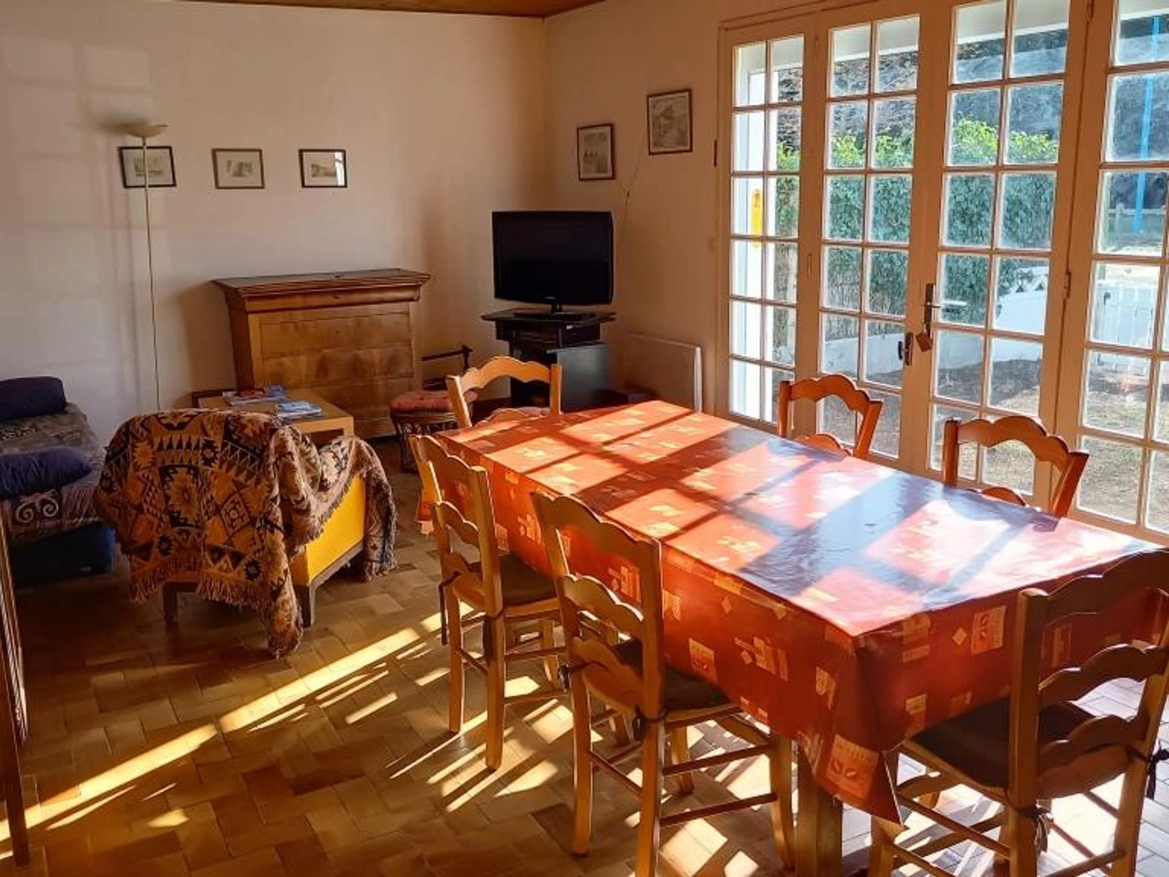 - a living room with a table and chairs, and a sitting area with a 140x190 sofa bed and a TV.