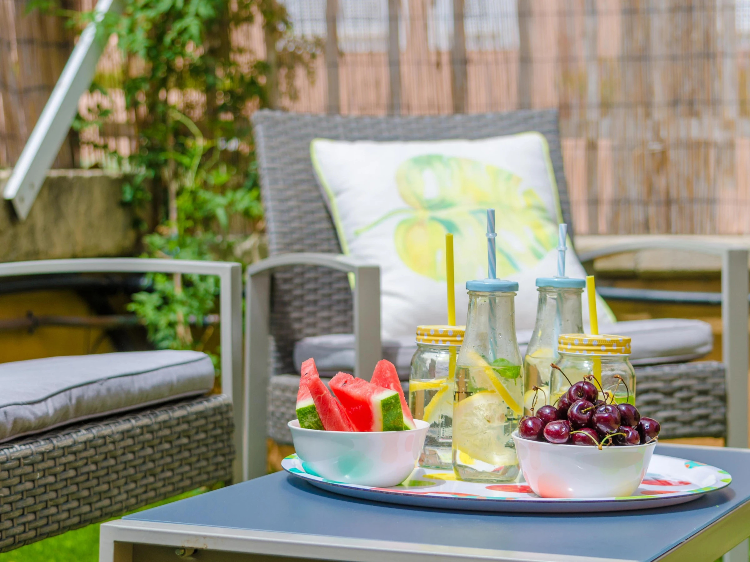 This is an independent chalet in a quiet and residential area. On the one hand, we have the front porch, furnished with exterior table and chairs together with two beautiful armchairs where you will enjoy your meals al fresco or sit to have a coffee and read an interesting book. On the other hand, the side and the back of the house offer an artificial lawn area where the little ones can play while you sit on the comfortable sofa and armchairs enjoying a cocktail in the evening. And the best plan when it becomes darker is to prepare a delicious barbecue and enjoy it with your family! The property is fenced and there are neighbours around.