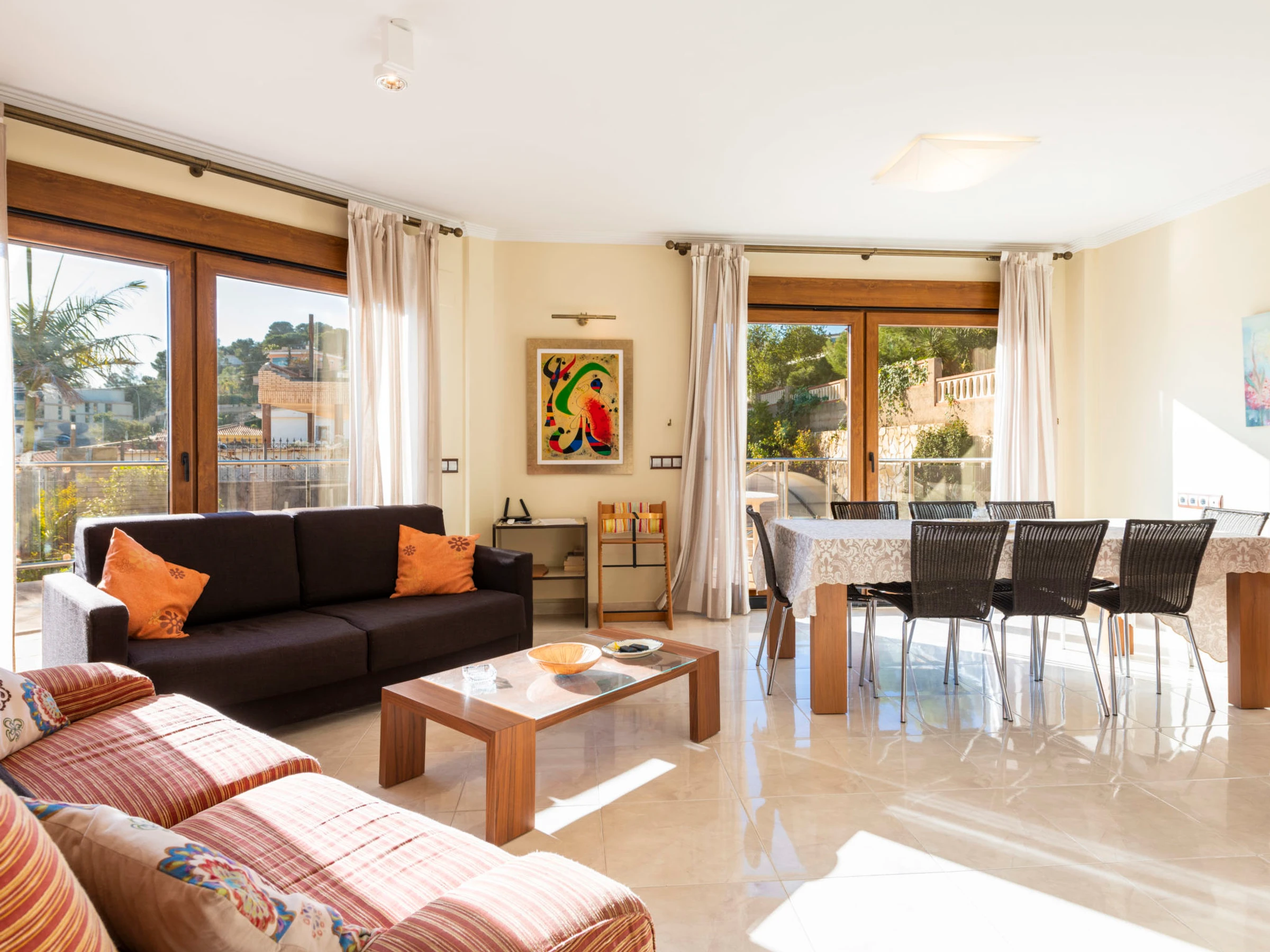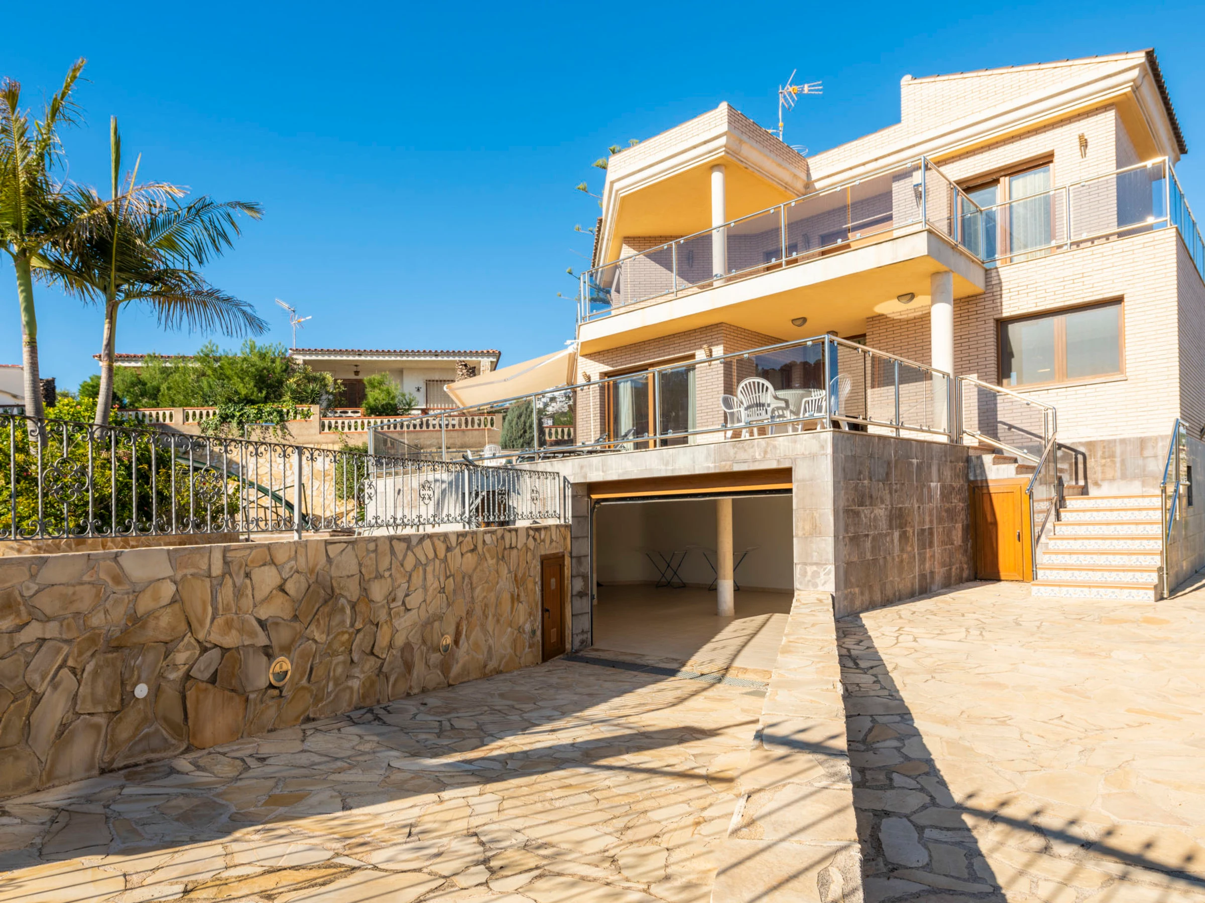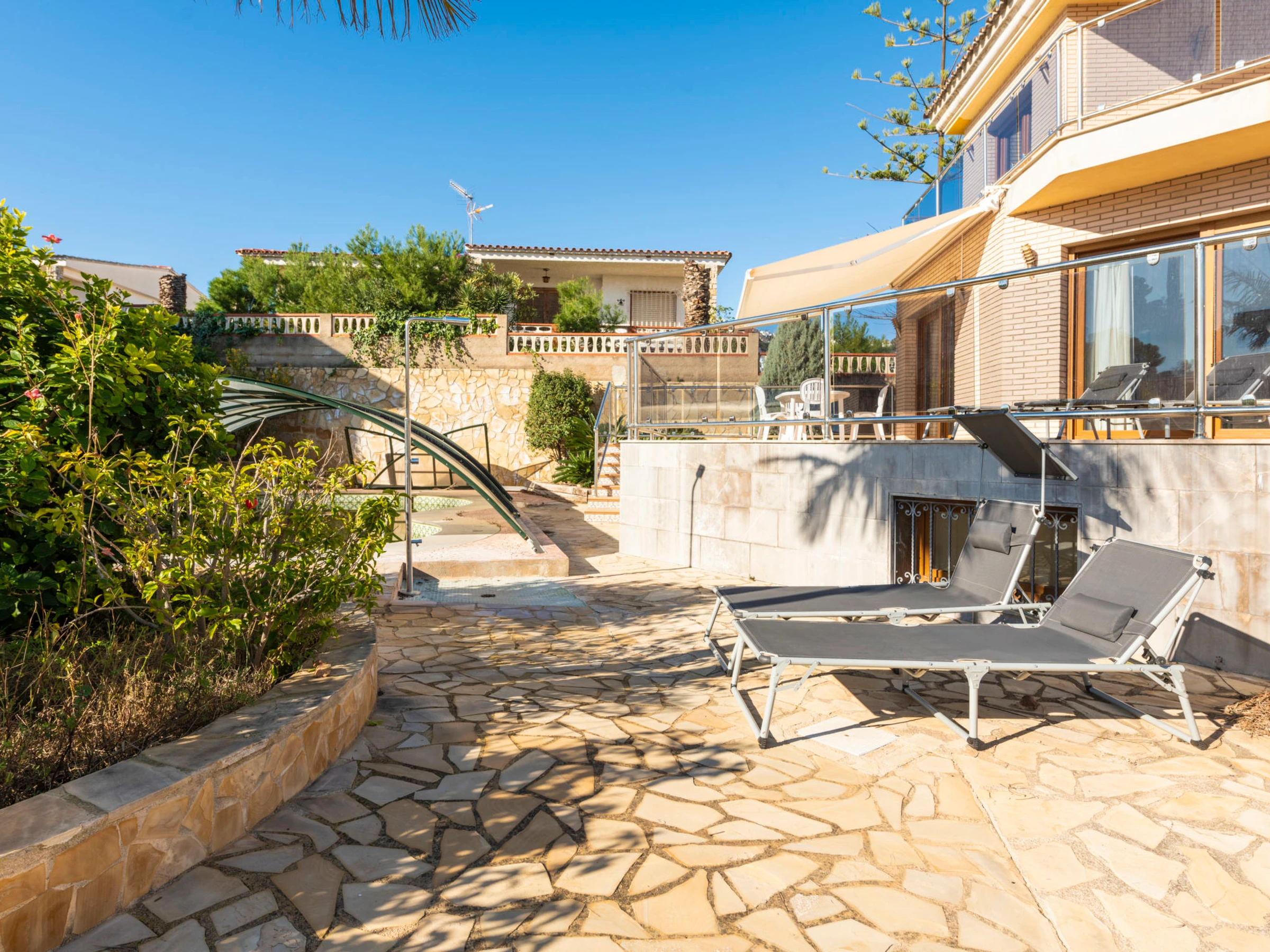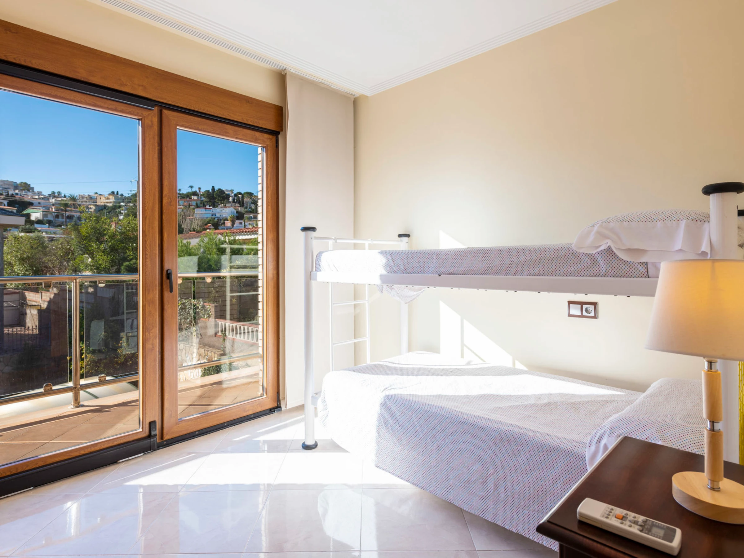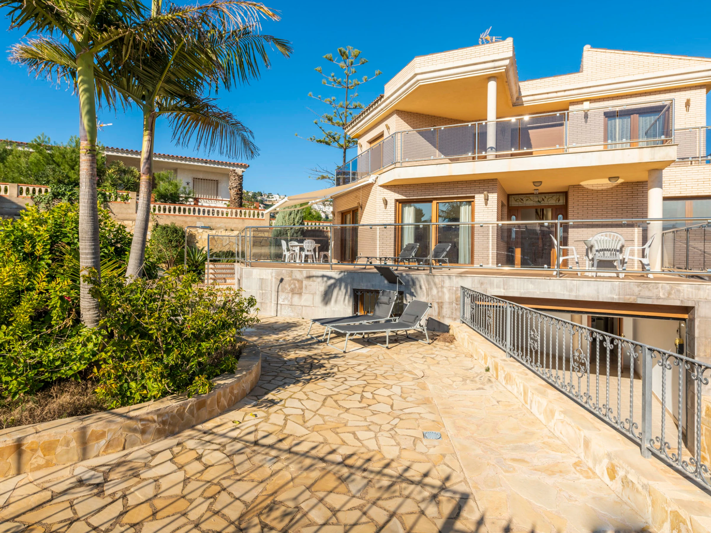 "Los Olivos", 5-room villa 200 m2 on 3 levels. Spacious and bright, very comfortable furnishings: living/dining room with 1 double sofabed, dining table, digital TV and air conditioning. Exit to the terrace. 1 double bedroom with 1 french bed (150 cm, length 190 cm), shower/bidet/WC. Kitchen (oven, dishwasher, 4 ceramic glass hob hotplates, toaster, kettle, microwave, freezer, electric coffee machine) with small dining table. Oil heating. On the lower ground floor: 1 double bedroom with 2 beds (90 cm, length 190 cm). Oil heating. Upper floor: 1 double bedroom with 1 french bed (150 cm, length 190 cm). Exit to the terrace. 1 double bedroom with 1 x 2 bunk beds (90 cm, length 190 cm), air conditioning. Bath/bidet/WC. Oil heating. Balcony, 2 terraces. Terrace furniture, barbecue, deck chairs (4). Panoramic view of the sea, the swimming pool and the resort. Facilities: washing machine, iron, children's high chair, baby cot, hair dryer. Internet (WiFi, free). Garage (3 cars). Suitable for families. 1 pet/ dog allowed. [hidden]