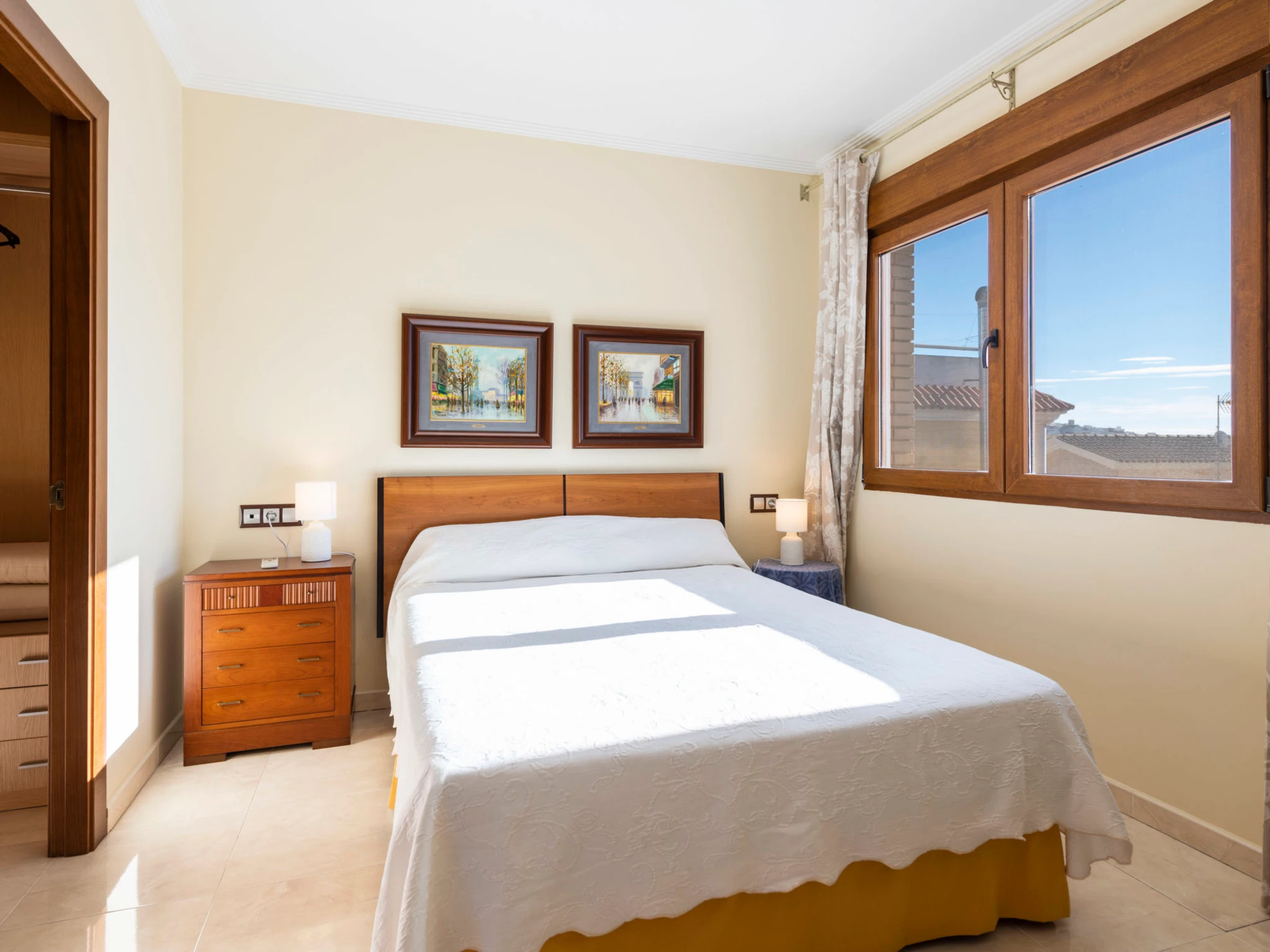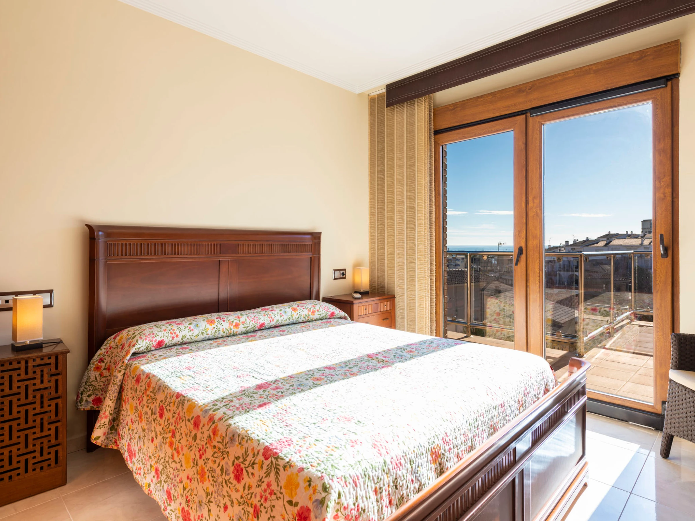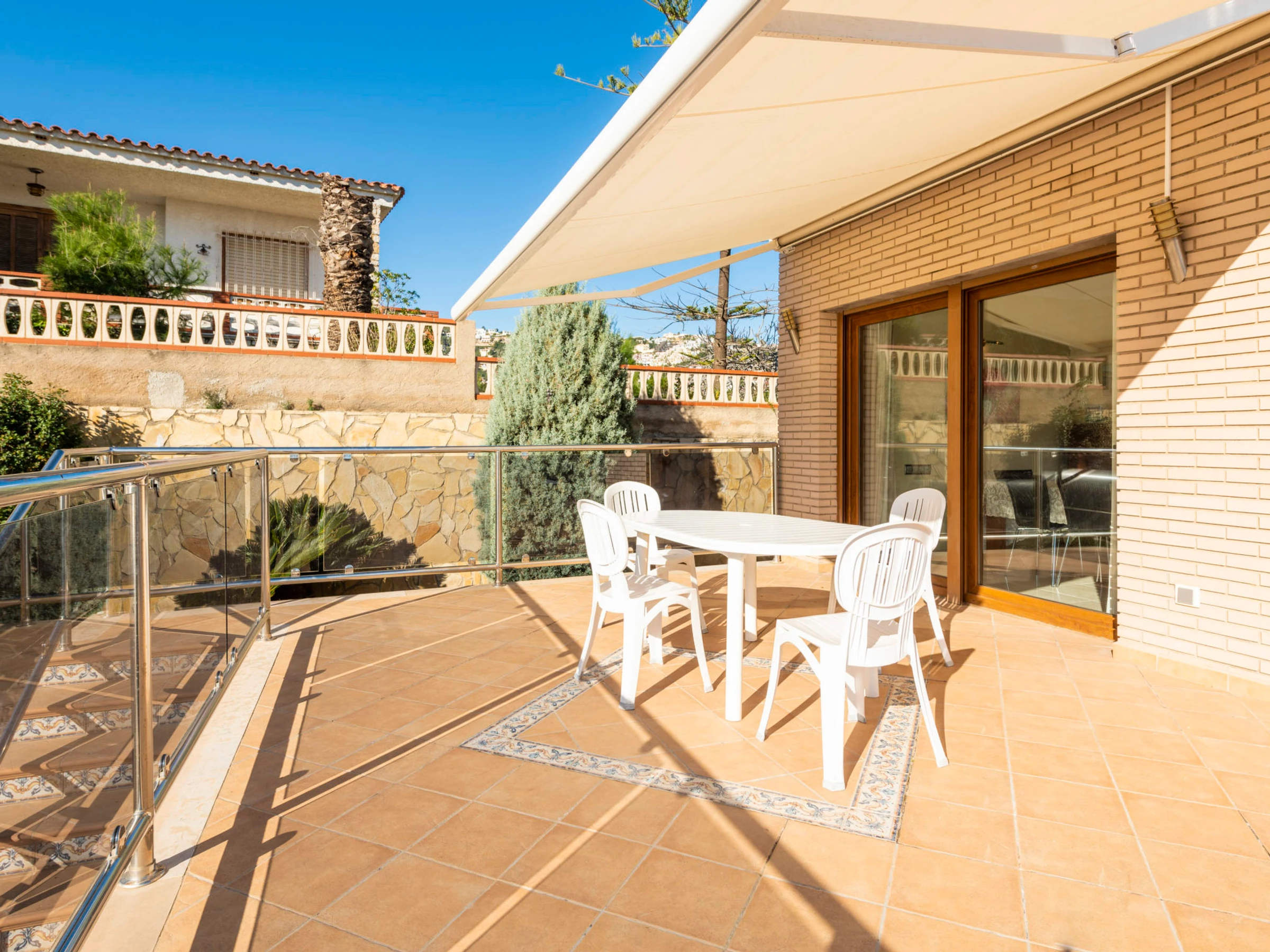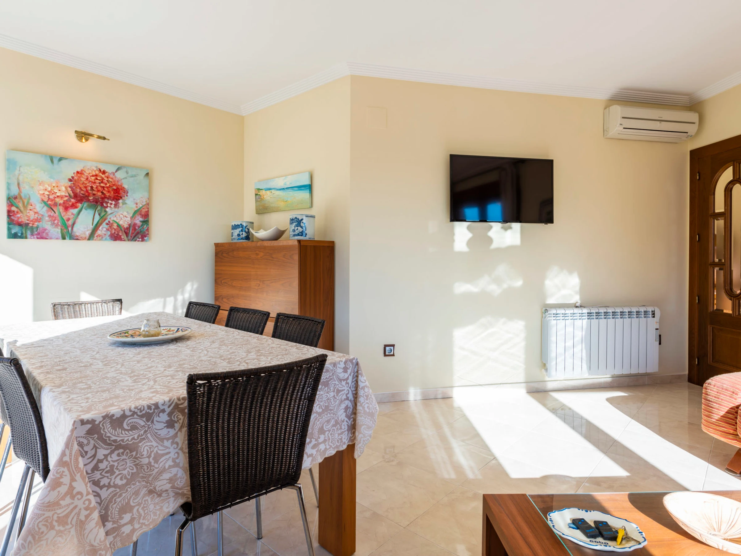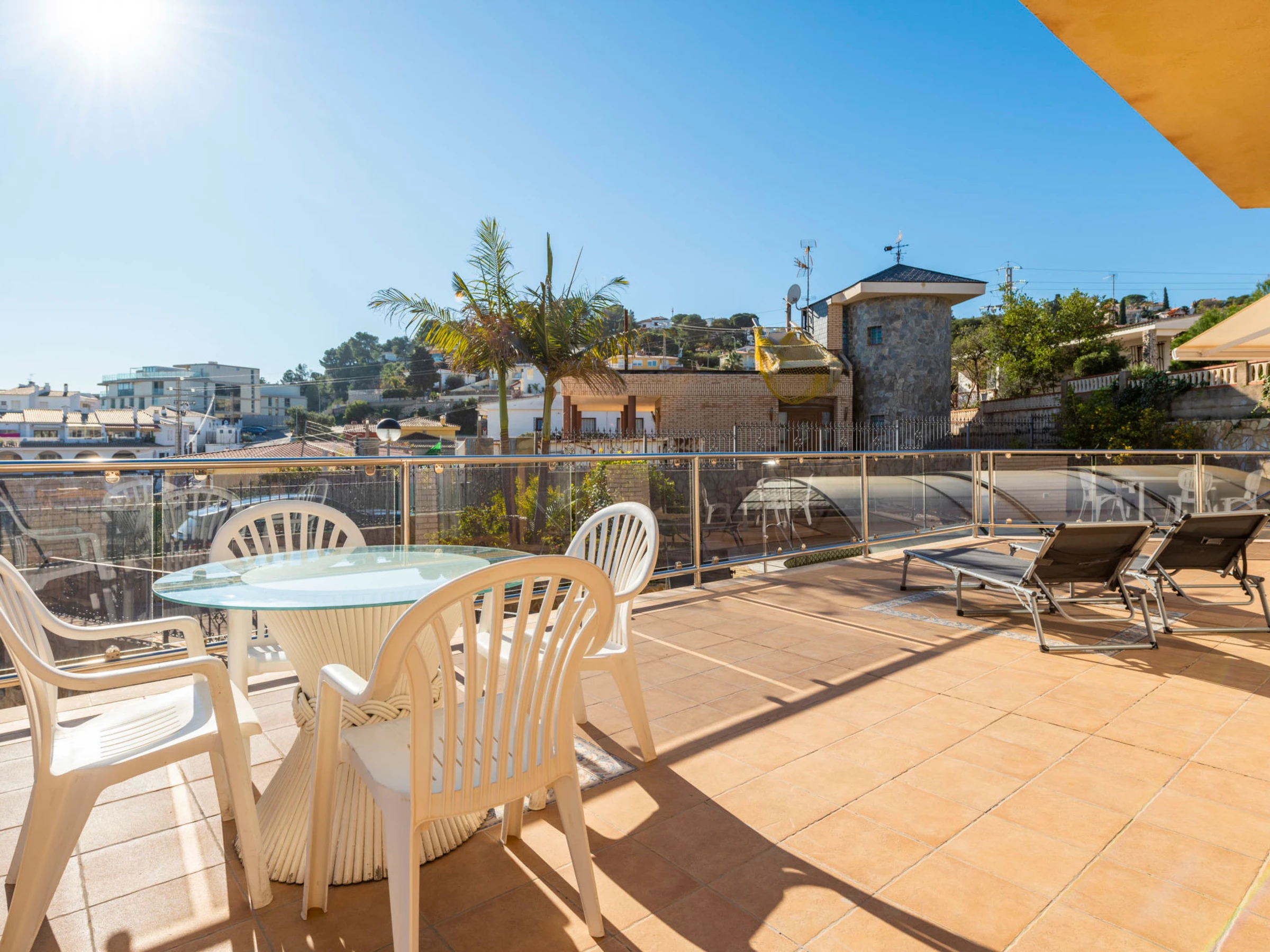 "Los Olivos", 5-room villa 200 m2 on 3 levels. Spacious and bright, very comfortable furnishings: living/dining room with 1 double sofabed, dining table, digital TV and air conditioning. Exit to the terrace. 1 double bedroom with 1 french bed (150 cm, length 190 cm), shower/bidet/WC. Kitchen (oven, dishwasher, 4 ceramic glass hob hotplates, toaster, kettle, microwave, freezer, electric coffee machine) with small dining table. Oil heating. On the lower ground floor: 1 double bedroom with 2 beds (90 cm, length 190 cm). Oil heating. Upper floor: 1 double bedroom with 1 french bed (150 cm, length 190 cm). Exit to the terrace. 1 double bedroom with 1 x 2 bunk beds (90 cm, length 190 cm), air conditioning. Bath/bidet/WC. Oil heating. Balcony, 2 terraces. Terrace furniture, barbecue, deck chairs (4). Panoramic view of the sea, the swimming pool and the resort. Facilities: washing machine, iron, children's high chair, baby cot, hair dryer. Internet (WiFi, free). Garage (3 cars). Suitable for families. 1 pet/ dog allowed. [hidden]