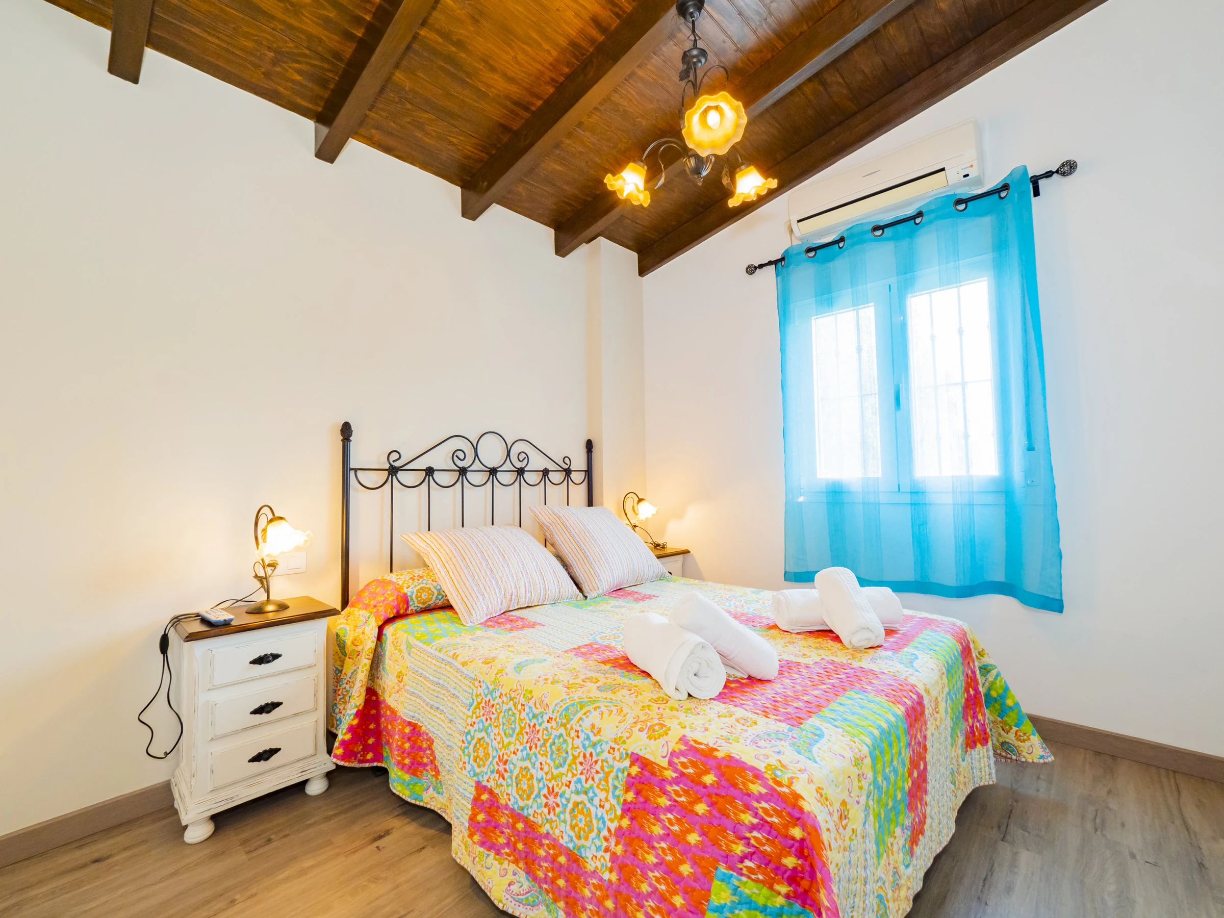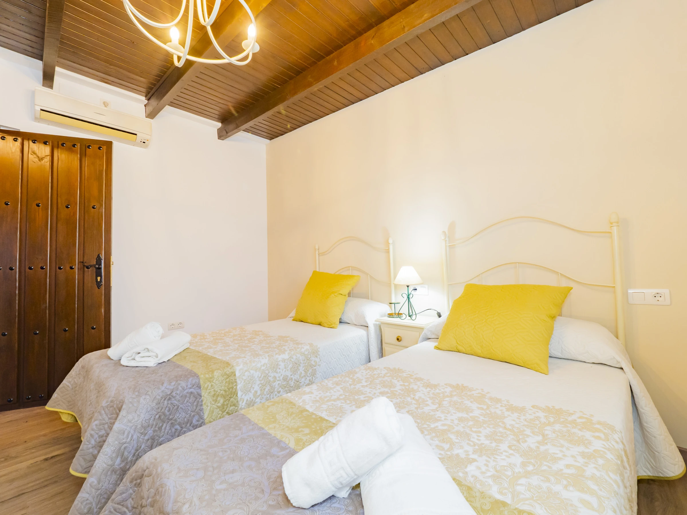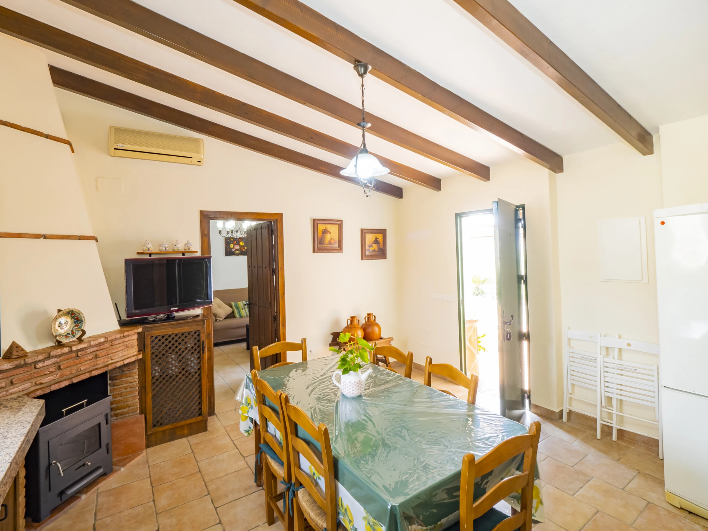 The house has four spacious and bright rooms that can accommodate up to 8 people. The distribution is as follows: three double rooms (two with a double bed and one with two single beds) and a single room, in addition to a sofa bed in the living room. Two of these rooms have a desk, ideal for those who need to telework during their stay, and all have air conditioning to ensure maximum comfort, although the air conditioning in the kitchen only works in cold mode.