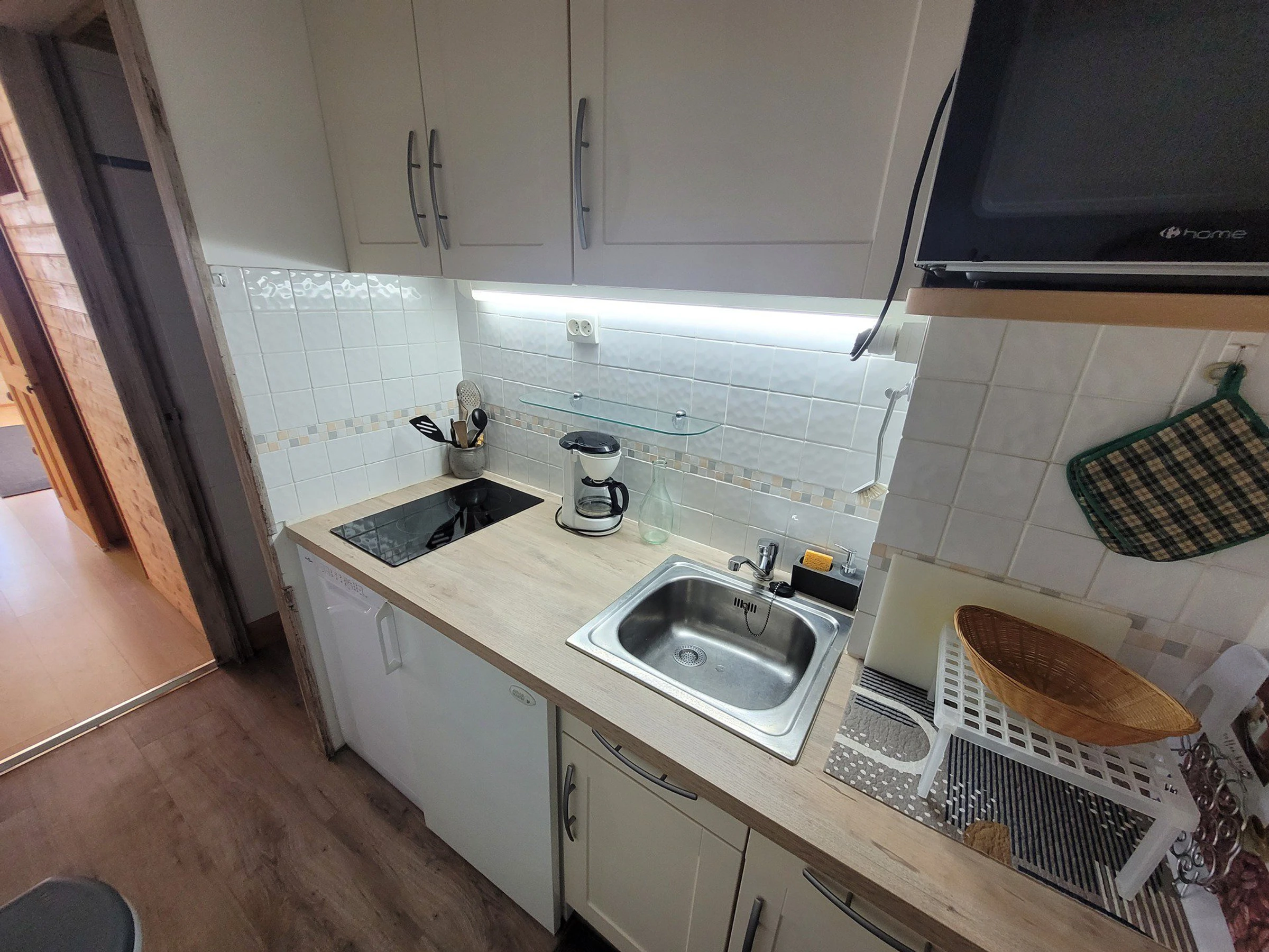 The kitchen, located in the entrance area, is equipped with a microwave, two electric hobs, a small refrigerator, and a dishwasher.