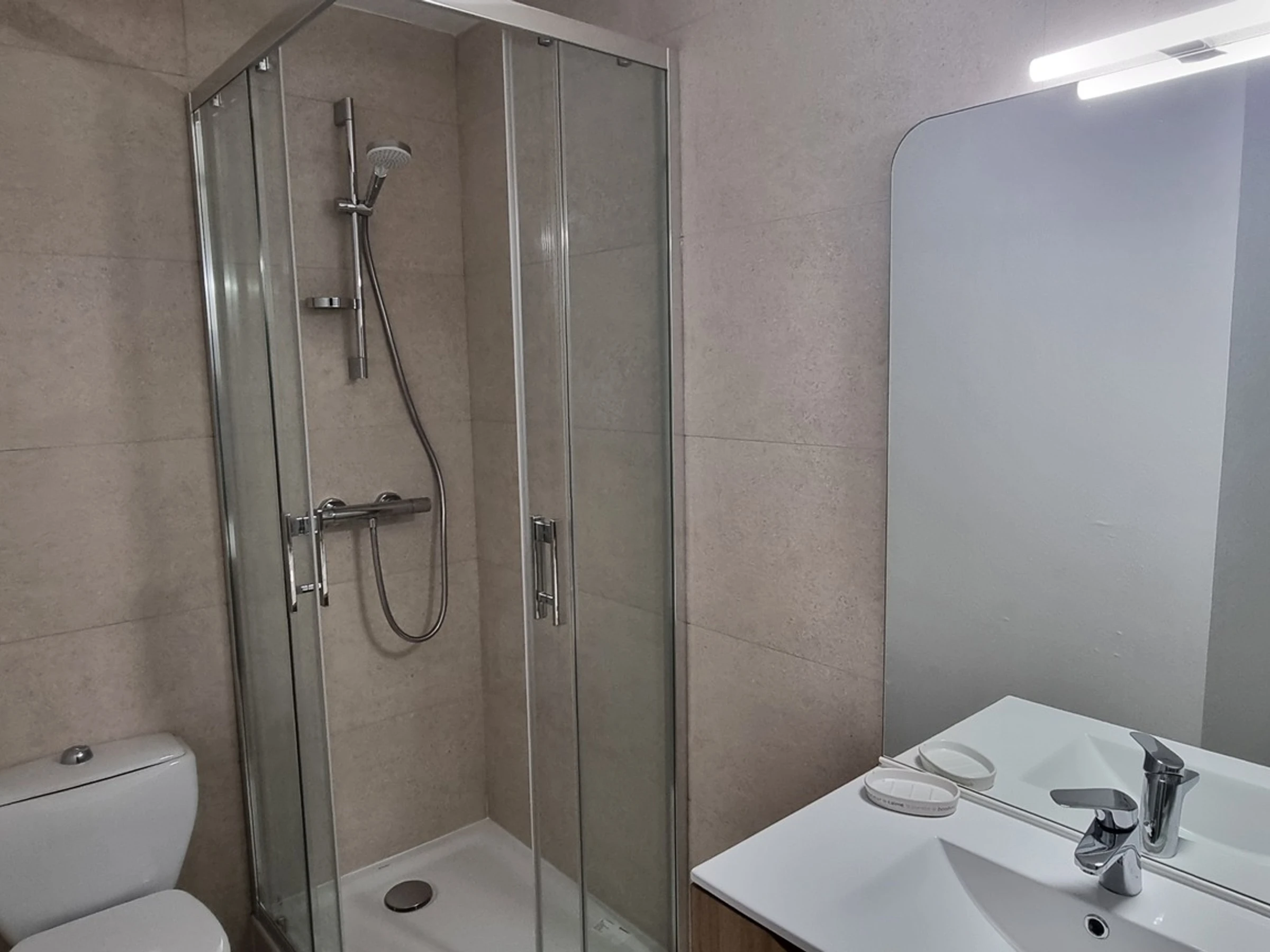 The kitchen, located in the entrance, is equipped with a microwave, 2 ceramic hobs, a fridge top and a dishwasher.