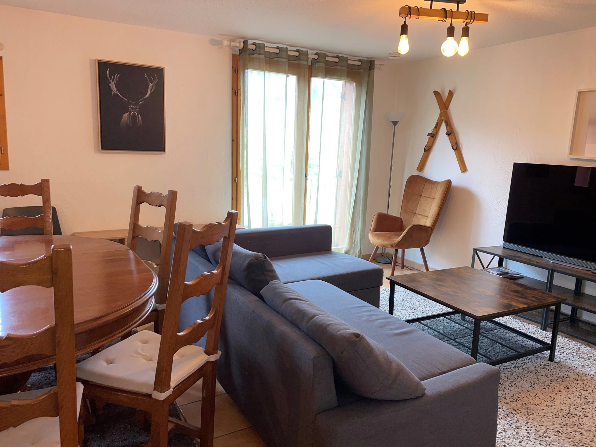 On the ground floor: - A lounge area with corner sofa, 2 armchairs, 1 flat screen TV, exterior access via French window with unobstructed view of the slopes and Plagne Village. –