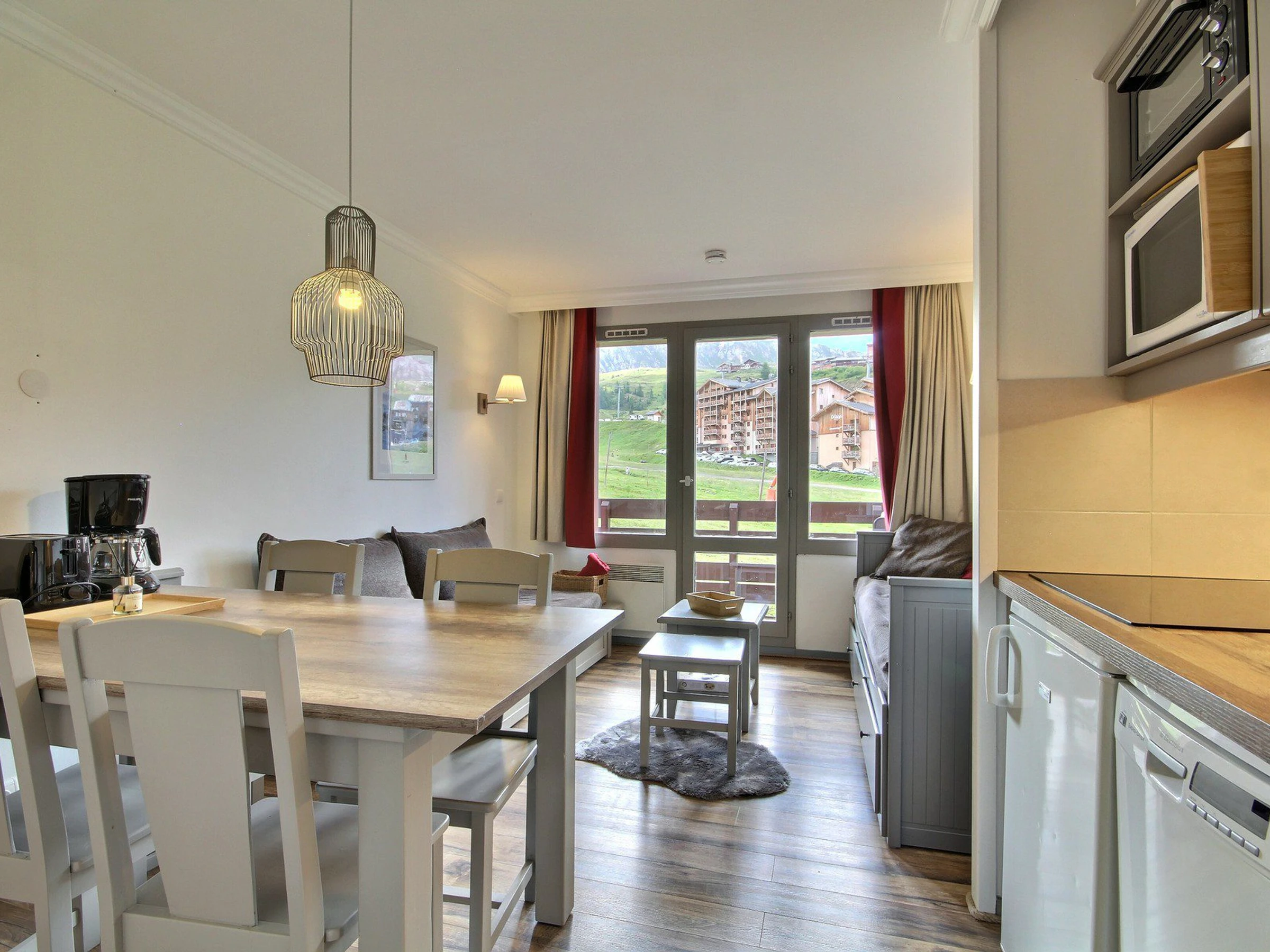 Kitchenette open to the living room: ceramic hob, oven, refrigerator, dishwasher, microwave