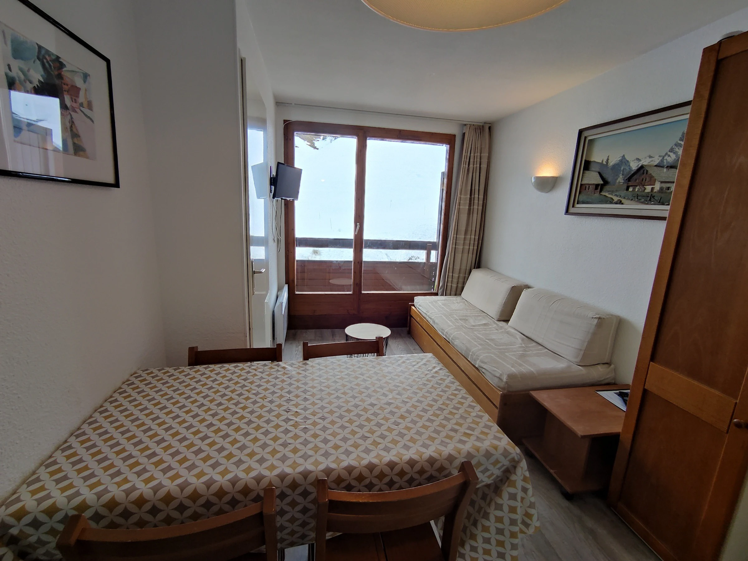 Located in residence Les Drus in Plagne Soleil. Ski in ski out studio with a little double room for 4 people, 26m², 3rd floor with balcony and view on the mountain.