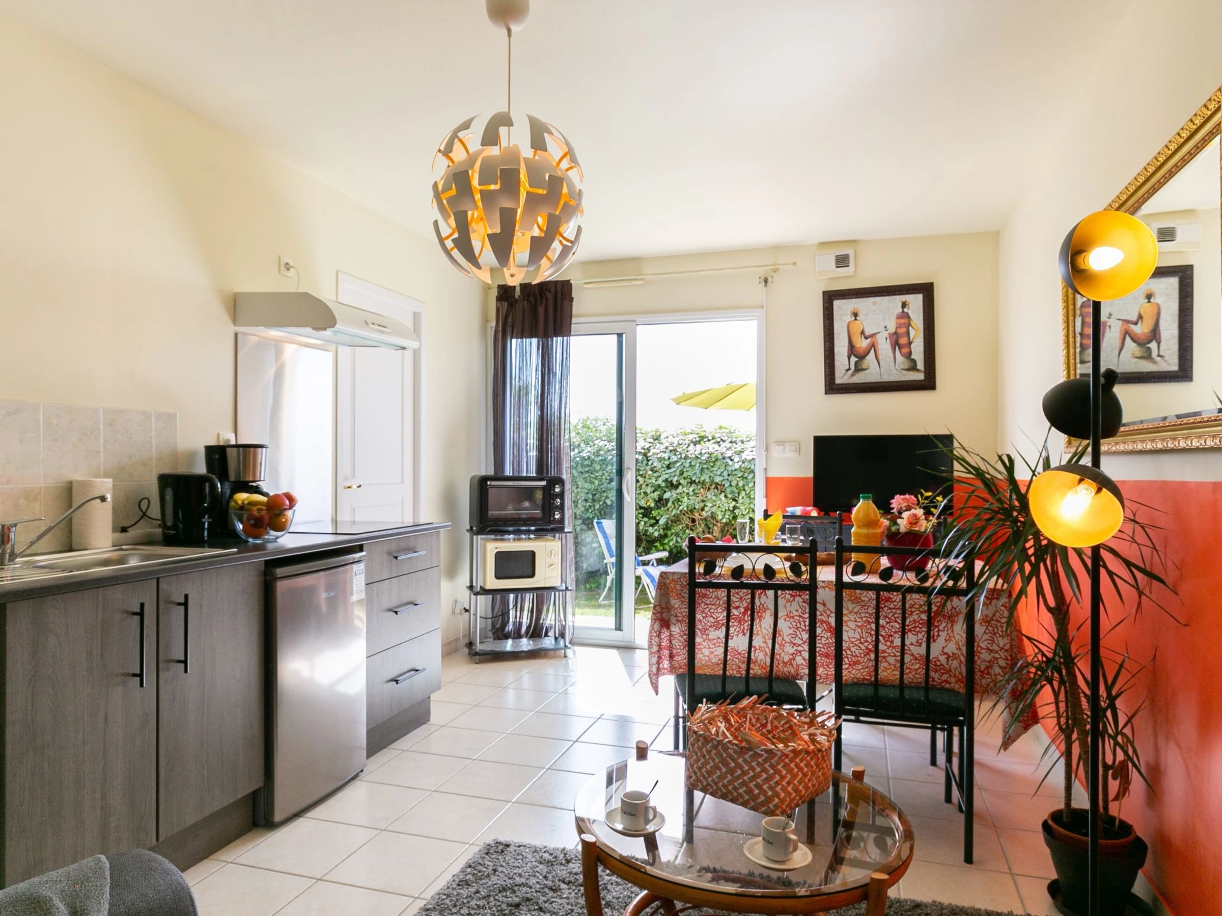 "Studio coquet", 1-room studio 30 m2, on the ground floor. Practical and cosy furnishings: living/dining room with 1 french bed (140 cm, length 190 cm), TV (flat screen). Exit to the patio. Kitchenette (mini-oven, oven, 4 ceramic glass hob hotplates, toaster, kettle, microwave, electric coffee machine). Shower/WC. Electric heating. Small patio 20 m2. Terrace furniture, barbecue (portable), deck chairs (2). Facilities: washing machine, iron. Internet (WiFi, free). Please note: non-smoking house. Maximum 1 small pet/ dog allowed. Smoke alarm.